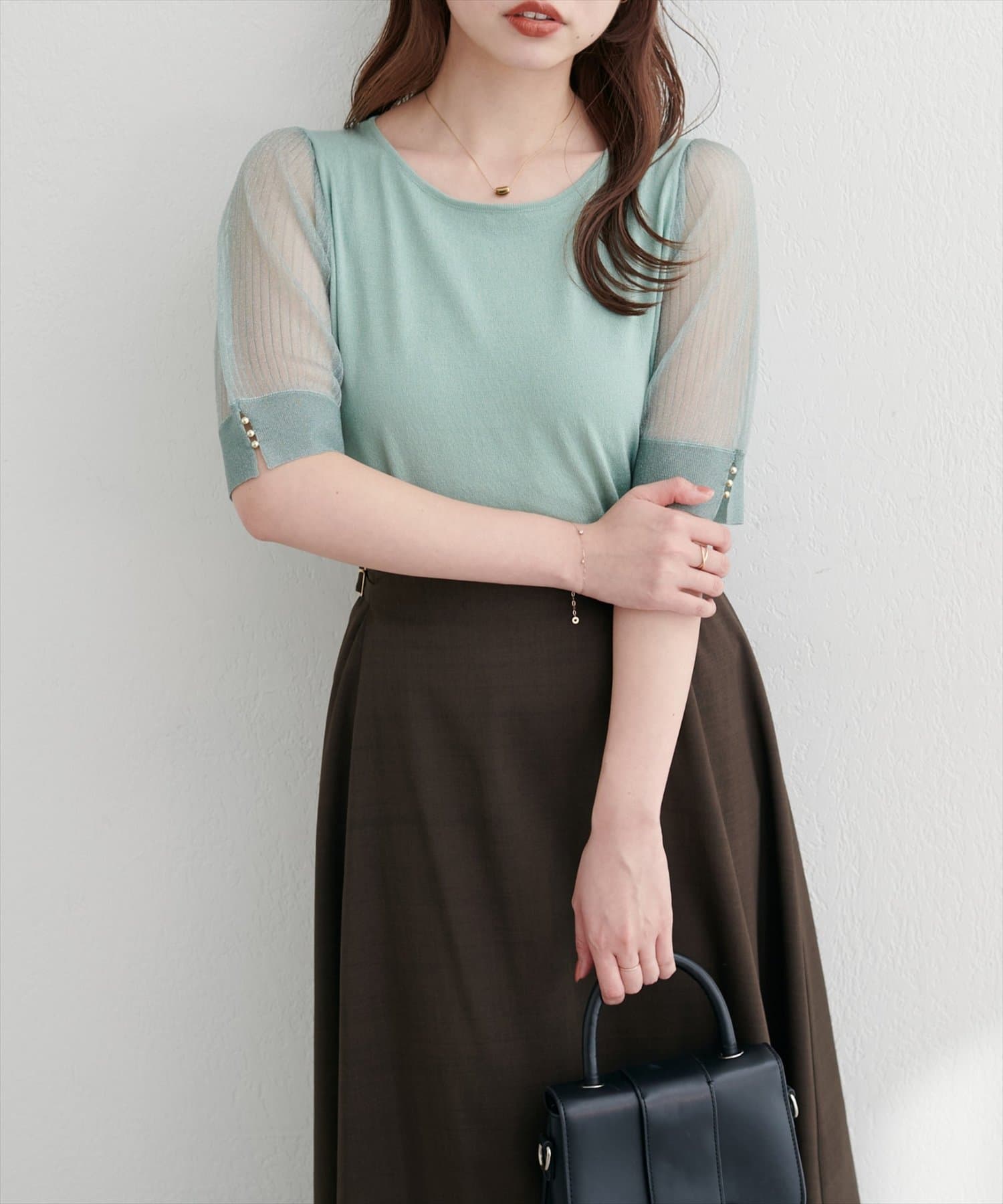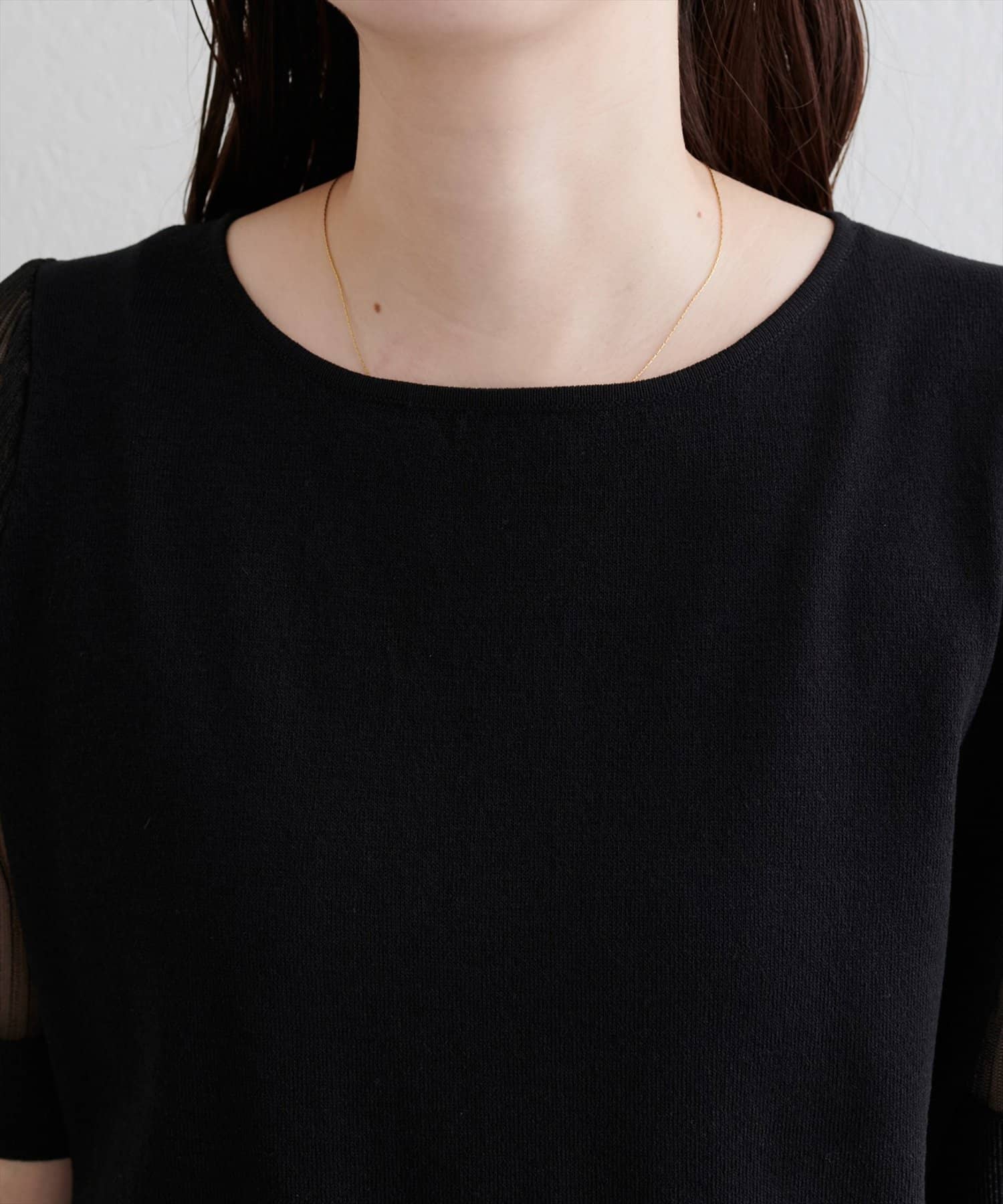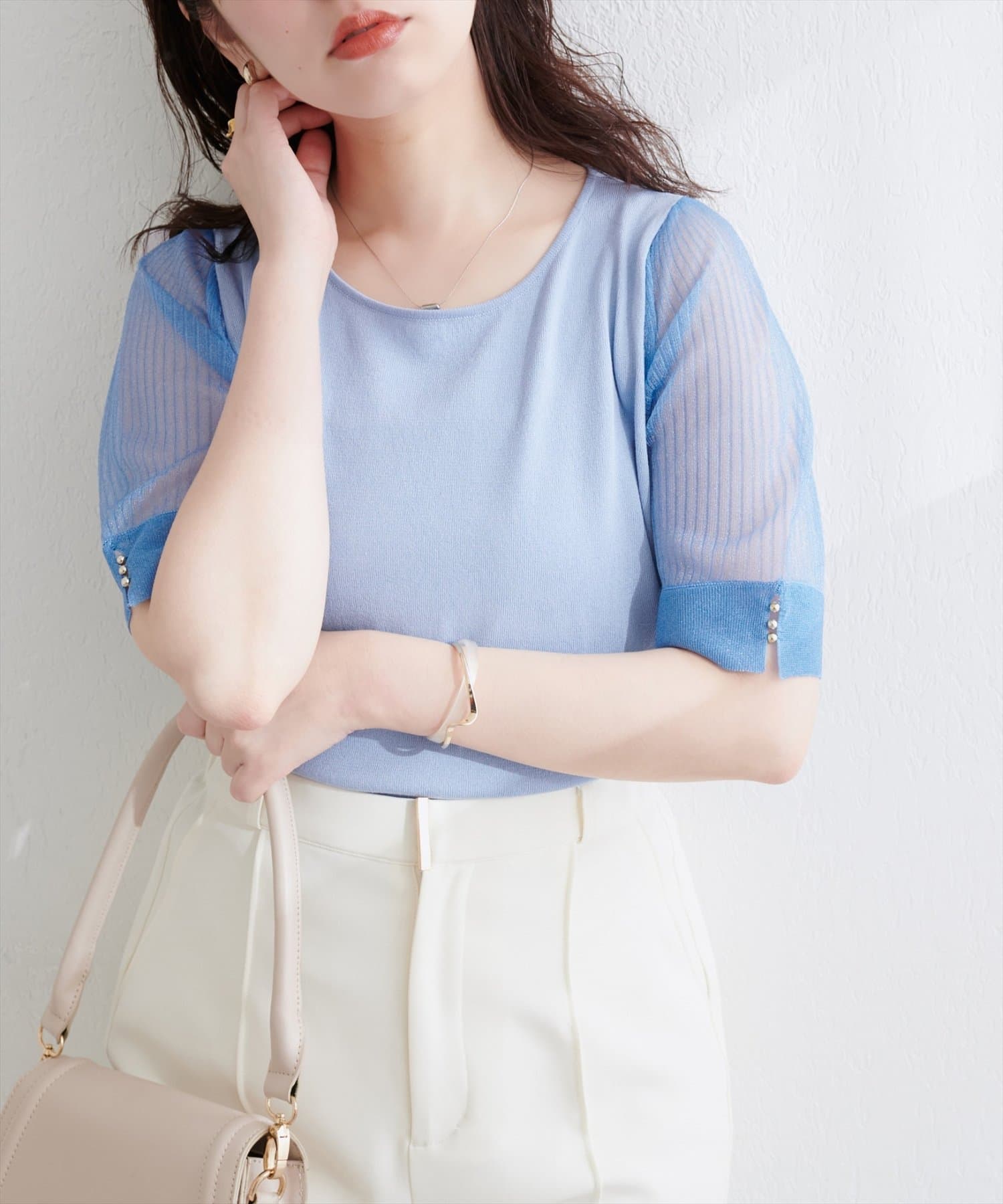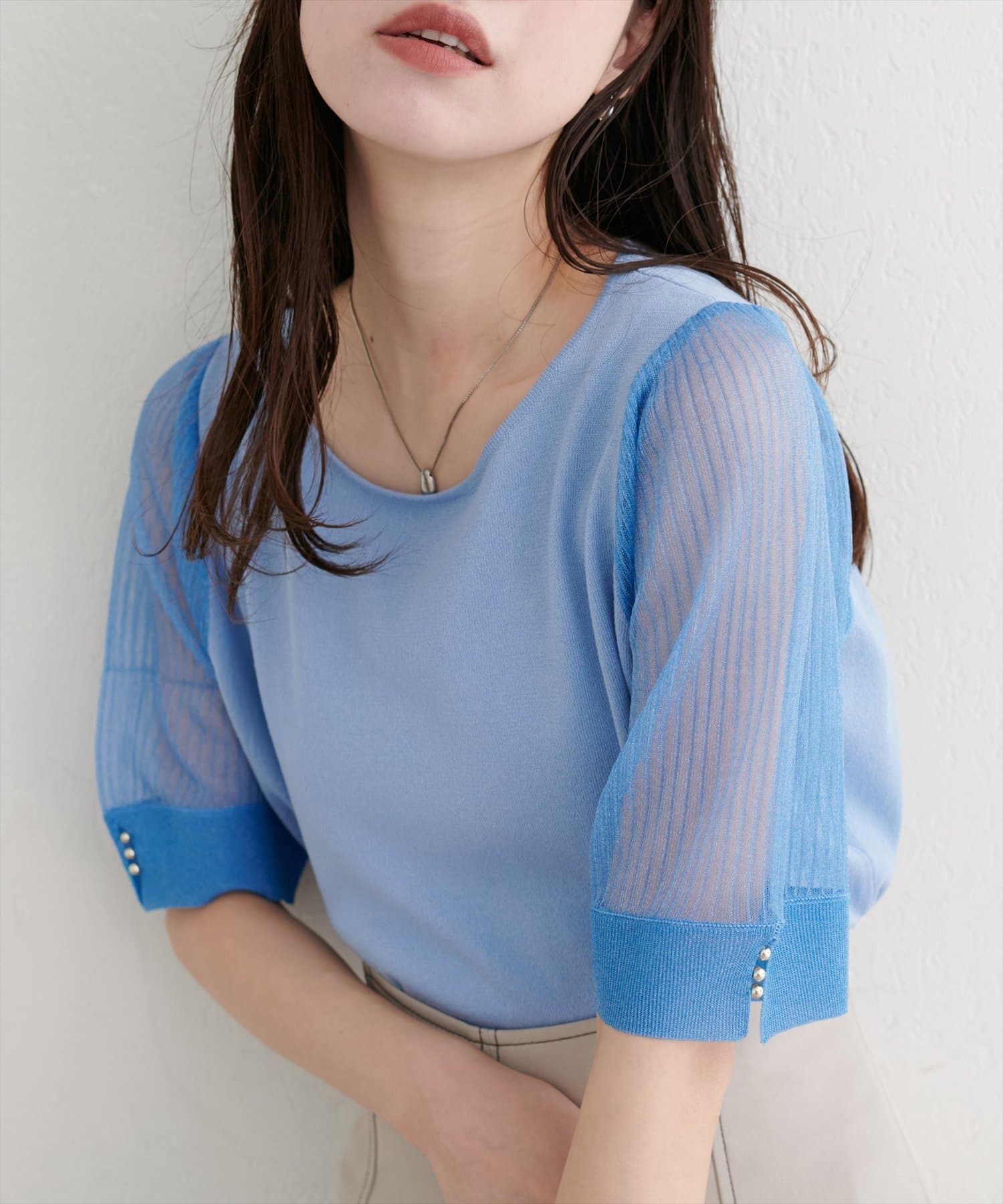 繊細なシアー素材の袖が、女性らしさを引き立てるニットトップス。