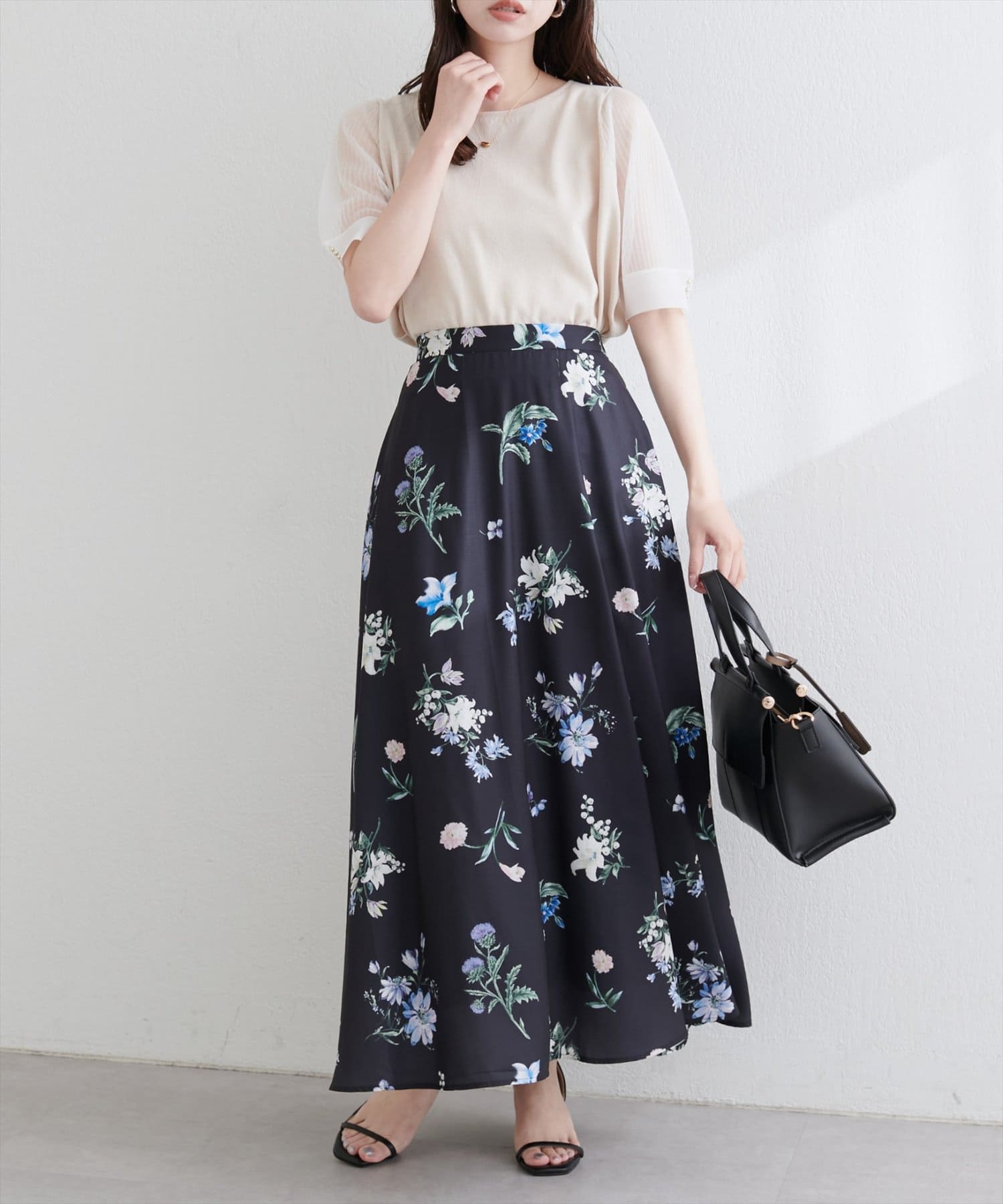 花柄やレースのスカートと合わせて、とことんフェミニンに。パンプスやサンダルをプラスして軽やかに。
