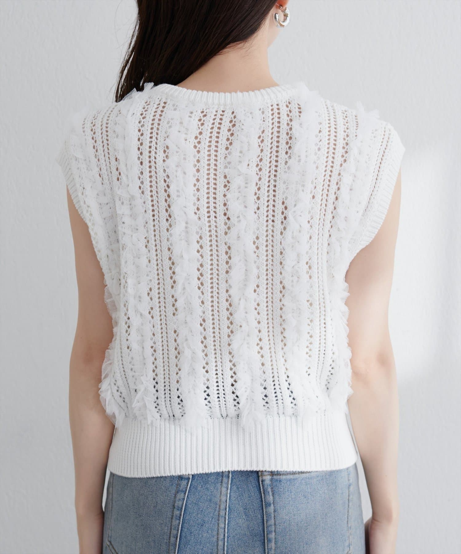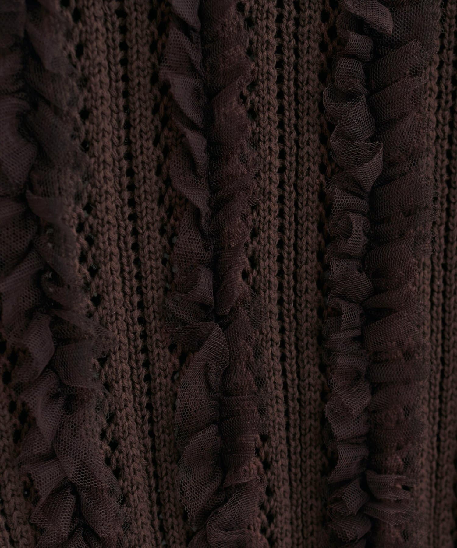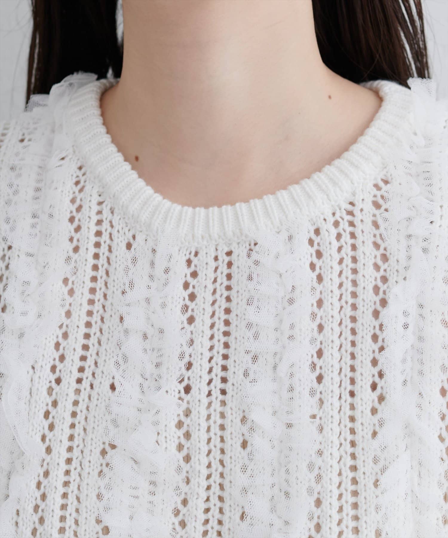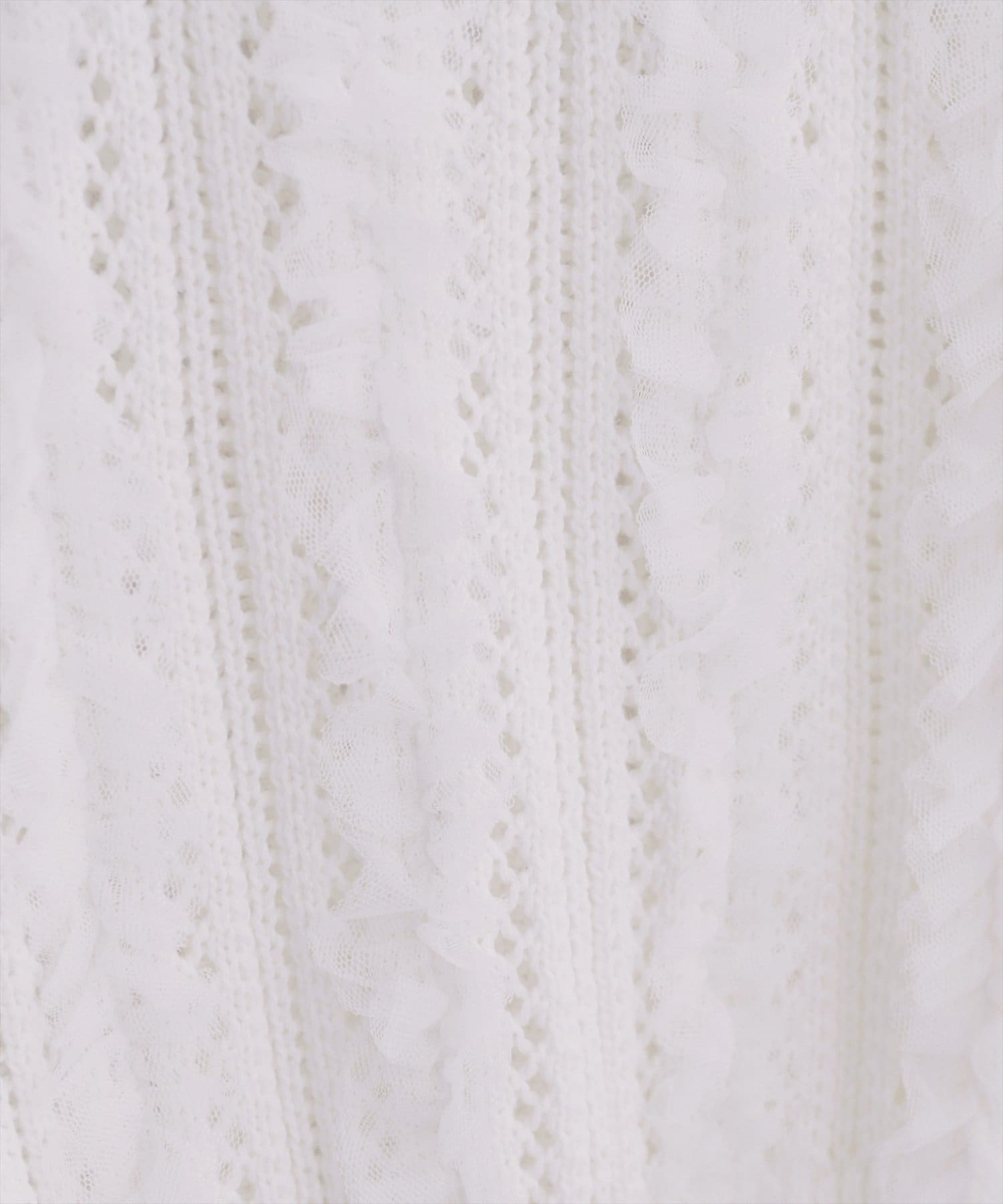 透かし柄の合間にあしらわれたチュールフリルが、フェミニンなアクセント。