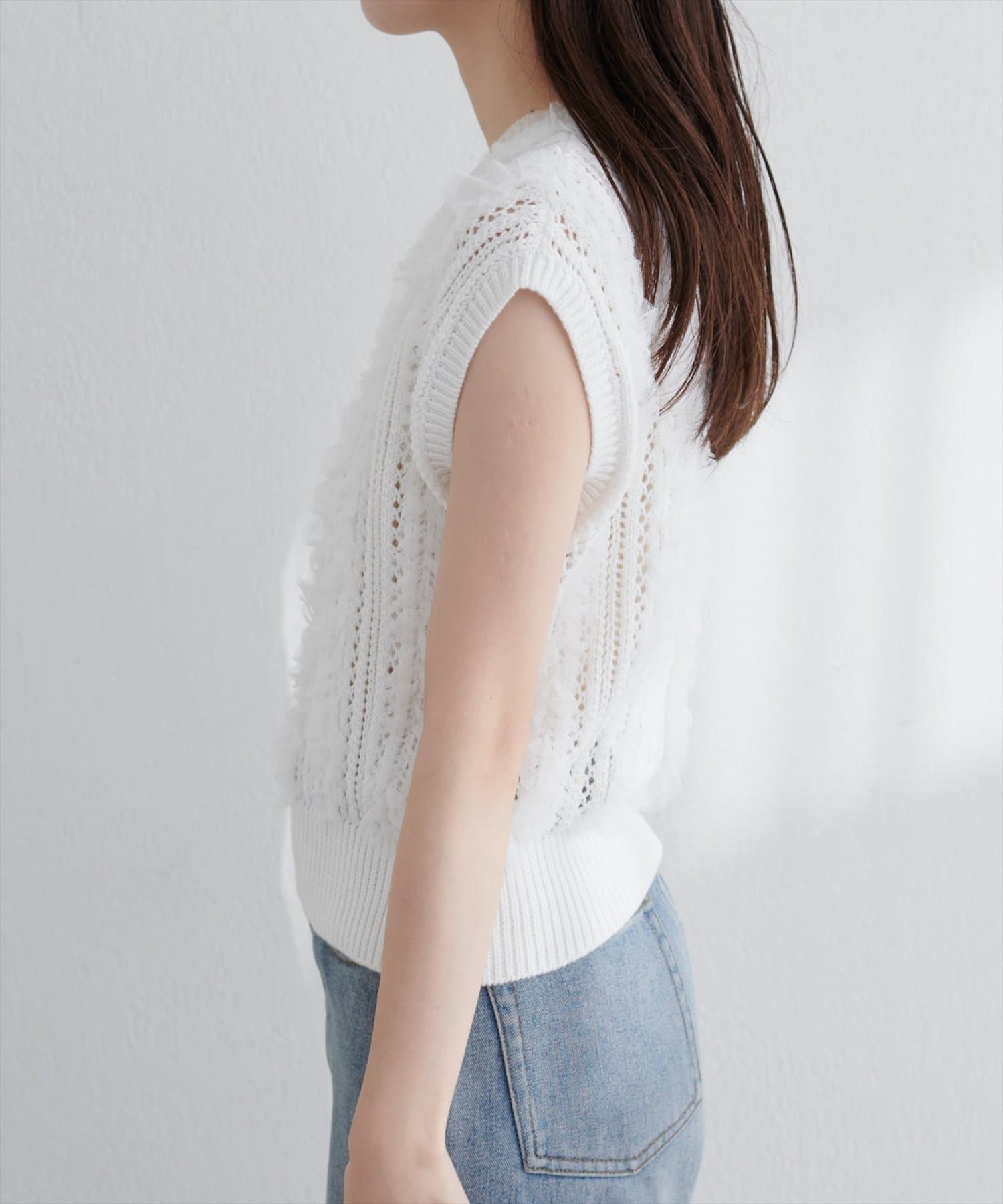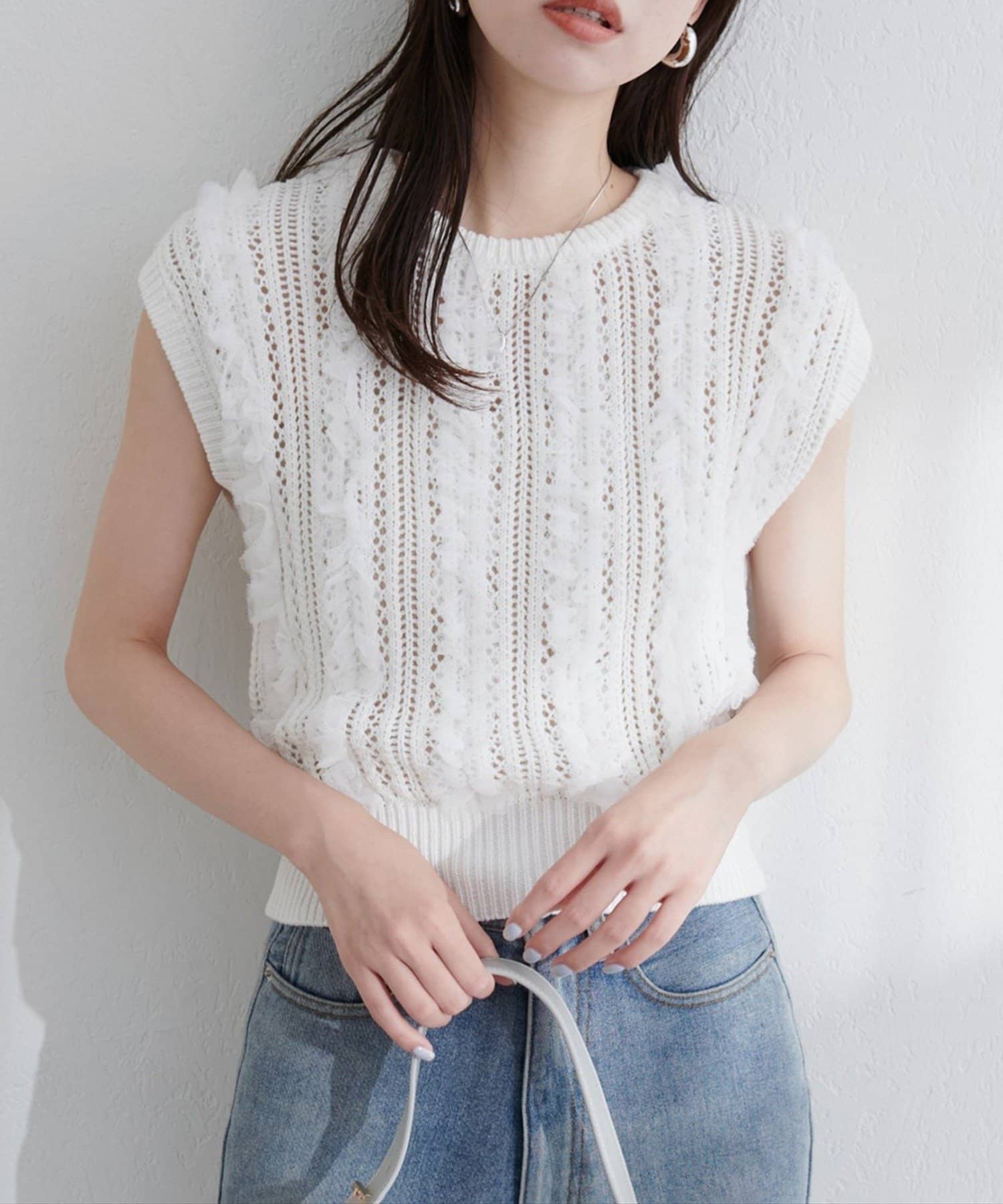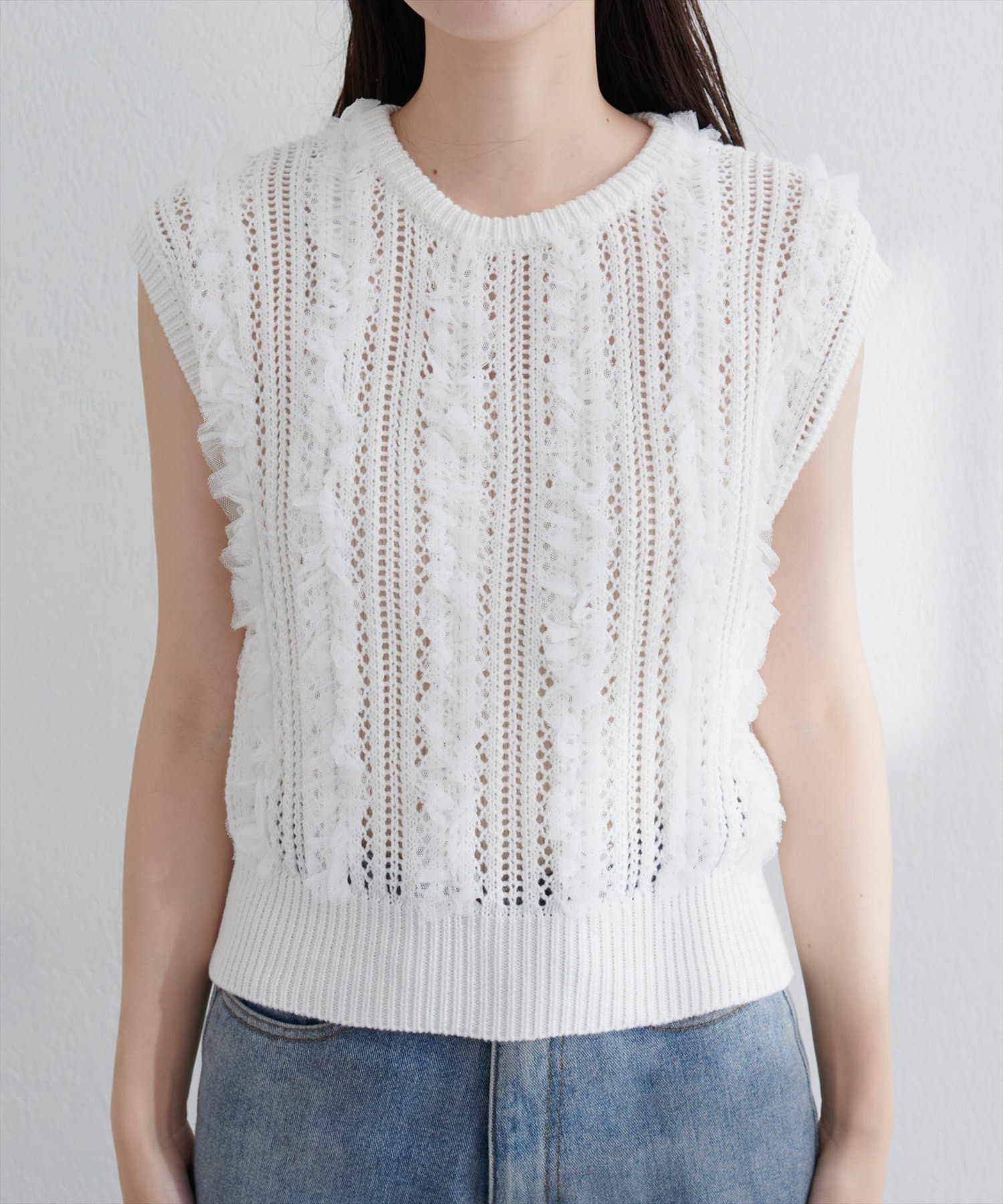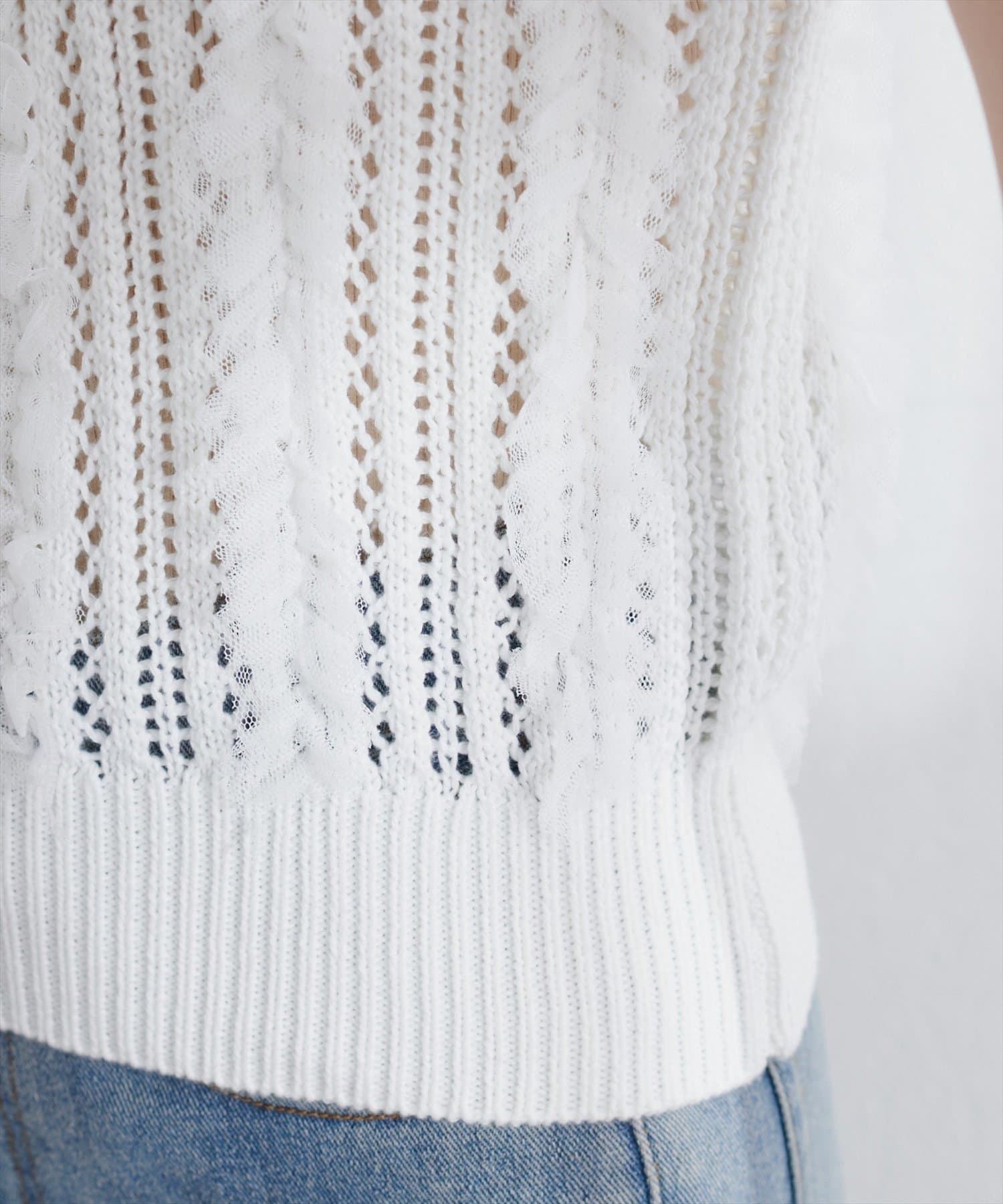 透かし柄の合間にあしらわれたチュールフリルが、フェミニンなアクセント。
