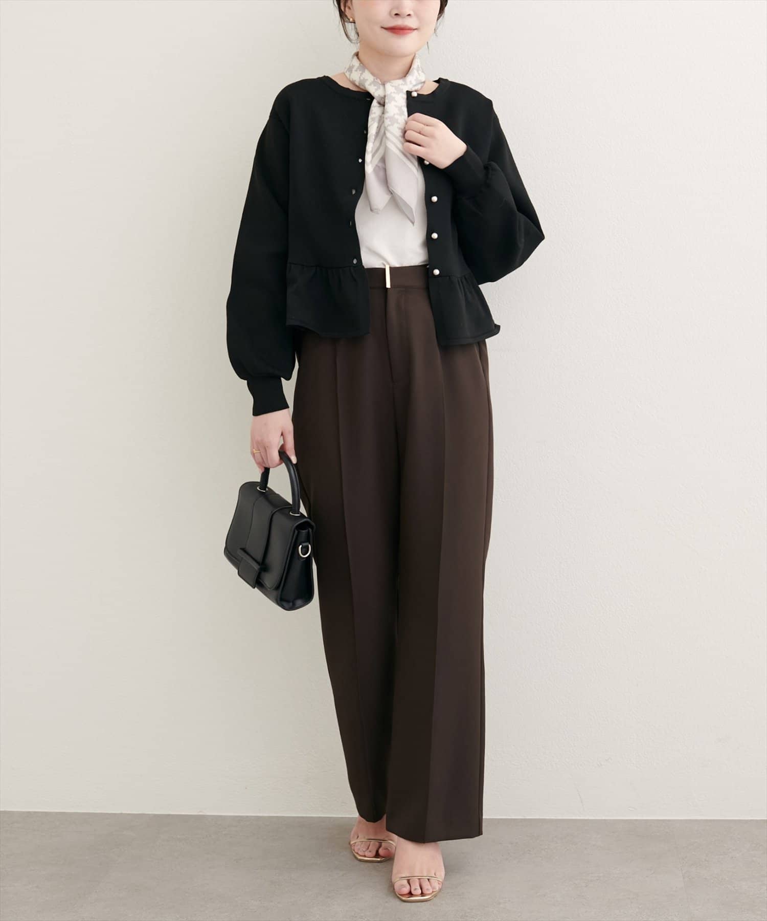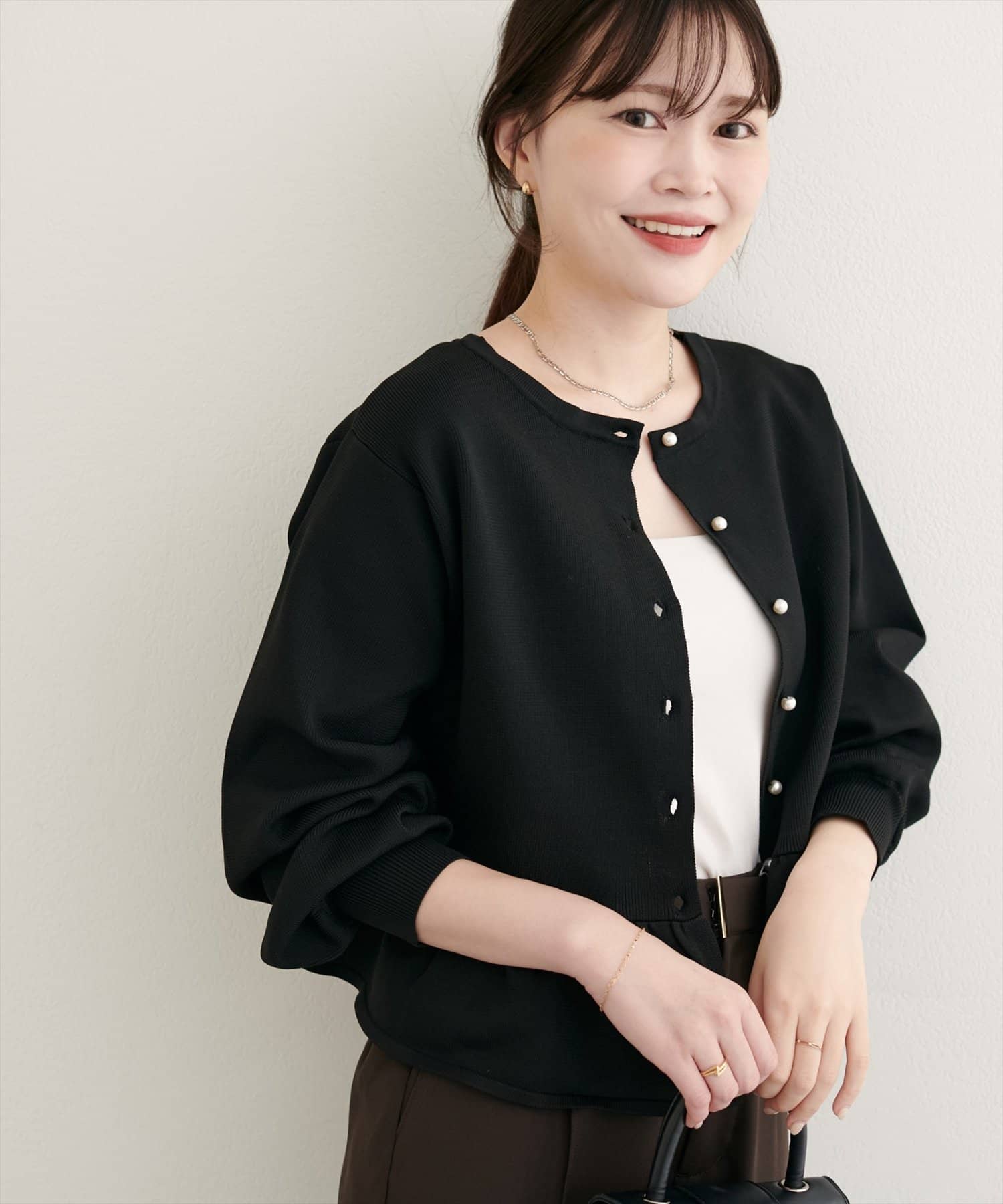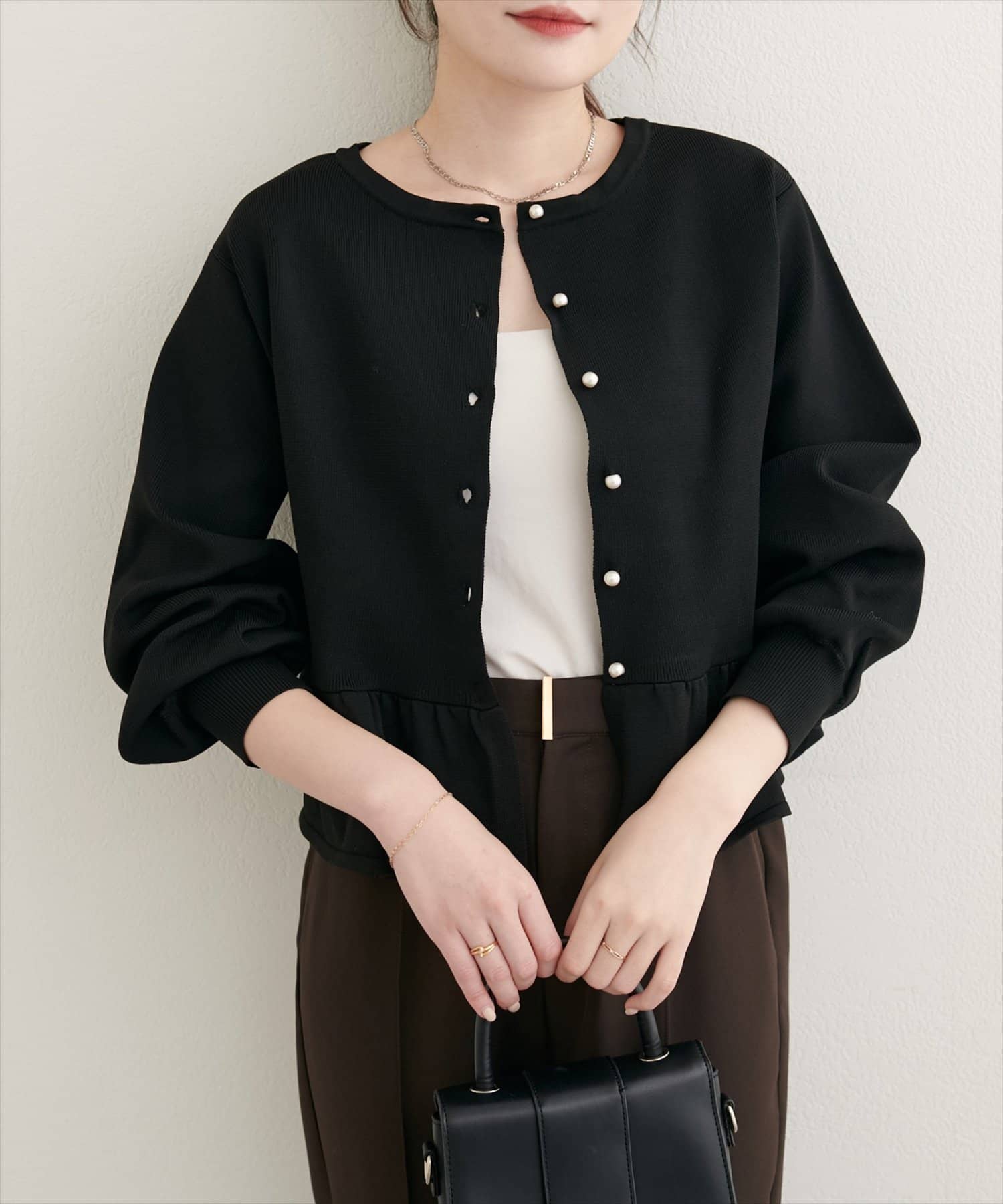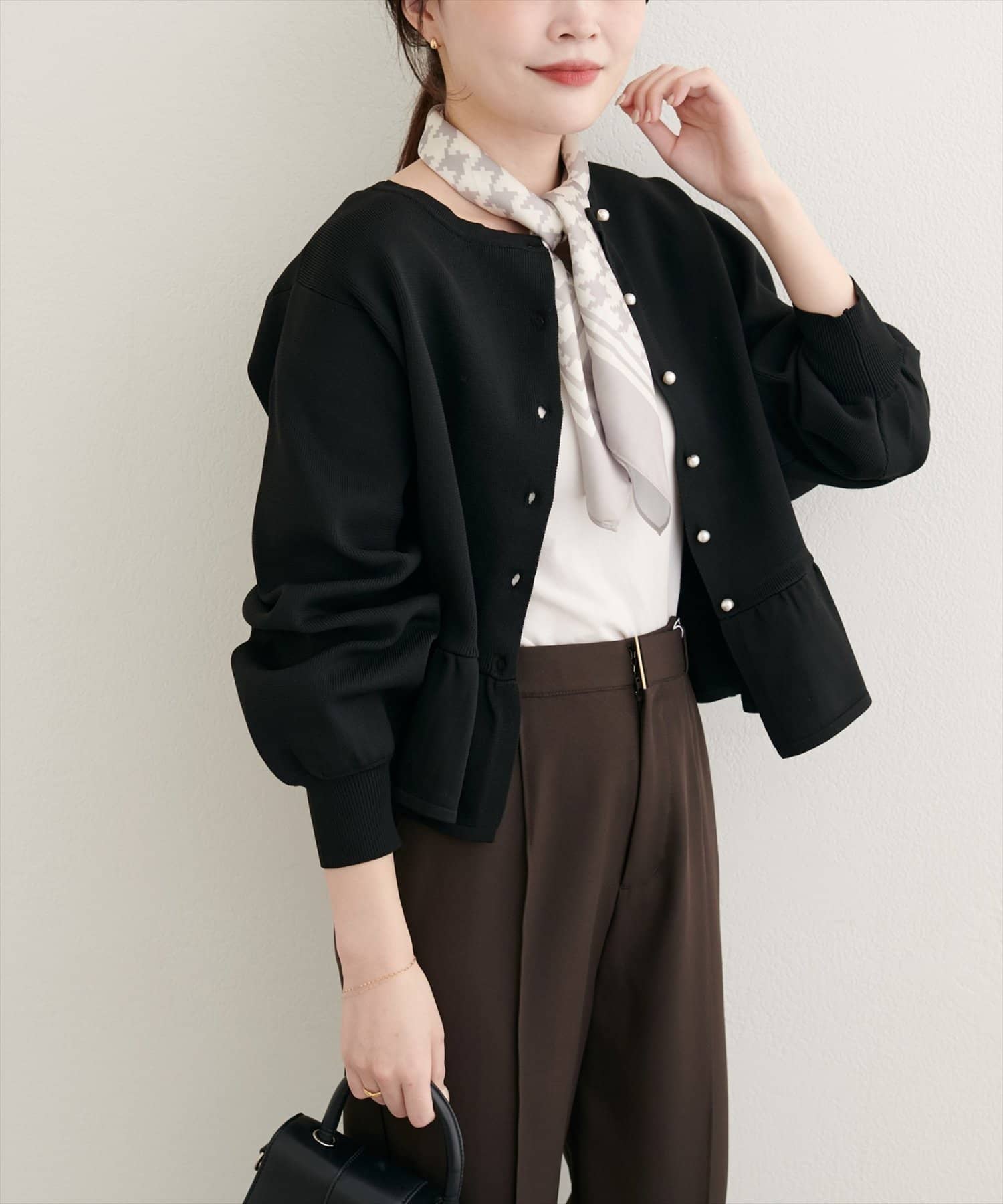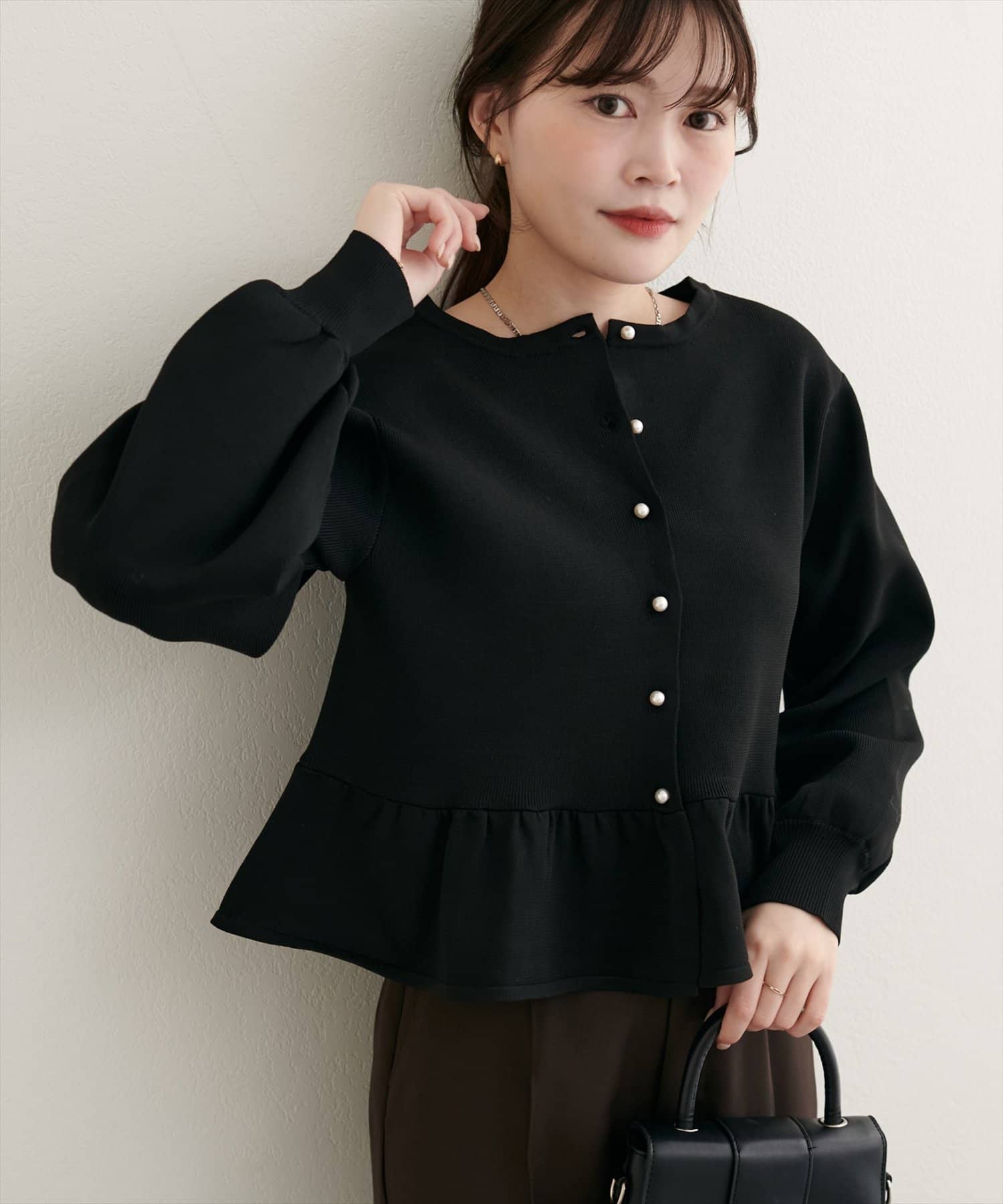 女性らしさを引き立てるペプラムカーディガン。シンプルなデザインながらも、着るだけで華やかな印象を与えてくれる、