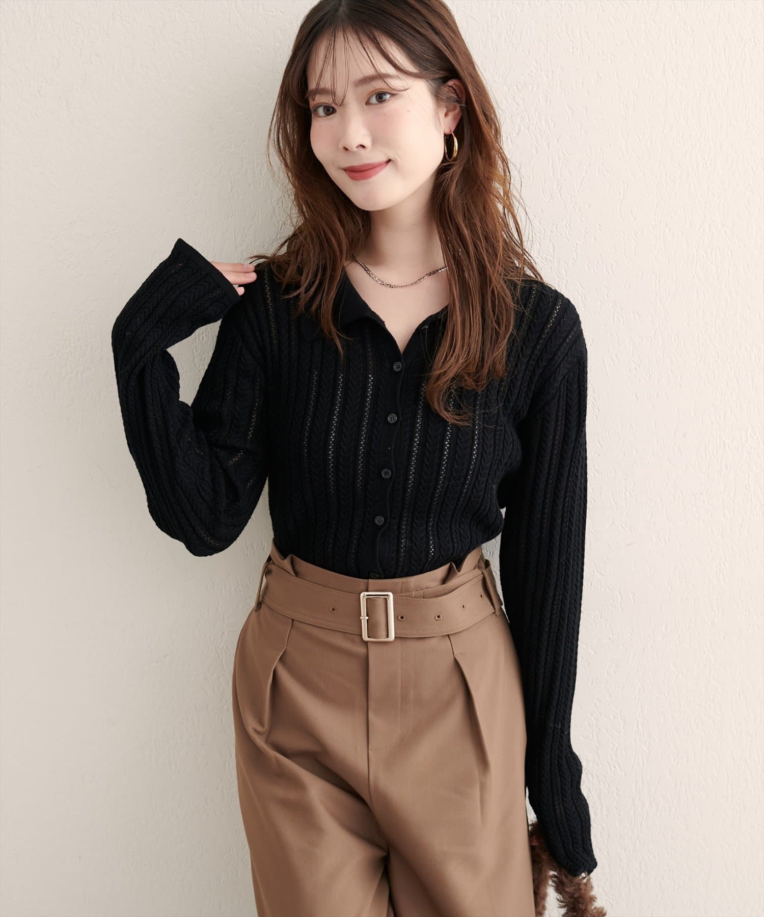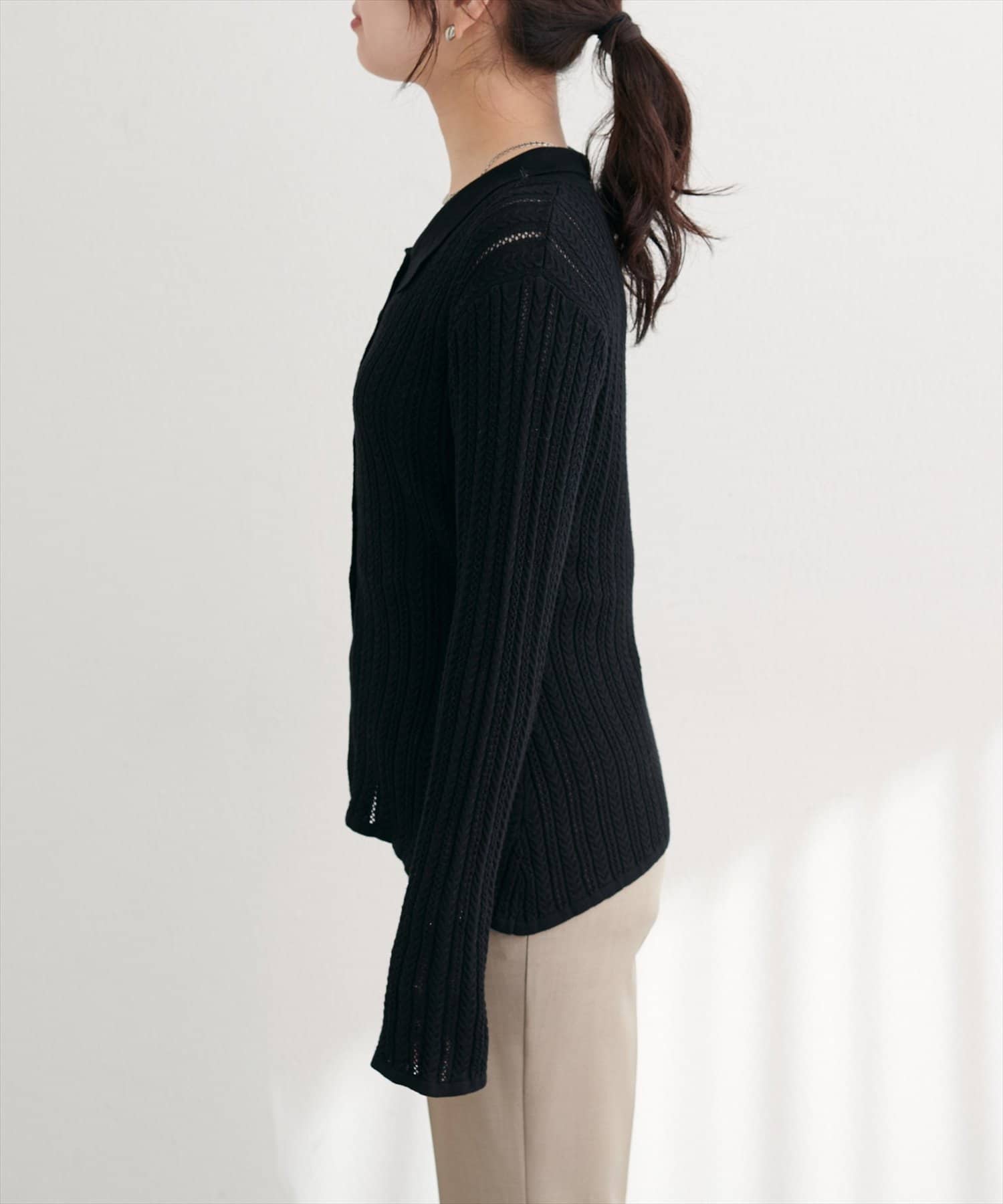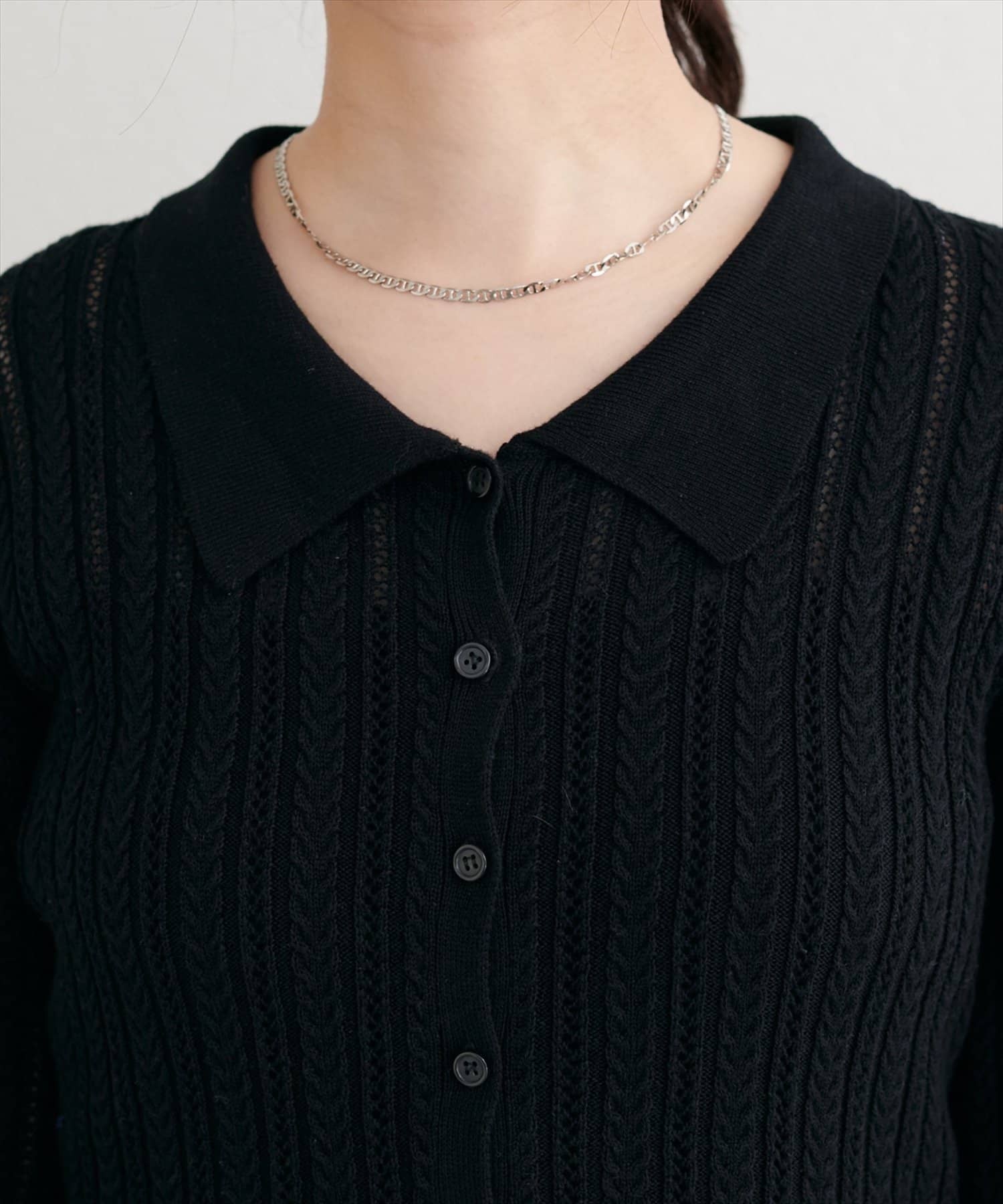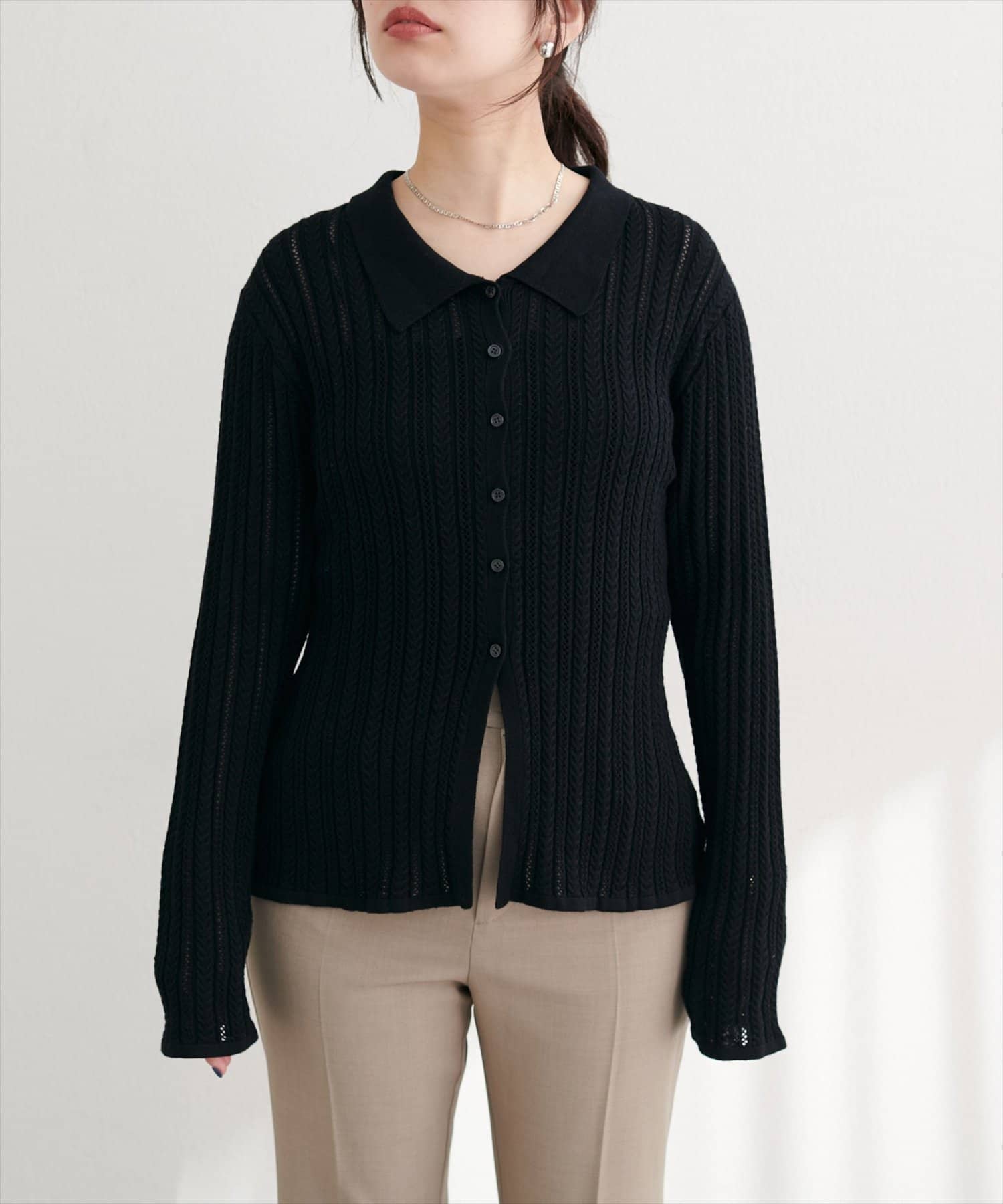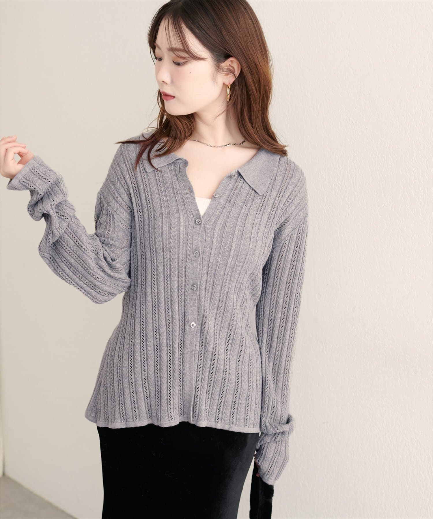 【WEB限定】透かし×細ケーブル衿付きカーデ