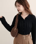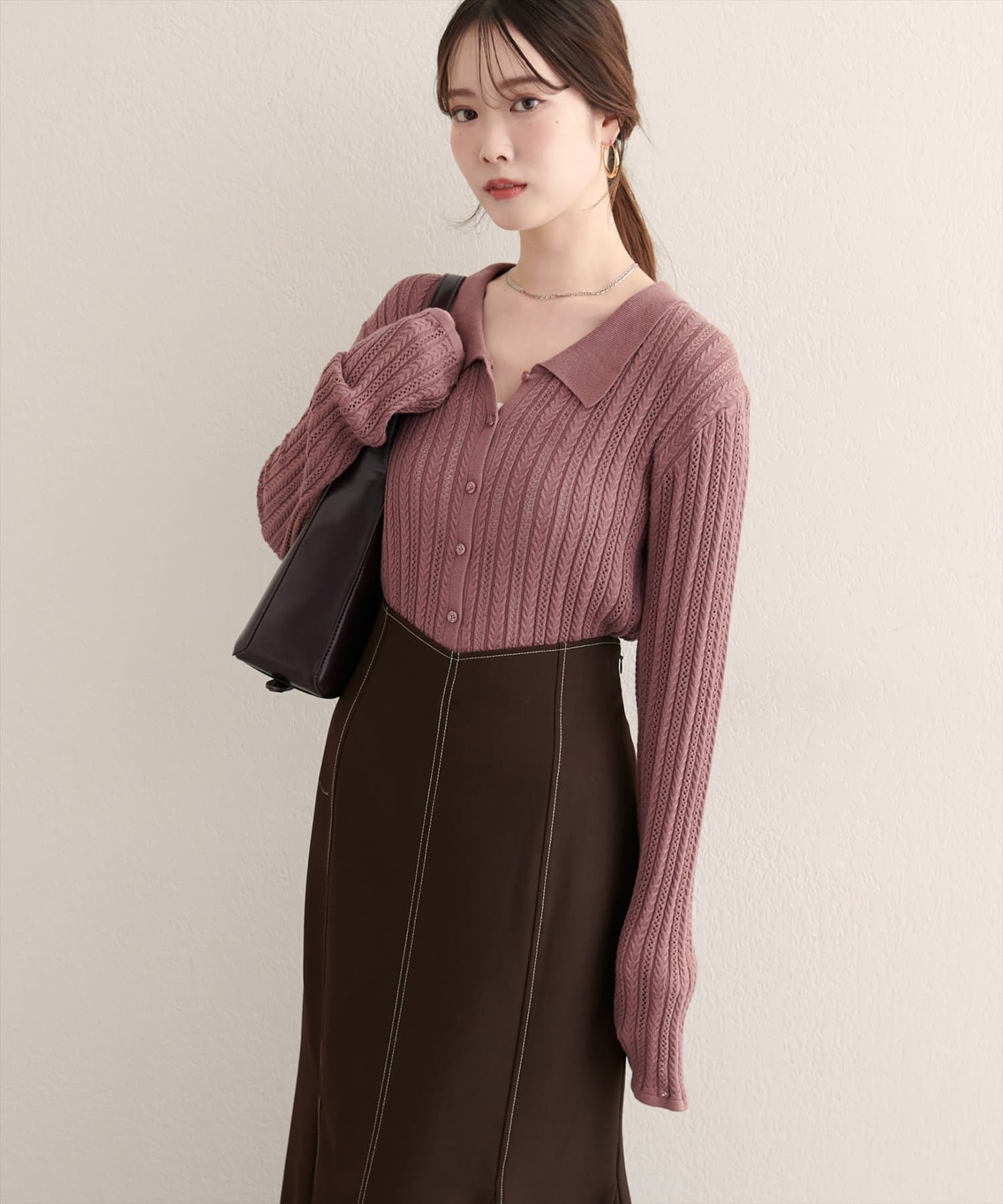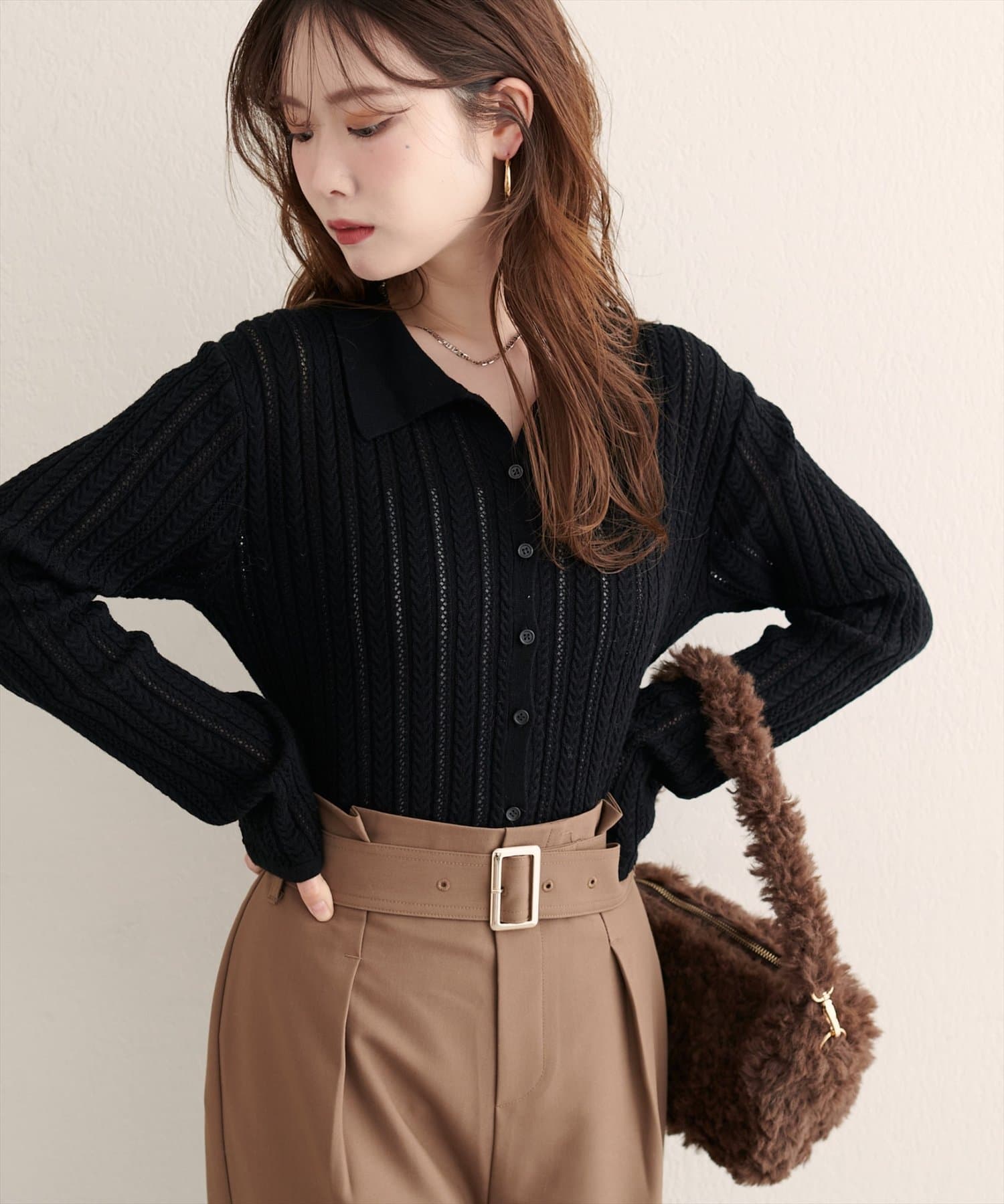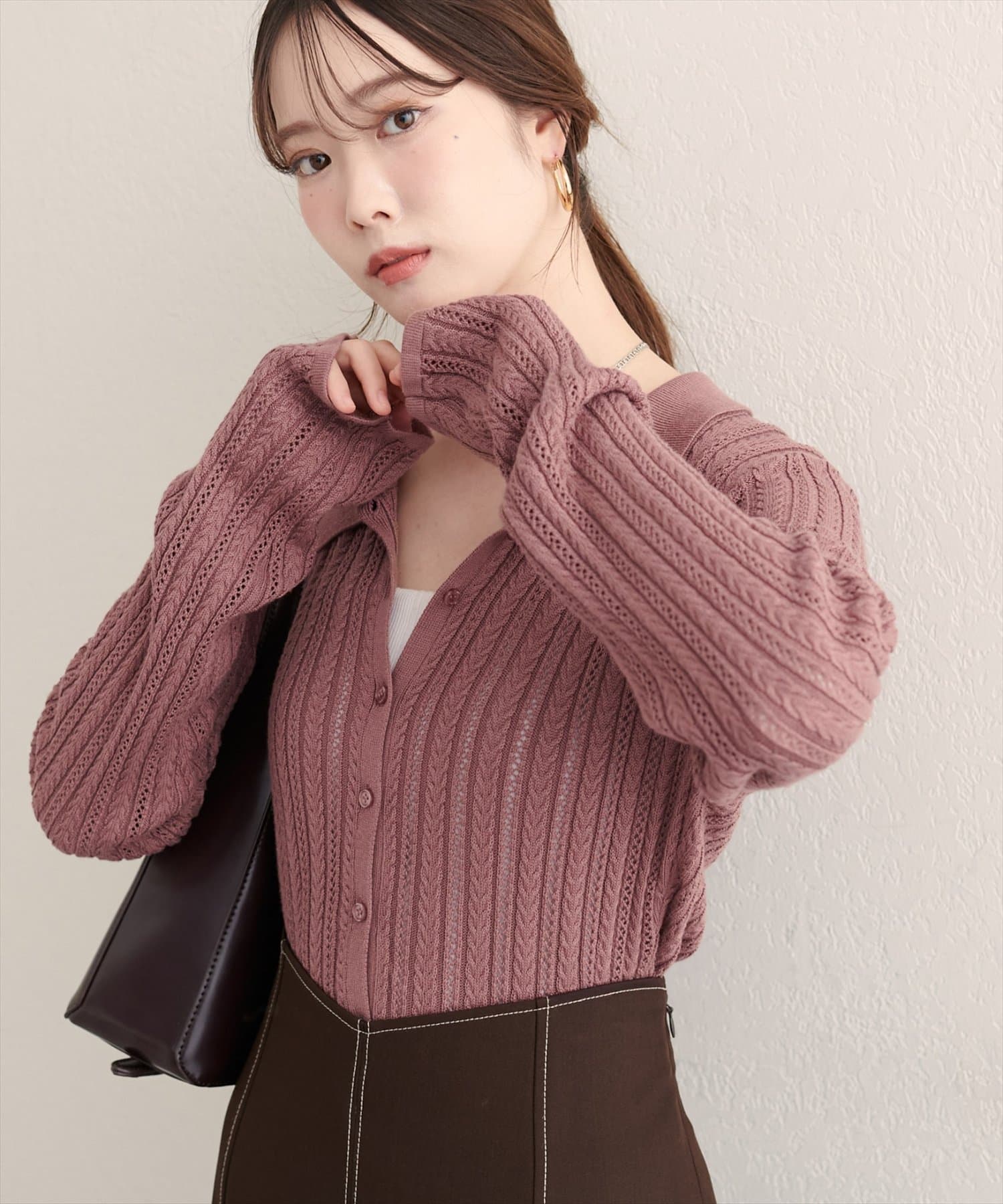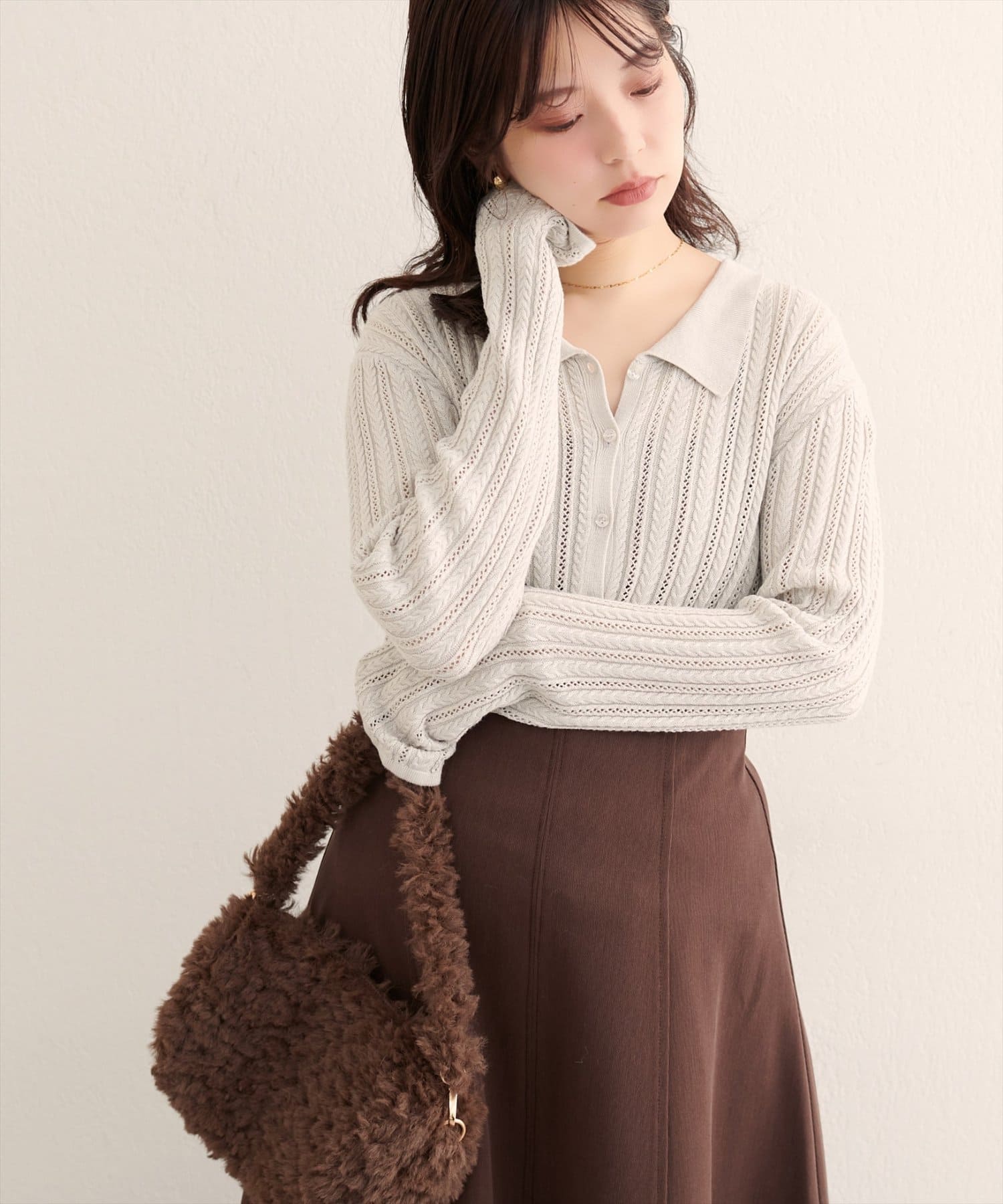 【WEB限定】透かし×細ケーブル衿付きカーデ