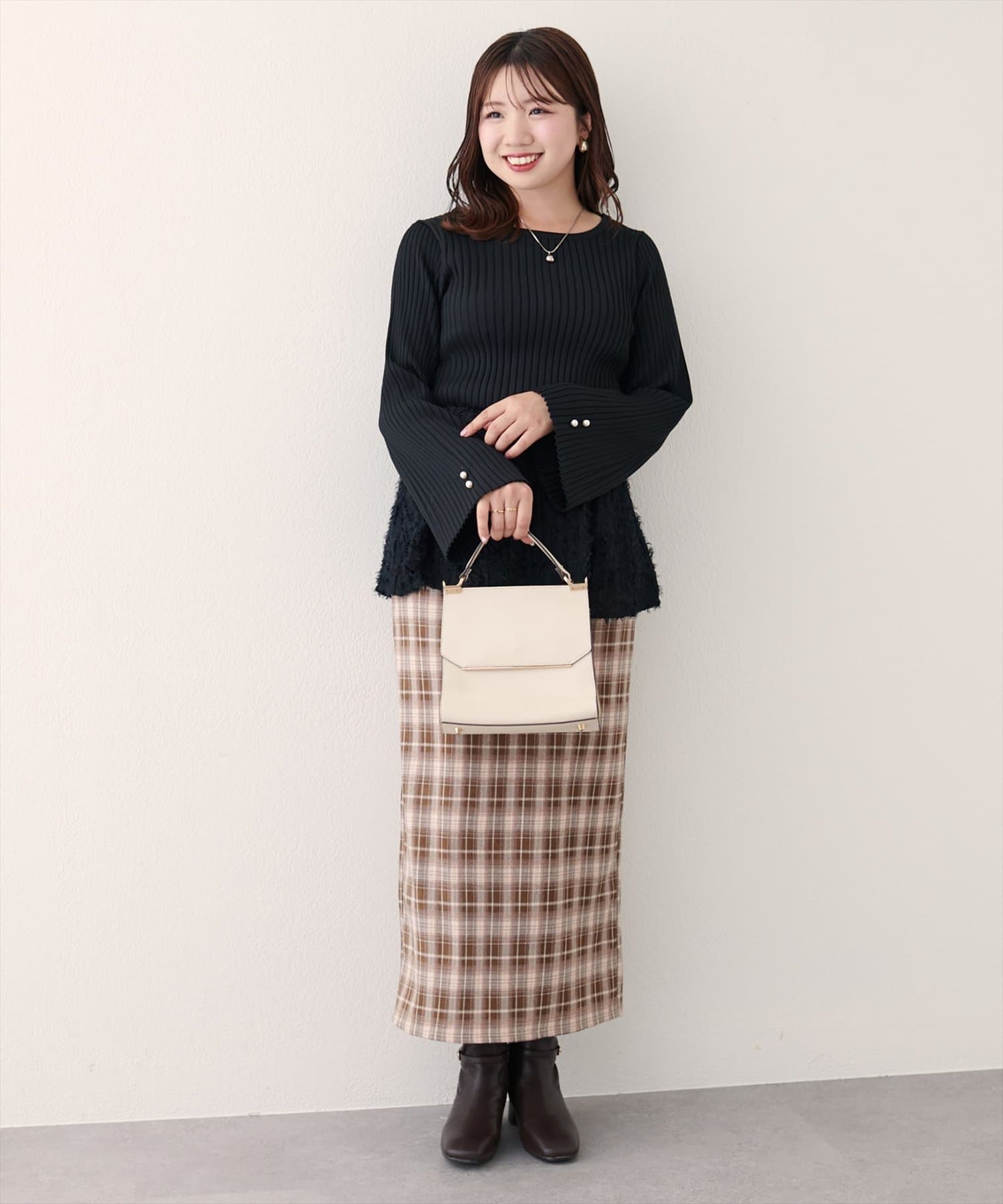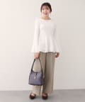 ペプラムとメリハリをつけるために、ボトムはスッキリしたシルエットの出るタイトスカートやパンツがオススメ。