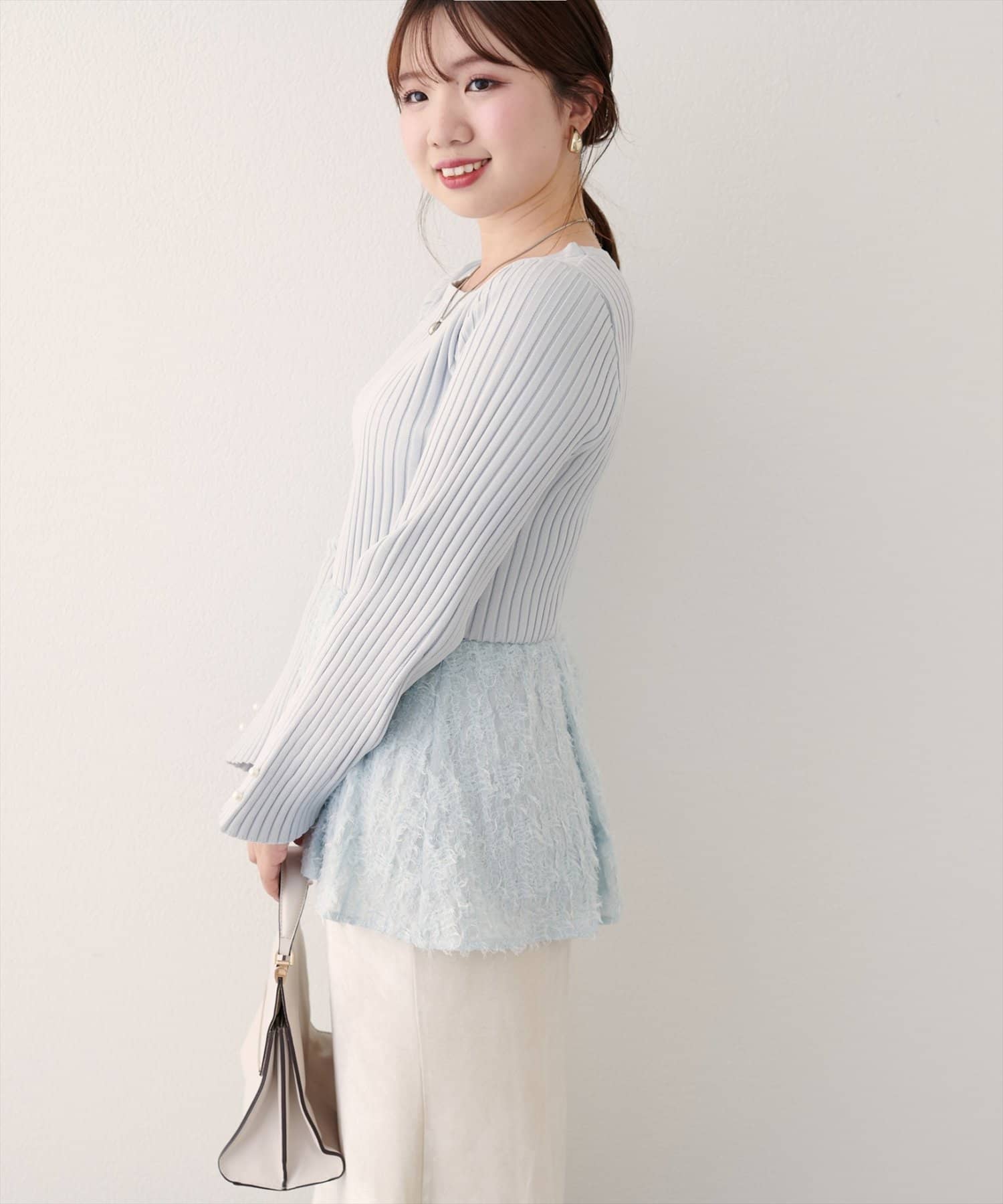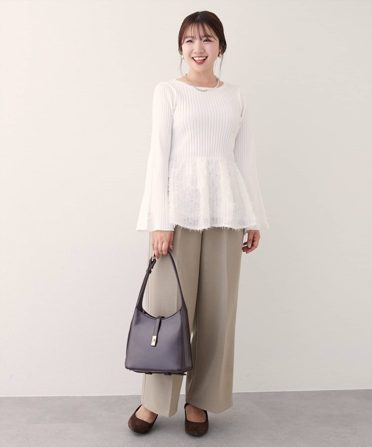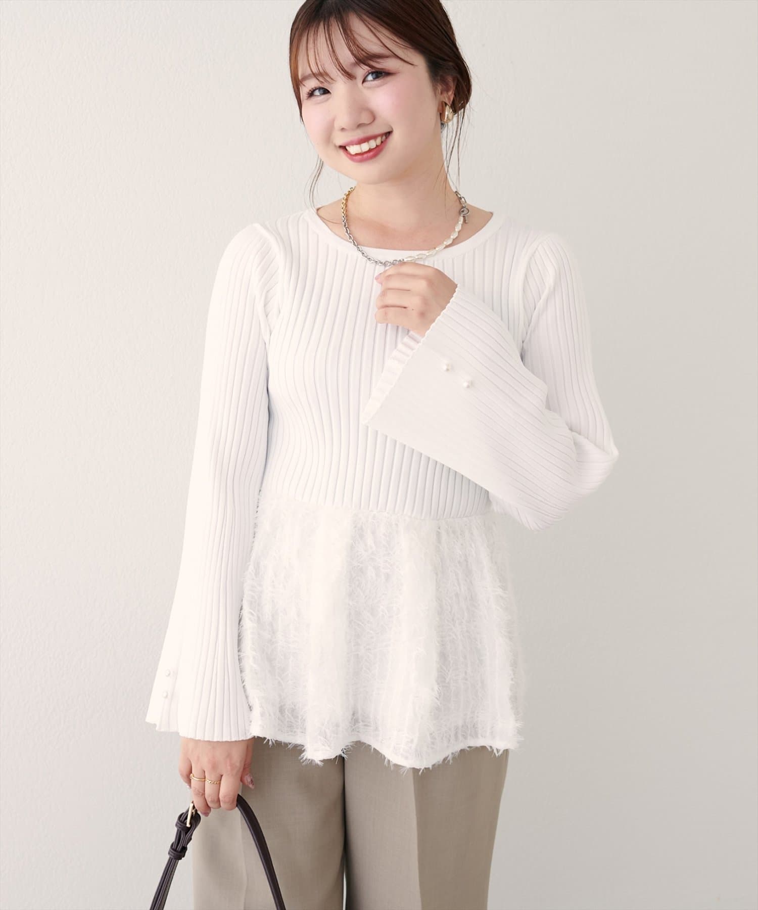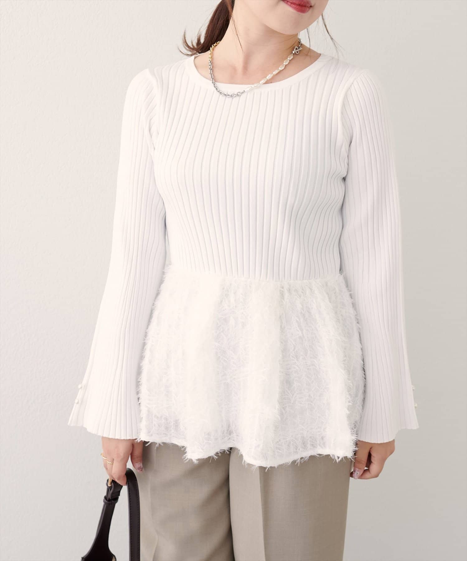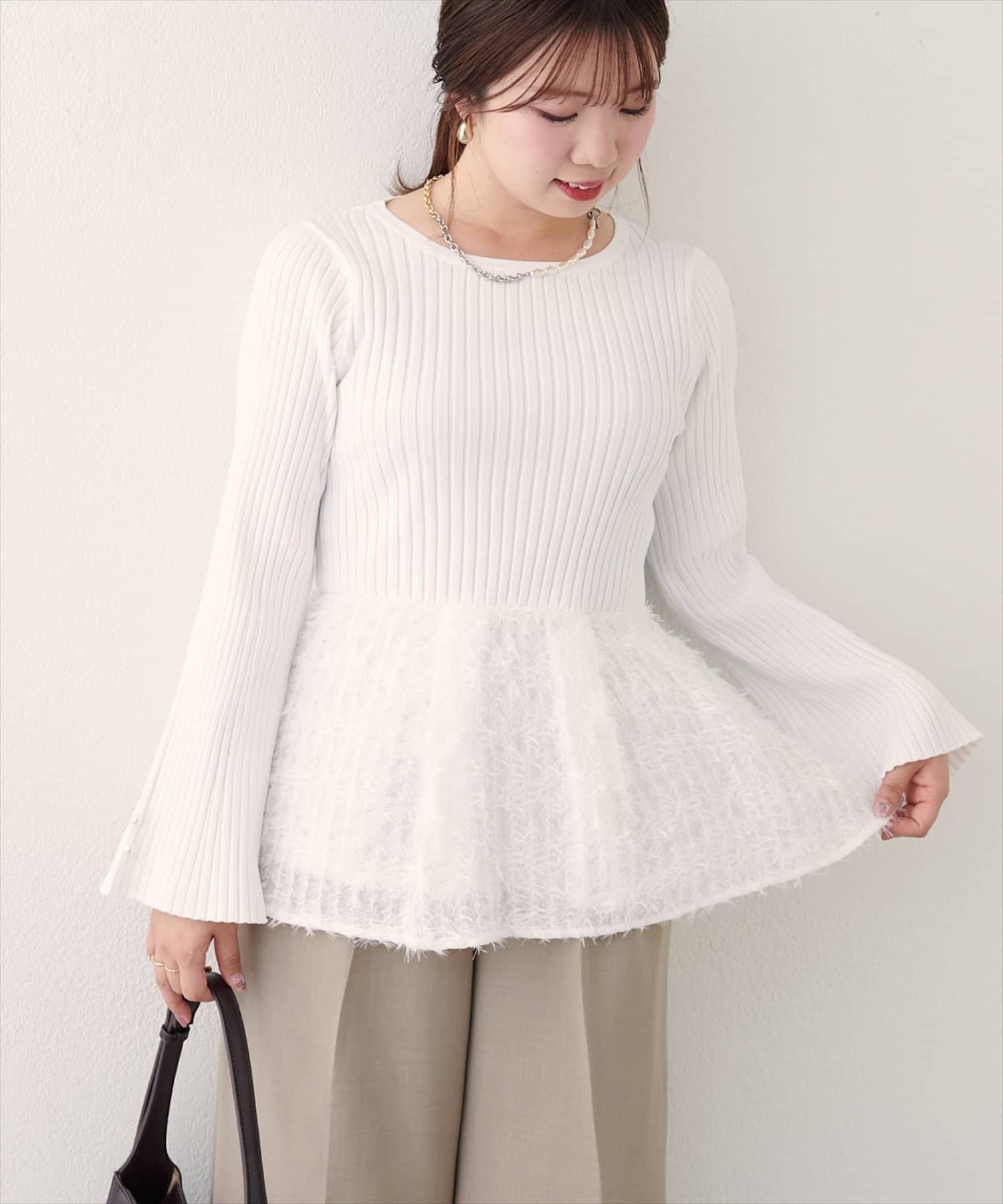 体型カバーの叶うぺプラムは、大人フェミニンにきまる毛足のある素材を使用。