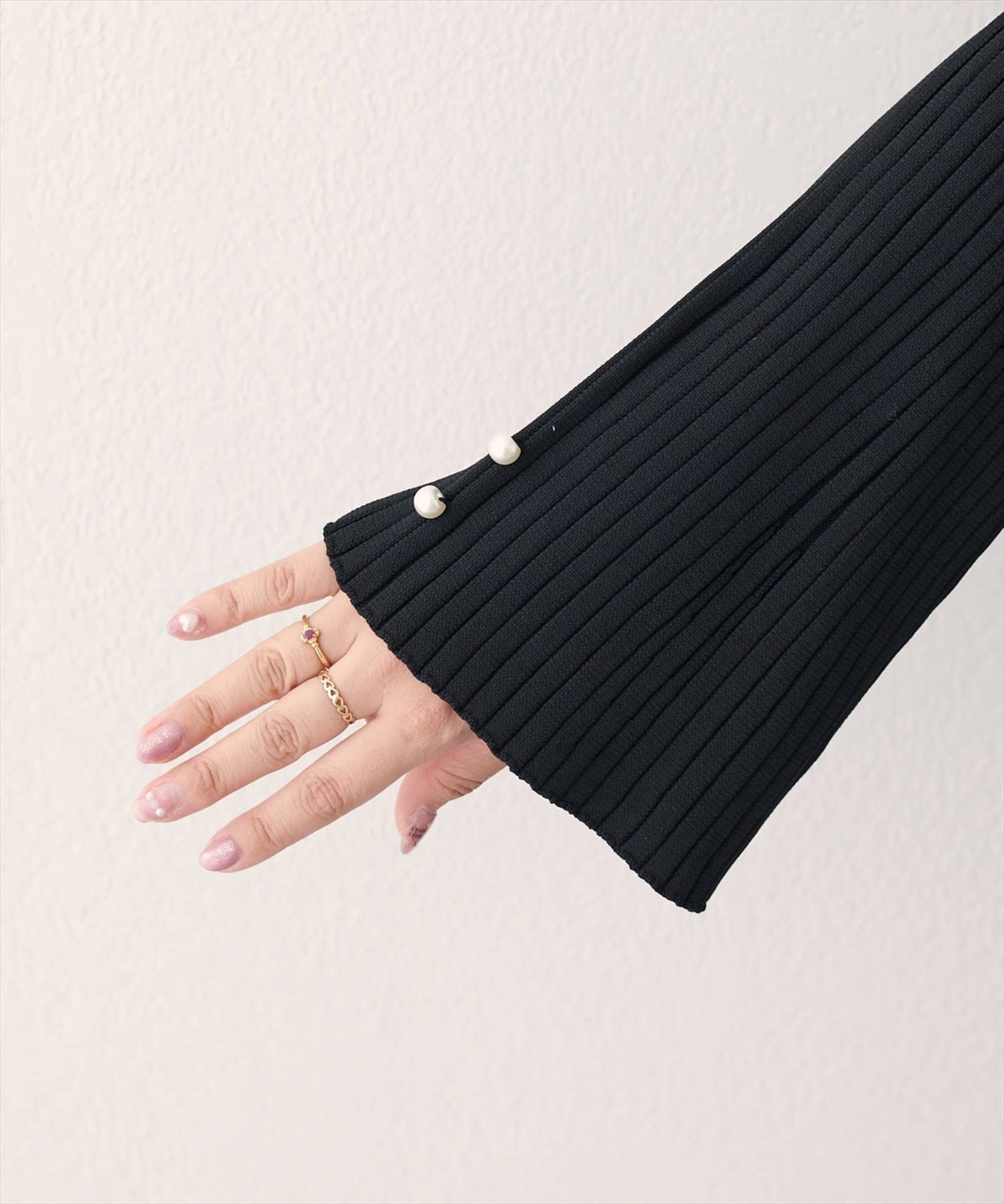 セットインなので肩から二の腕にかけてスッキリ見える他、フレア袖も華奢見えするポイントです。