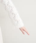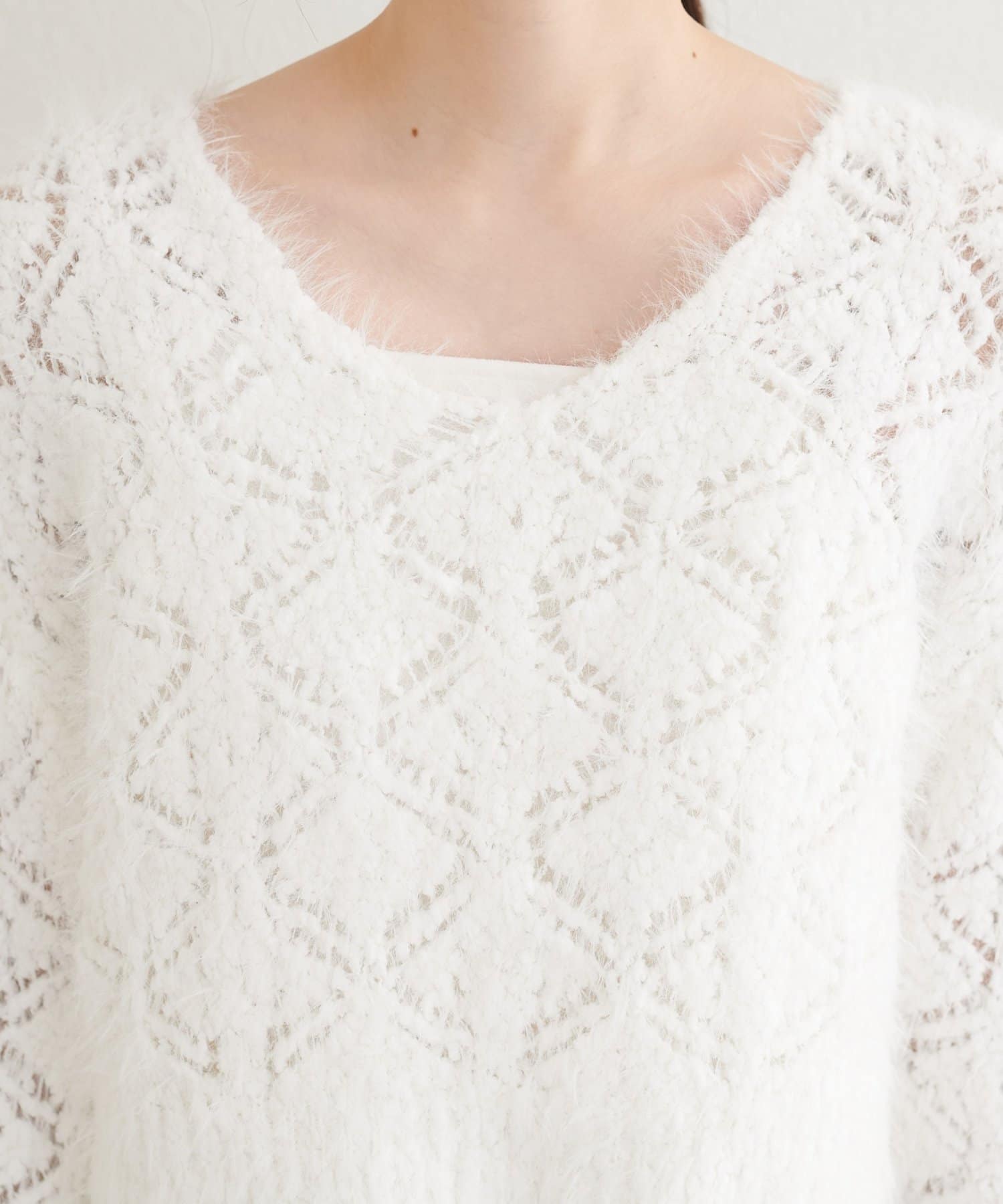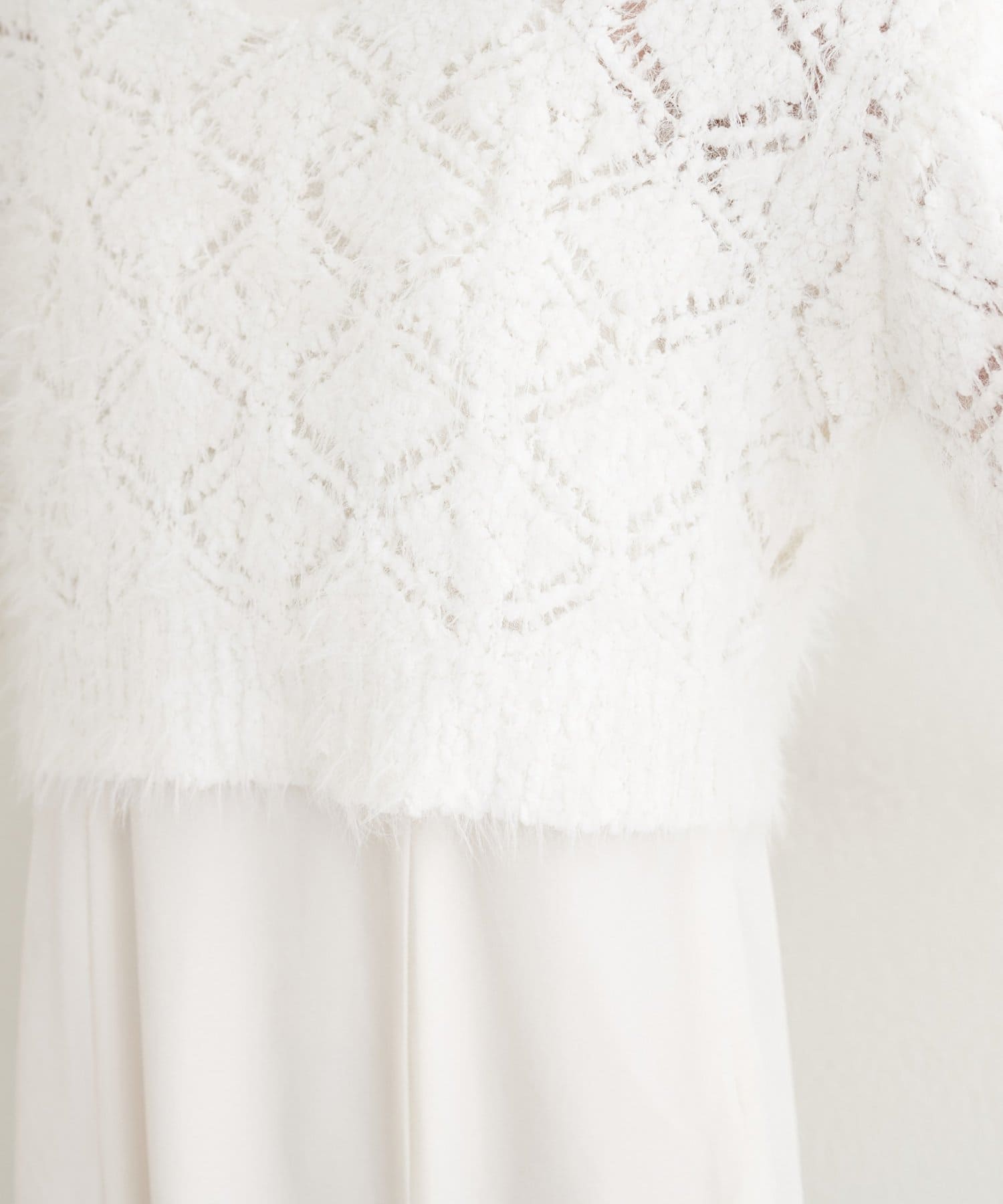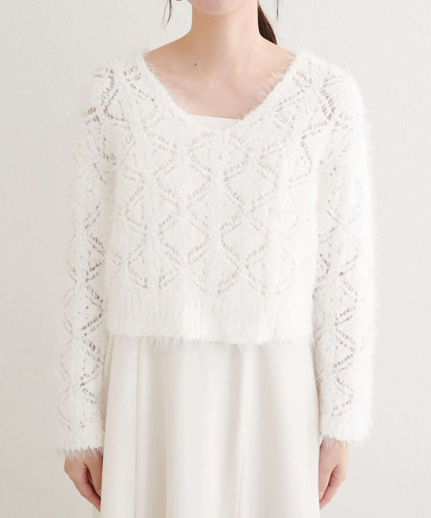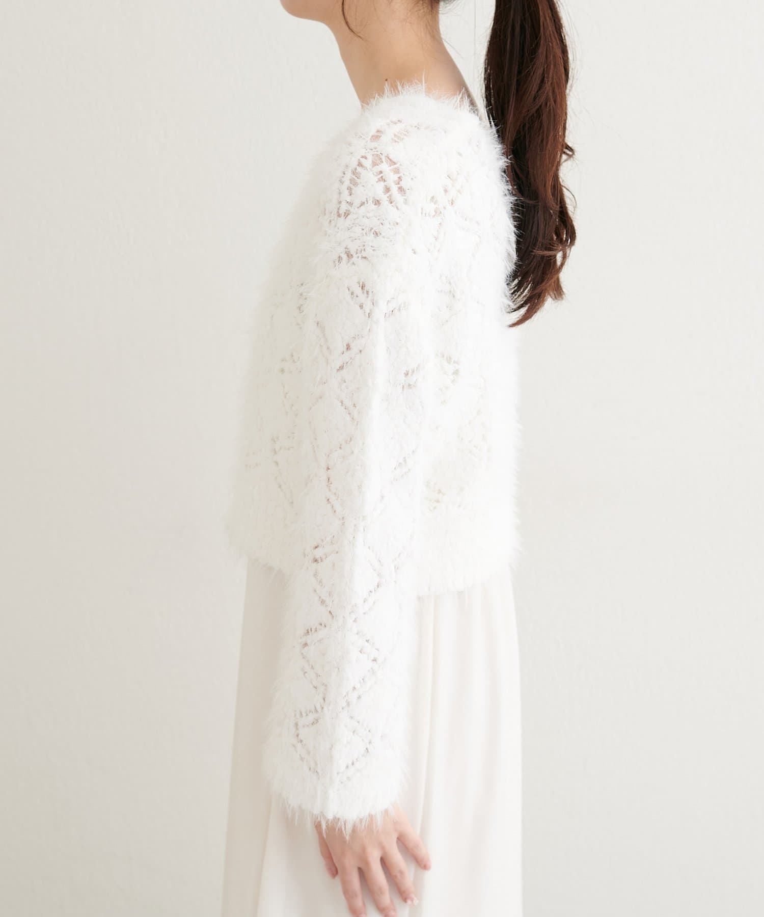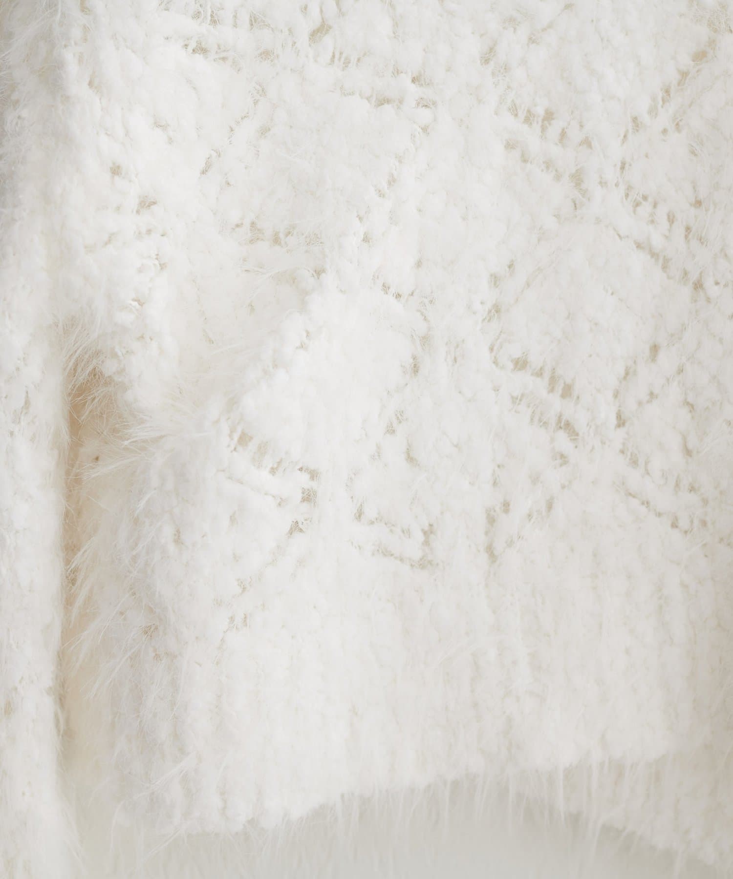 ゆるく編み上げた生地に、ふわっとした毛足の長いフェザー糸をミックス。ホワイトのみやや透け感があり、ピンク・モカは透けにくい仕様です。
