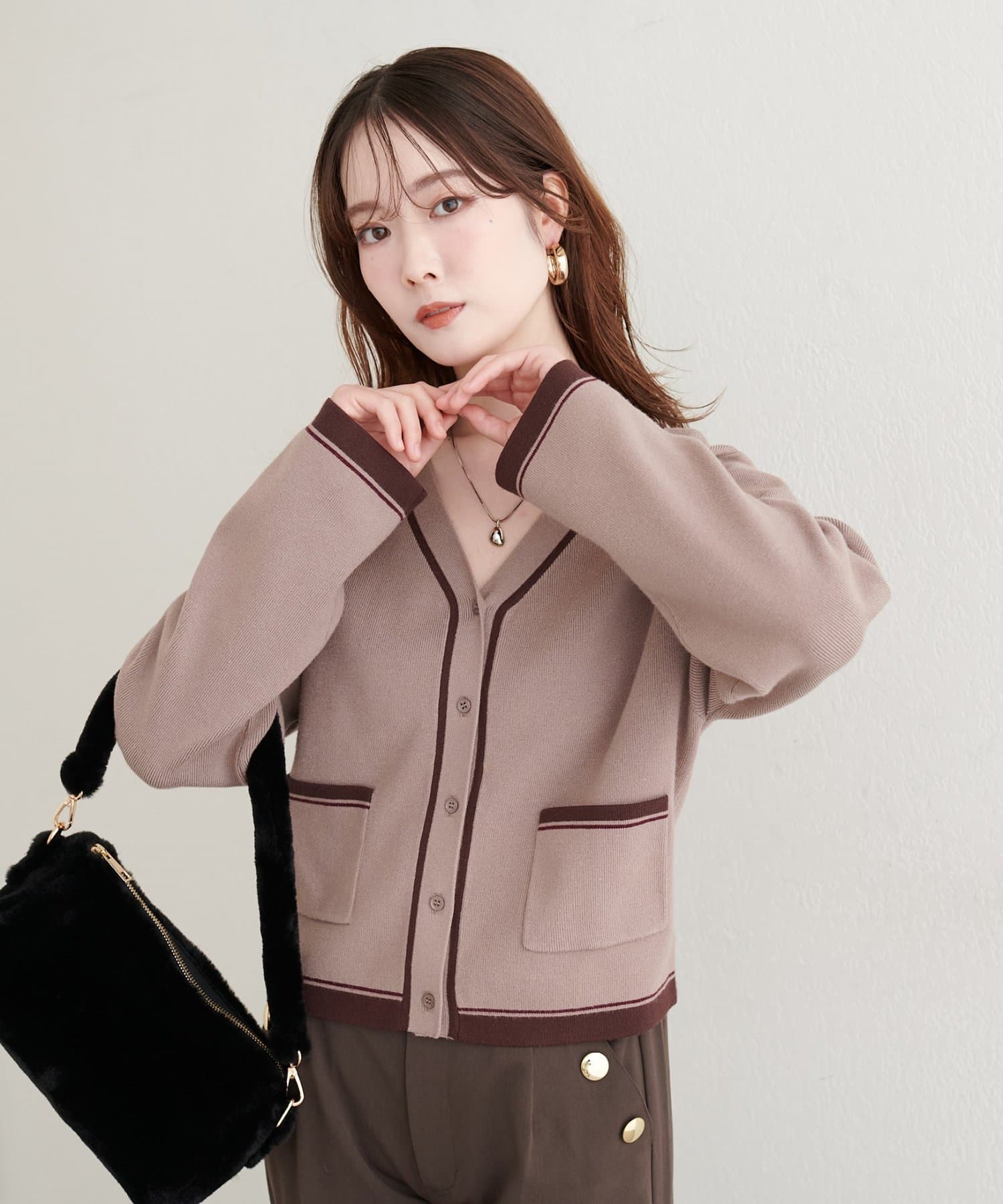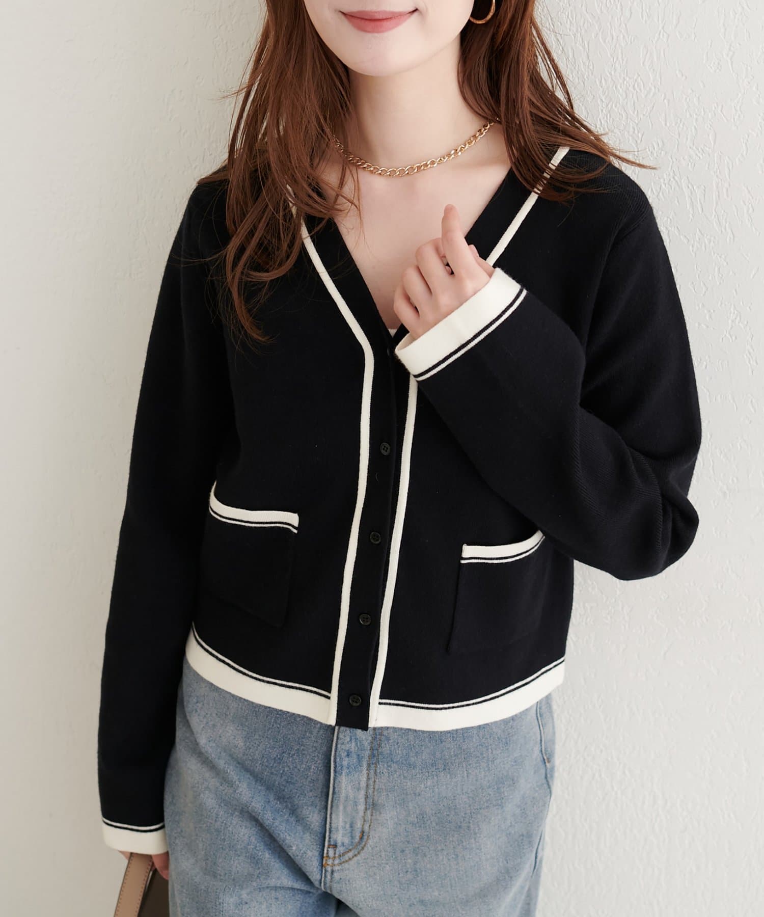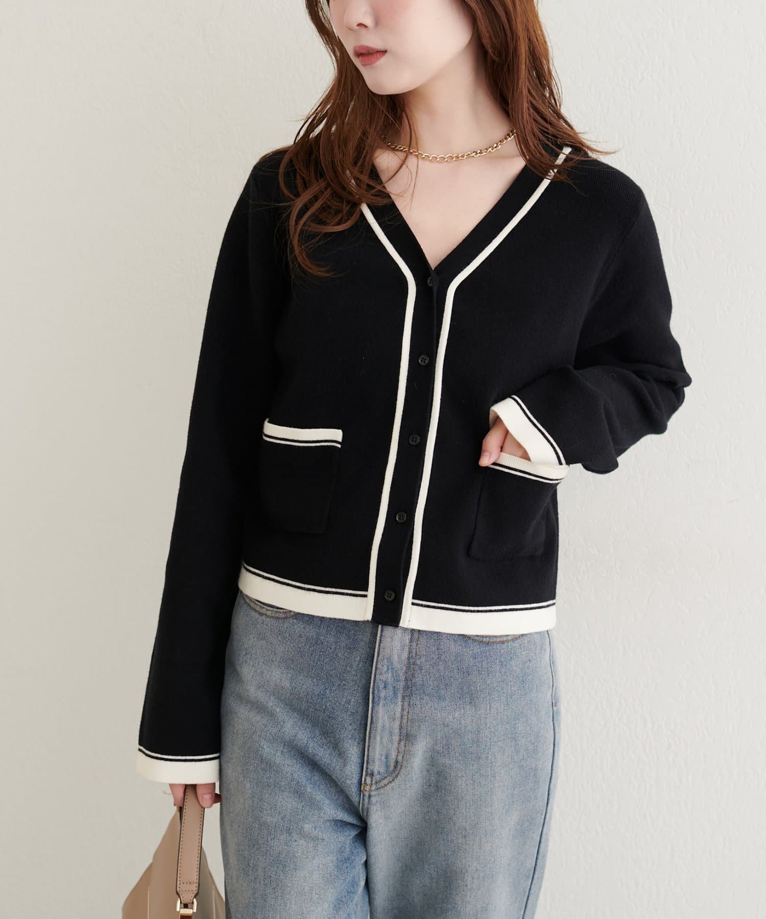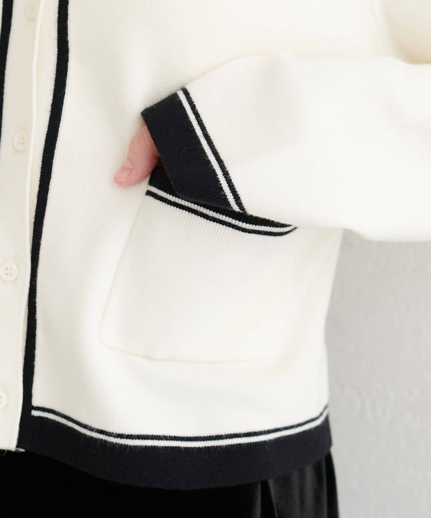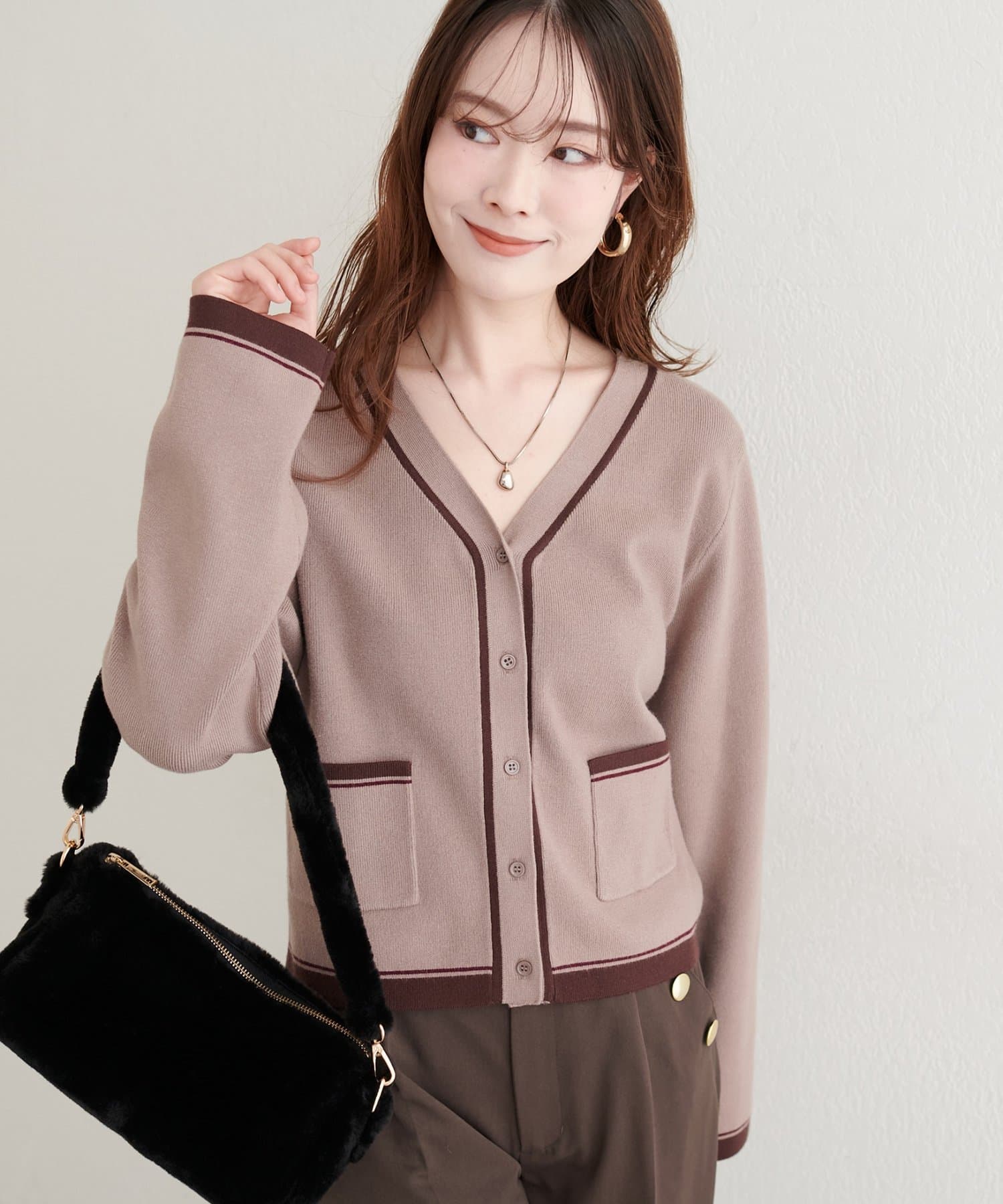配色のカラーやポケット位置など様々なこだわりが詰まったカーディガンです。