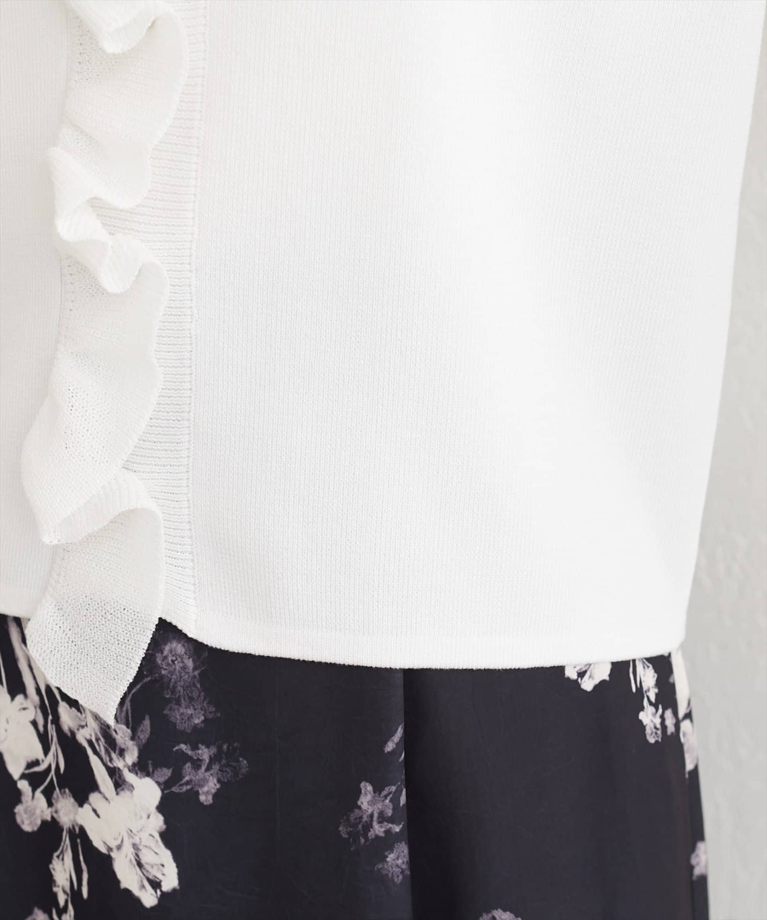 フロントにあしらわれたフリルは、甘すぎない大人の可愛らしさを演出。