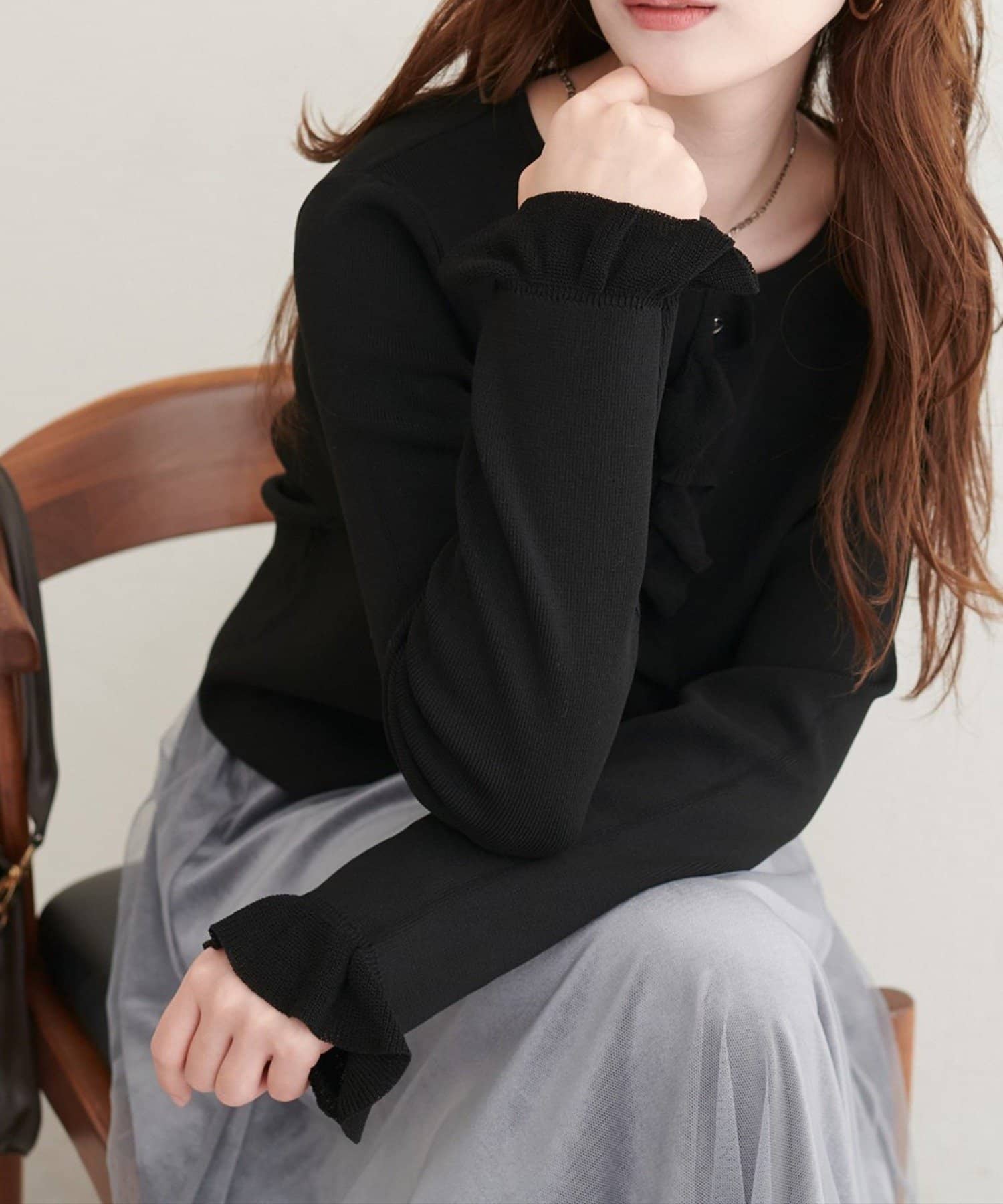 袖口にもフリルがあしらわれ、360度どこから見ても抜かりない、洗練された印象を与えます。