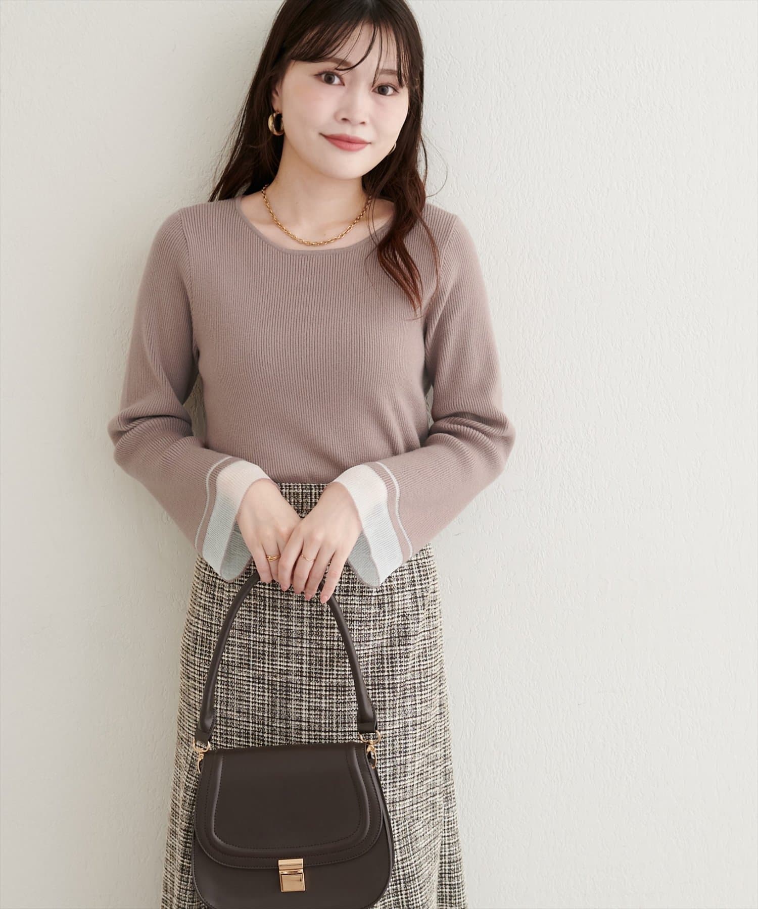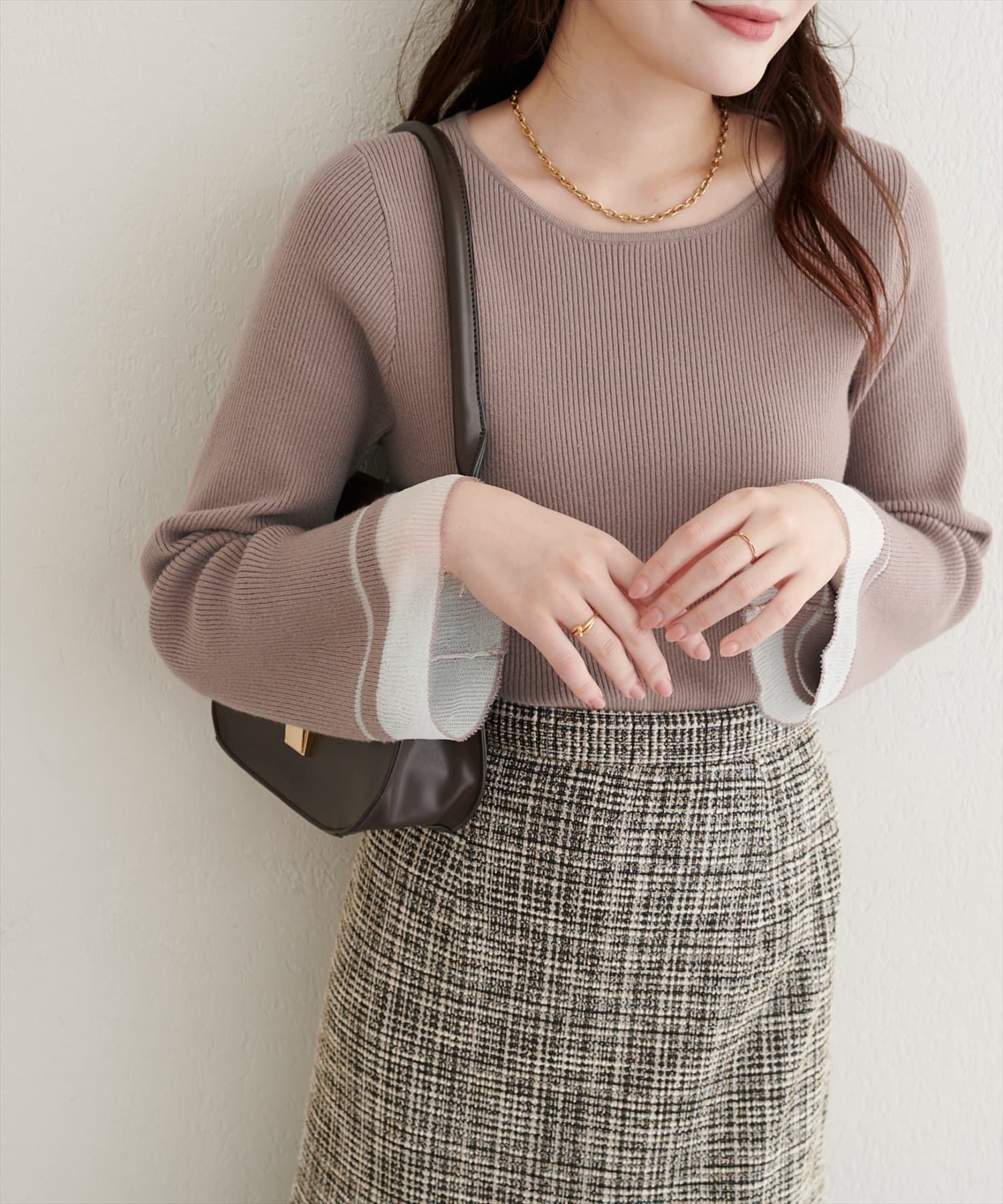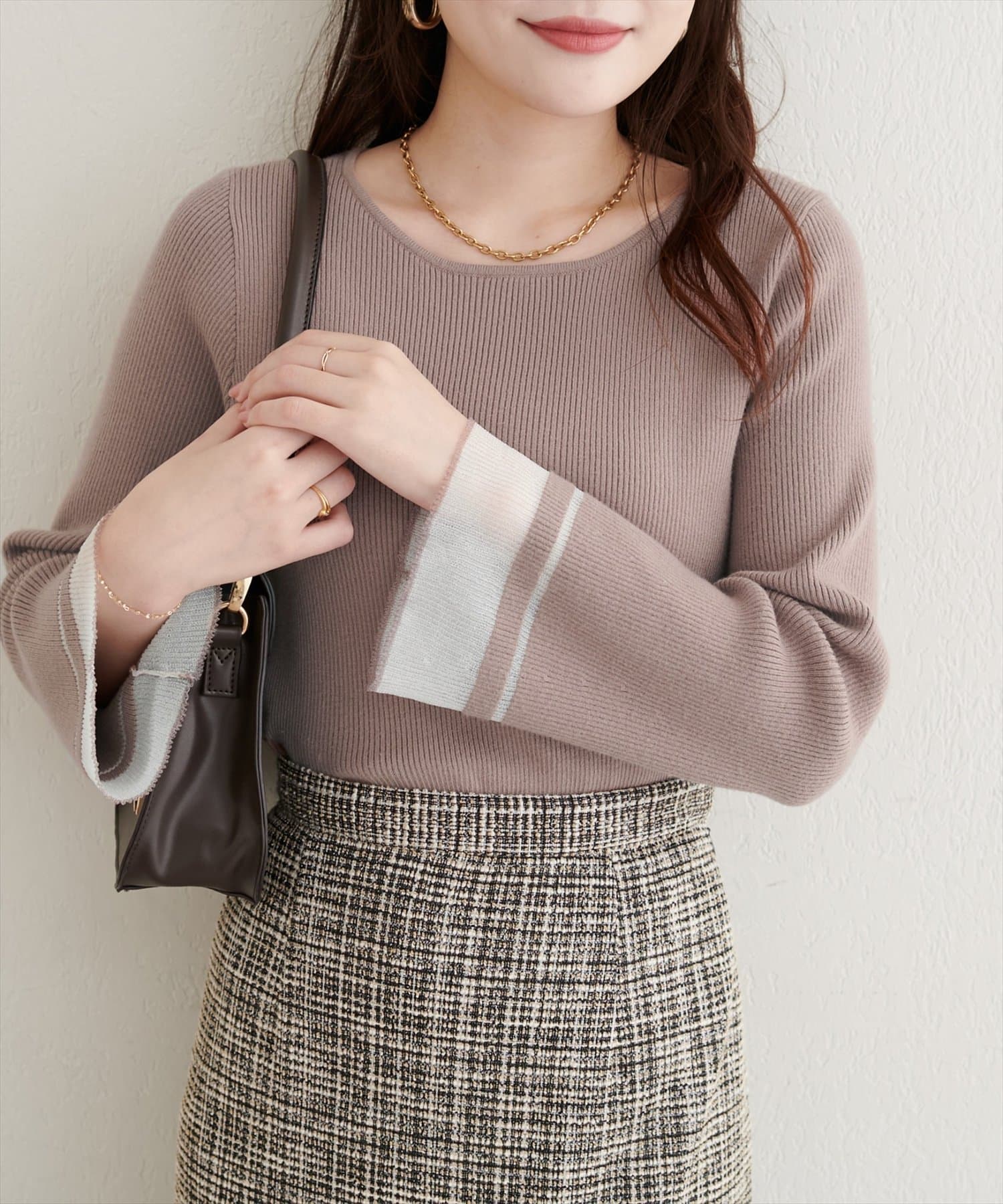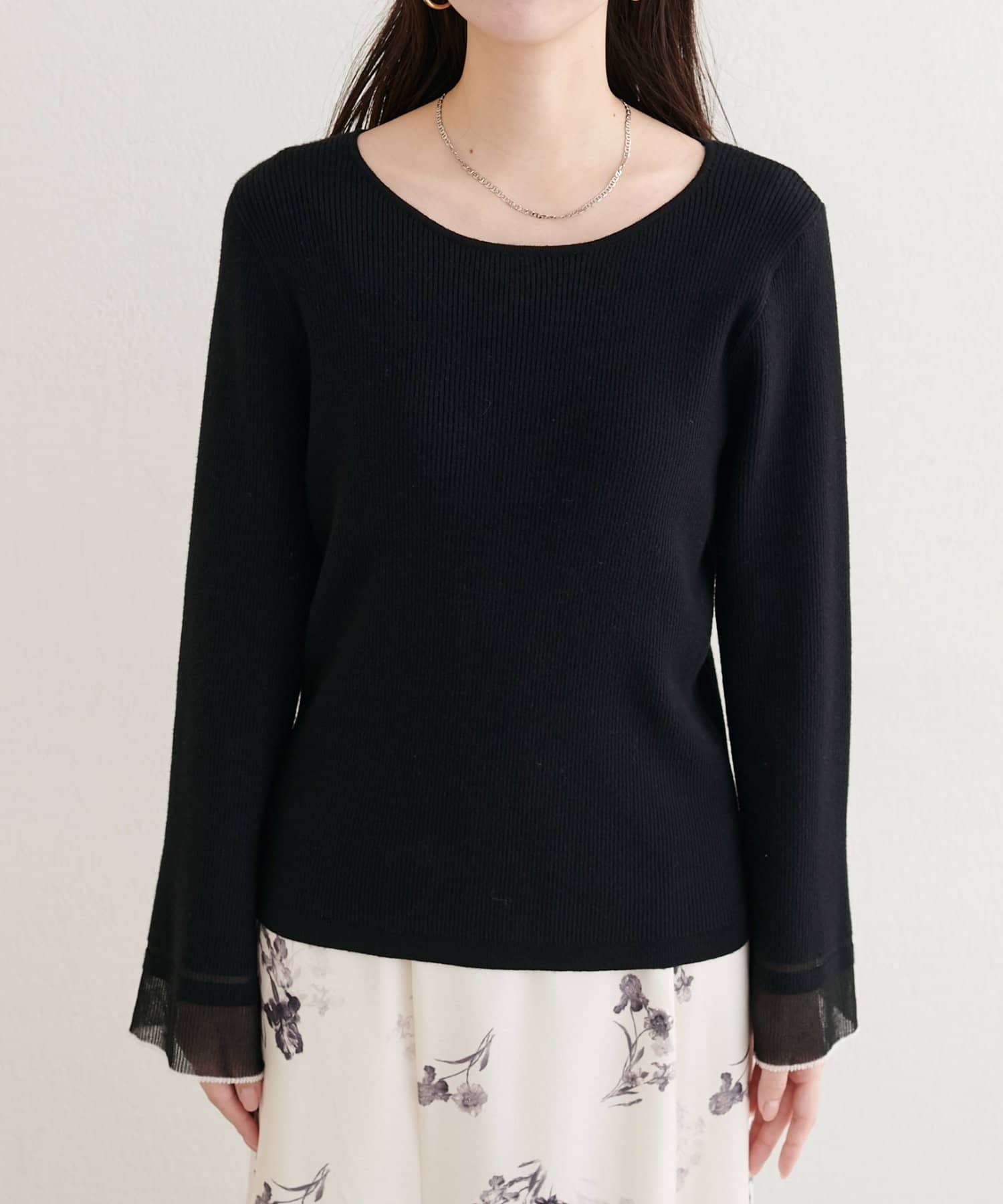 袖口のシアーなフレアが、さりげなくも華やかな印象を与えるニットトップスです。