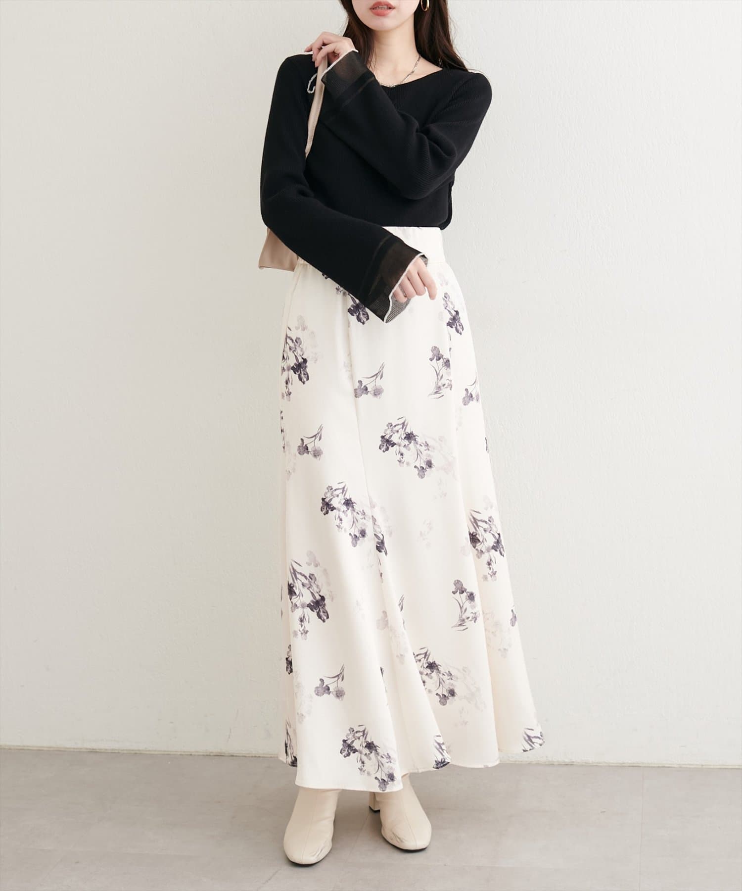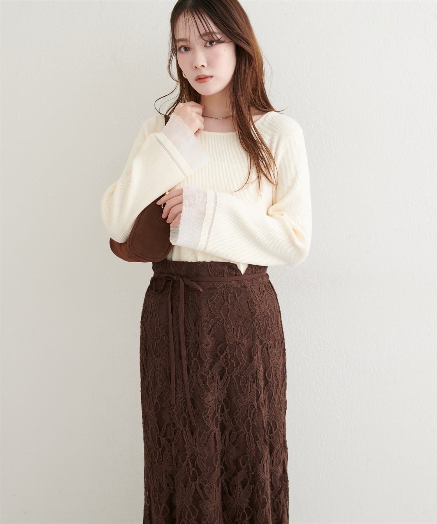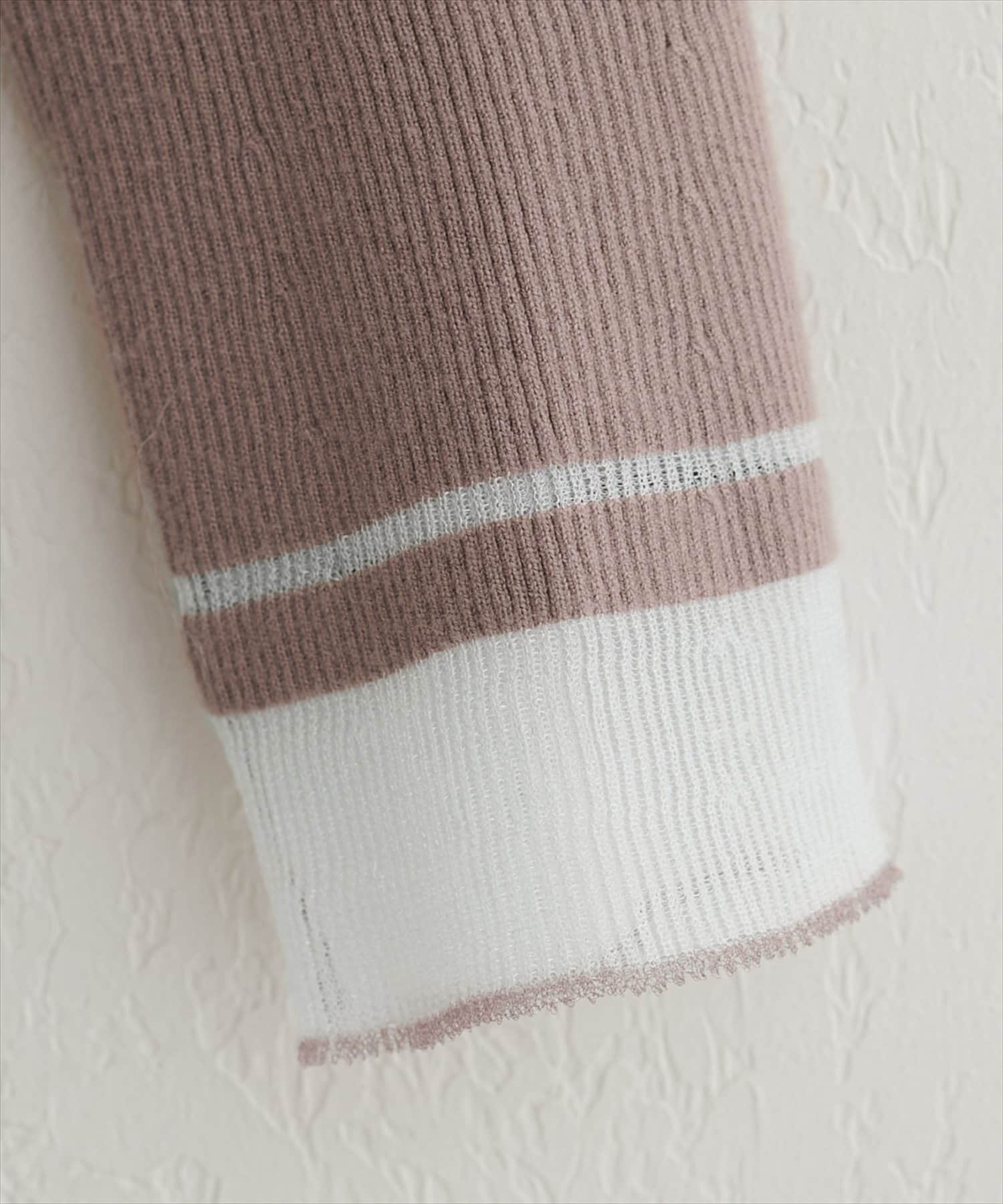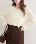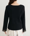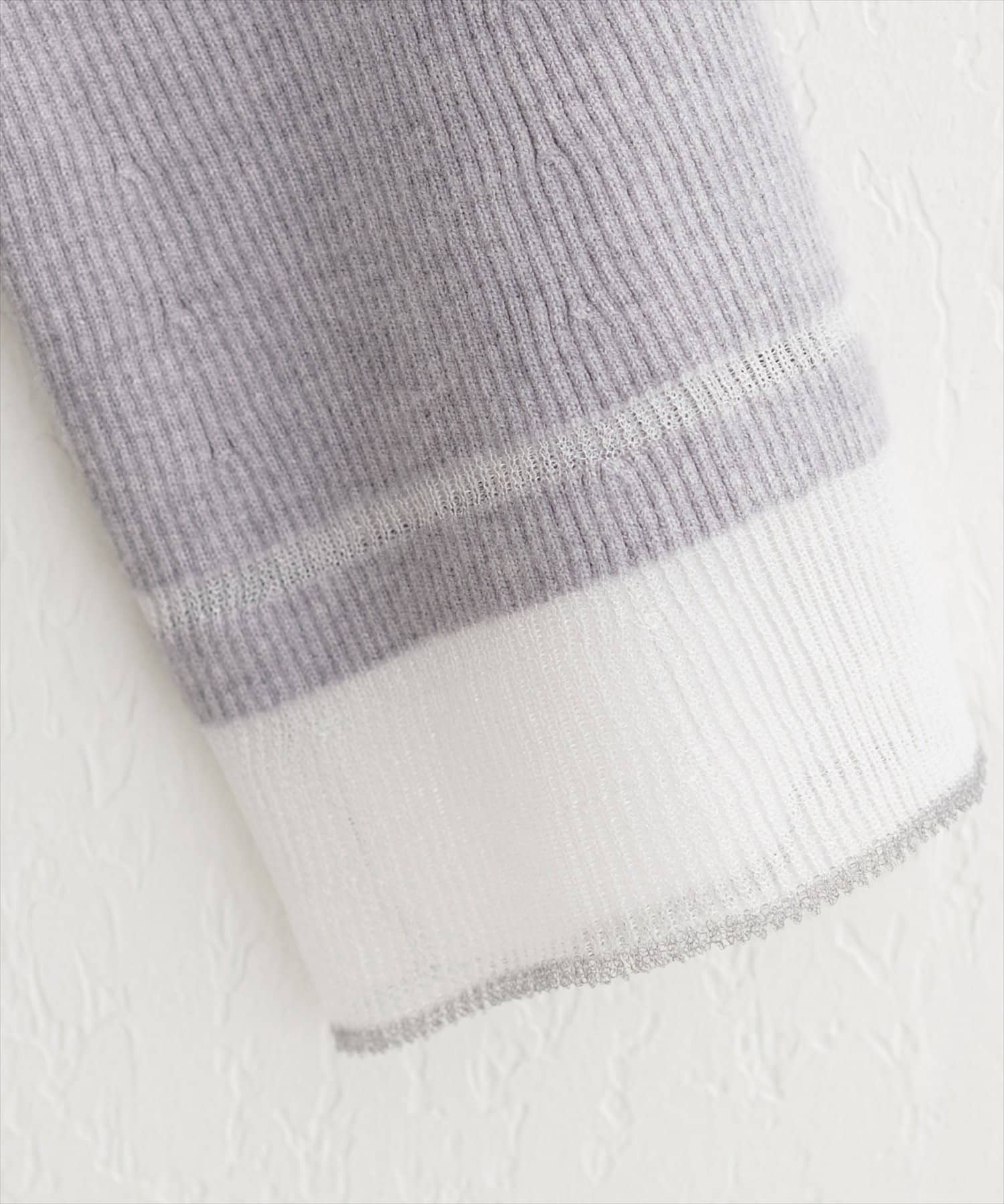 袖口のシアーなフレアが、さりげなくも華やかな印象を与えるニットトップスです。