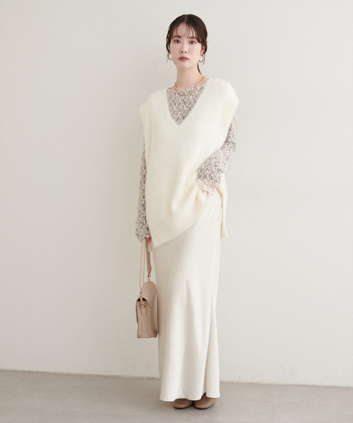 首元はすっきりとしたデザインで、様々なインナーと相性良く、ネックレスなどのアクセサリーも映えます。