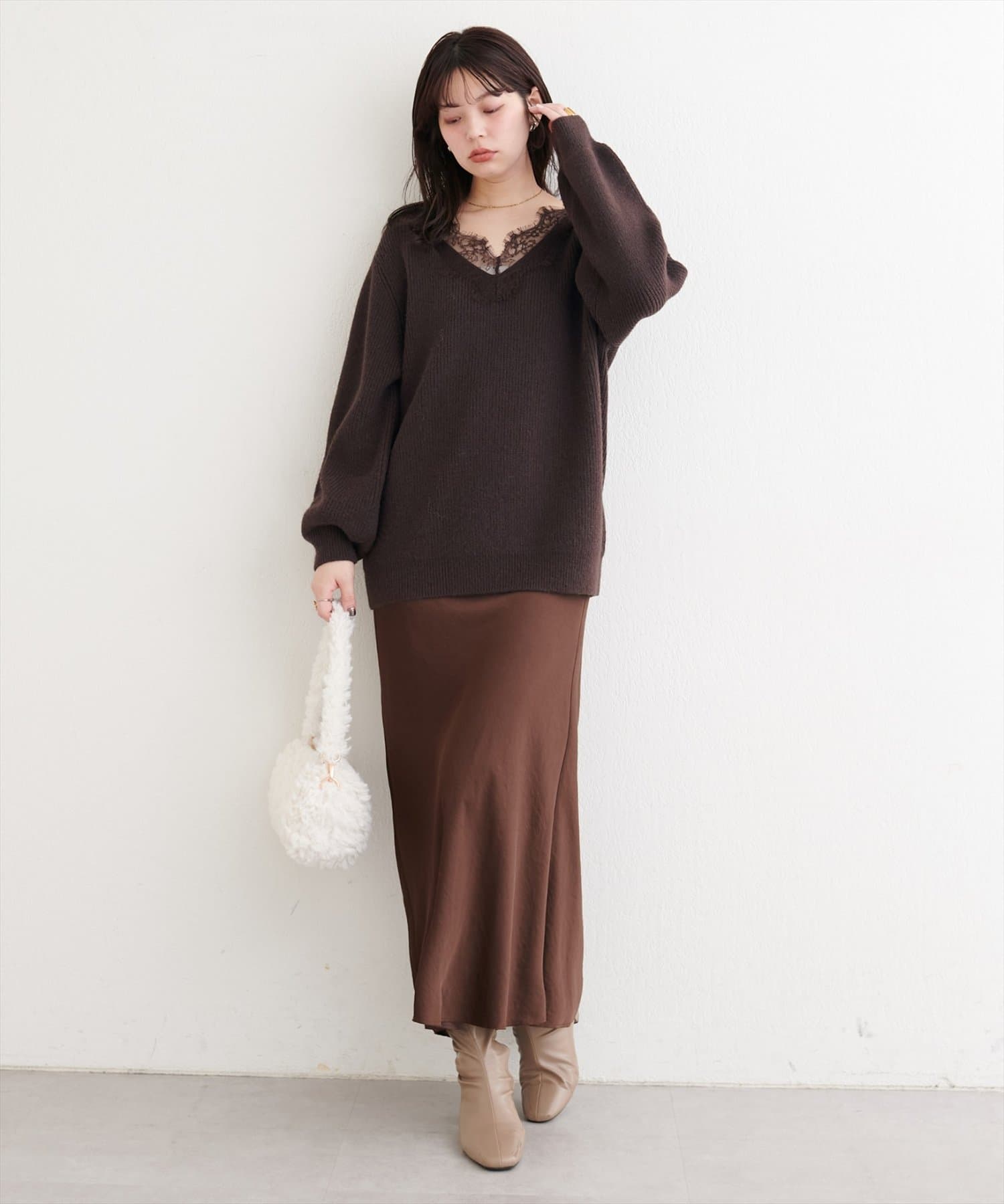 デコルテを美しく見せるVネックラインに、繊細なレースを丁寧に施しました。
