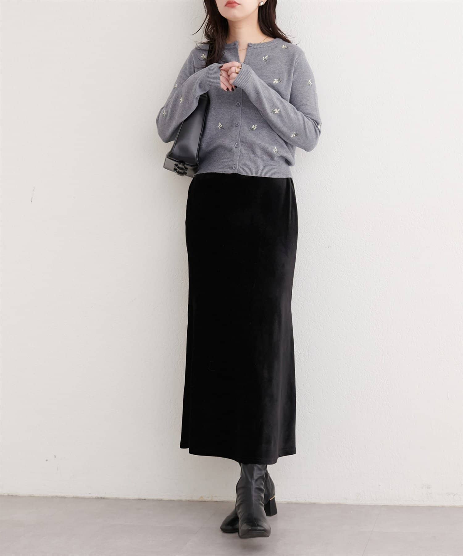 オフィスシーンでは、ブラウスやカットソーの上から羽織れば、きちんと感を演出しつつ、華やかさをプラスできます。