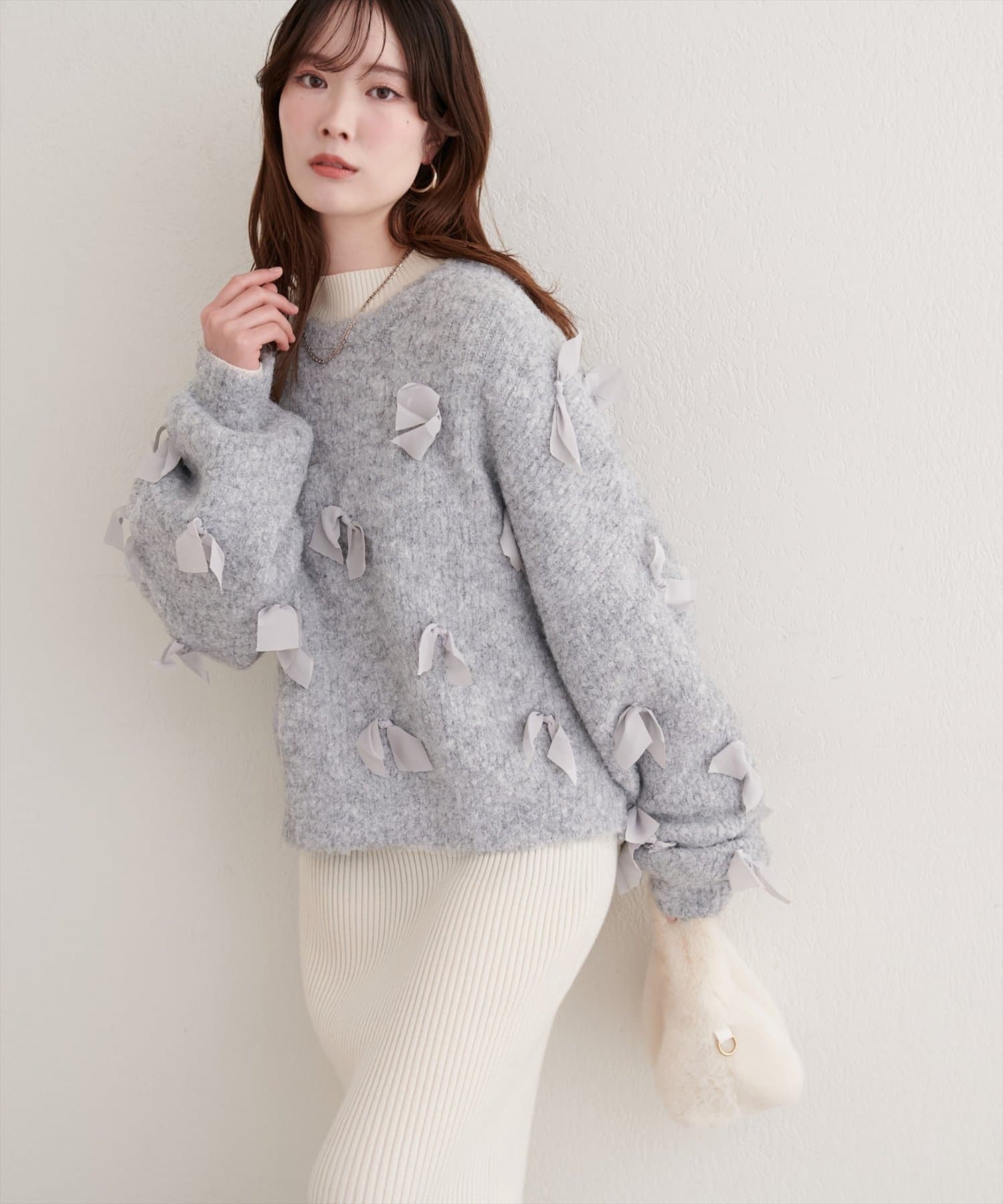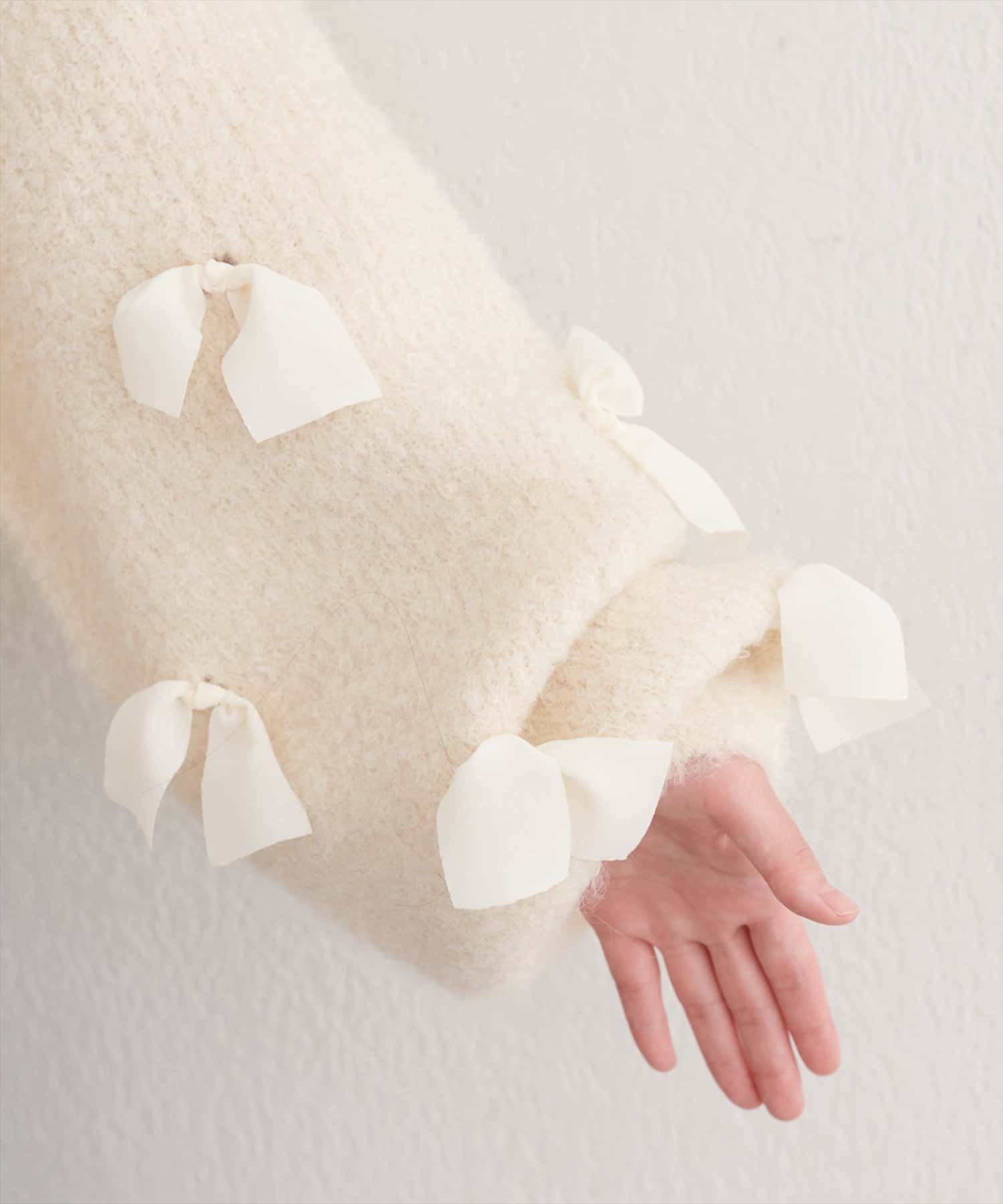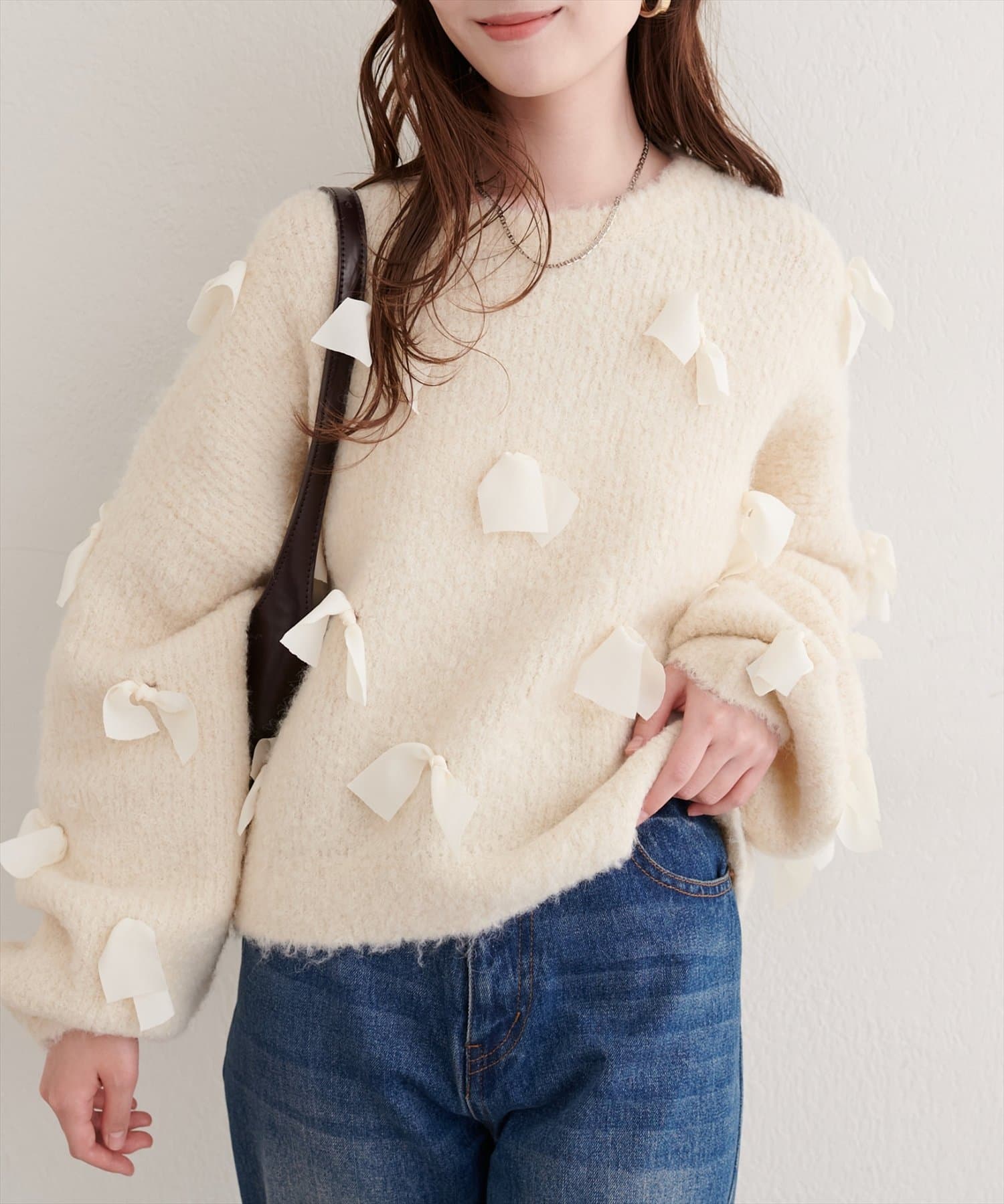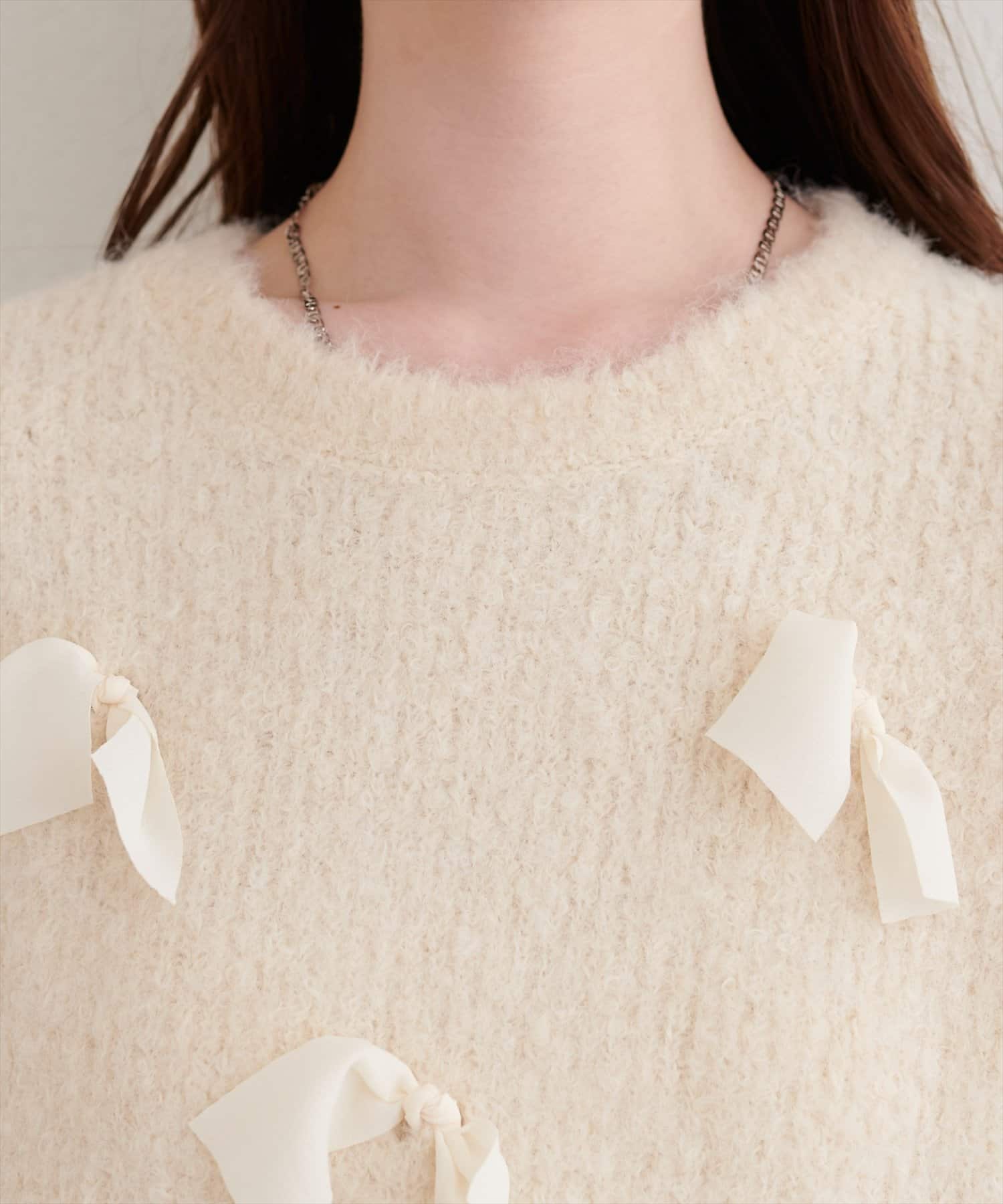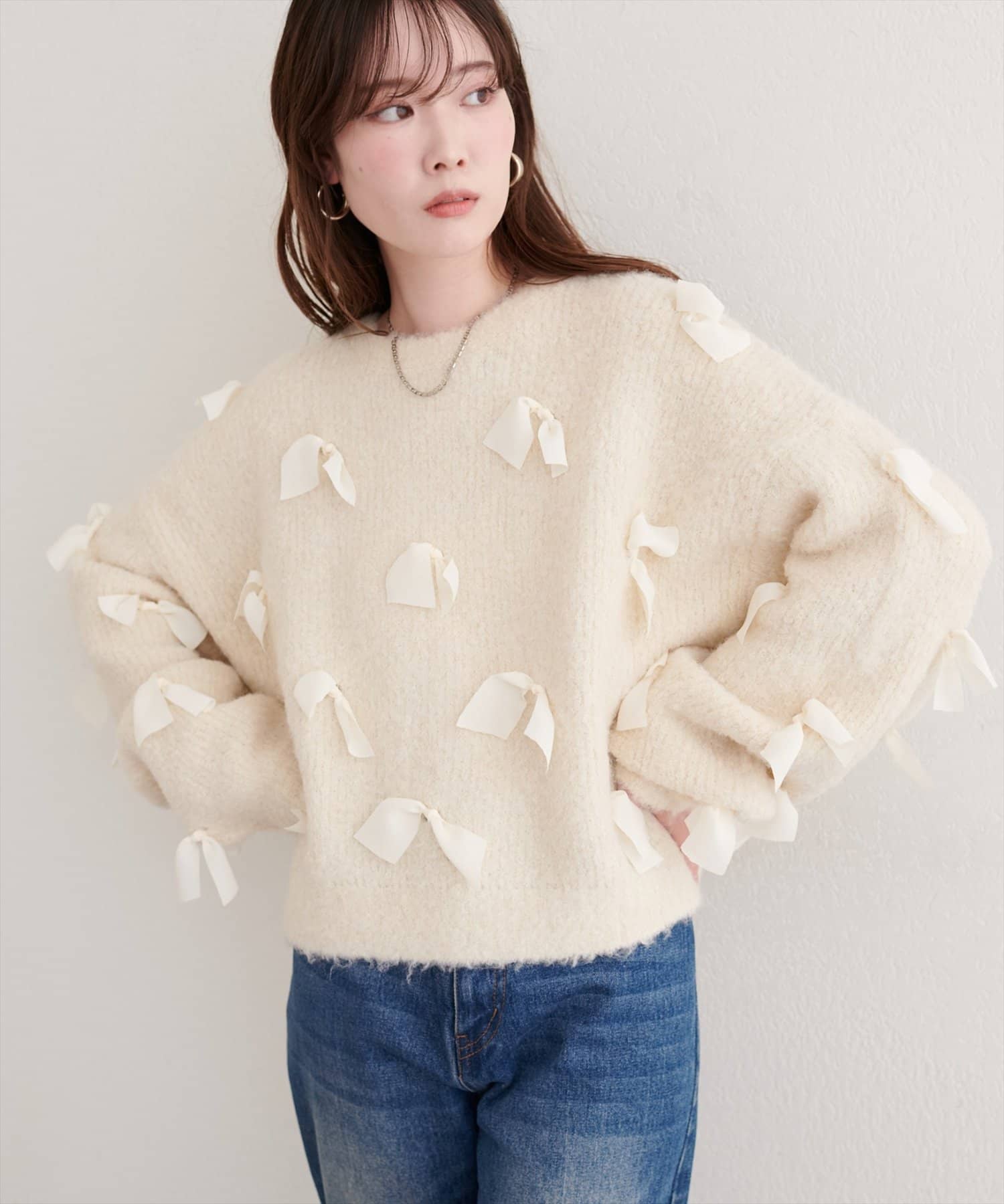 全体的にあしらわれた、愛らしいリボンが特徴的なニットアイテム。