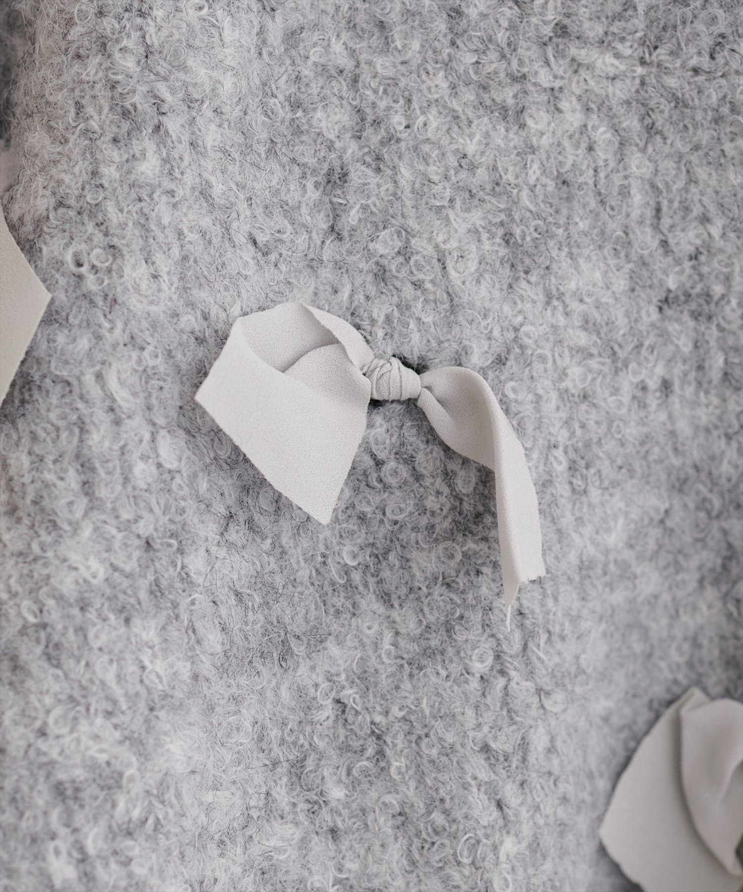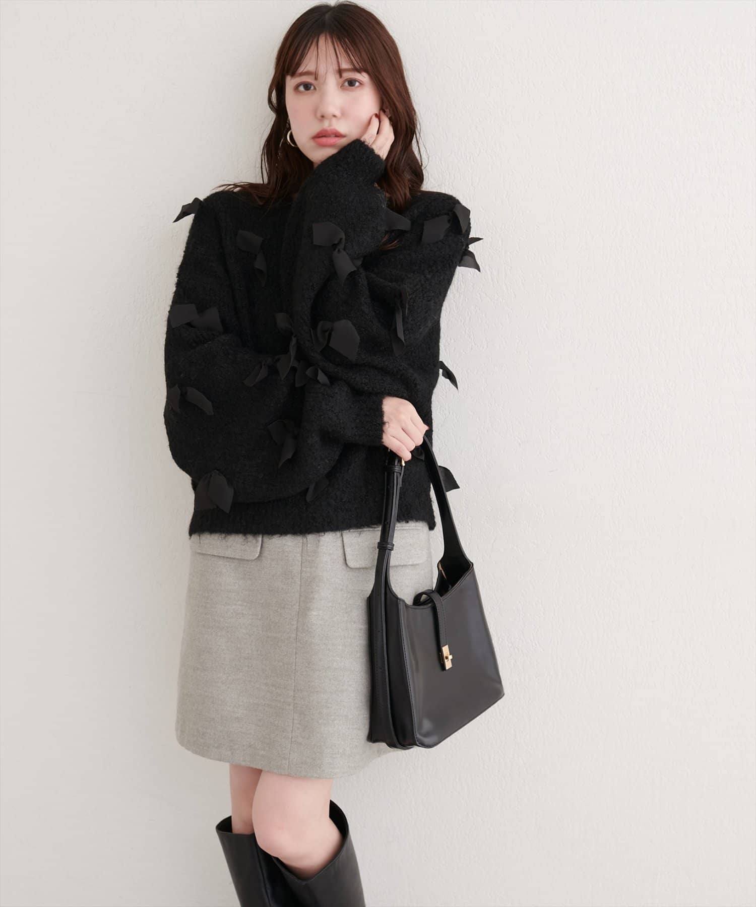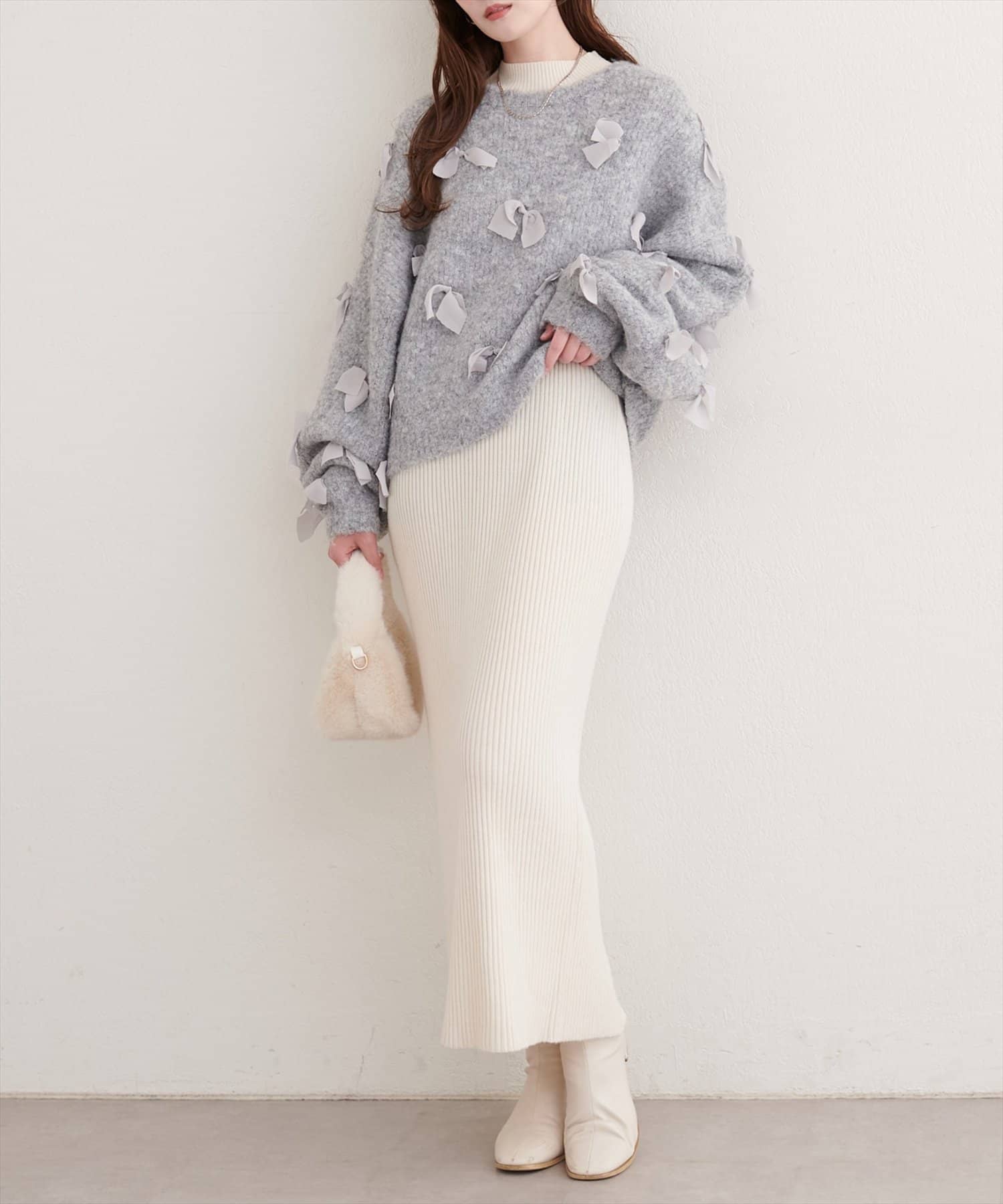 立体的で柔らかなリボンが、重くなりがちなニットに華やかさと抜け感をプラスします。