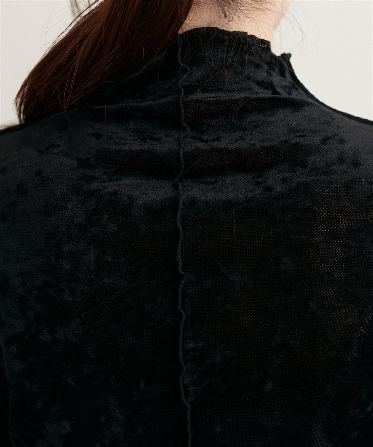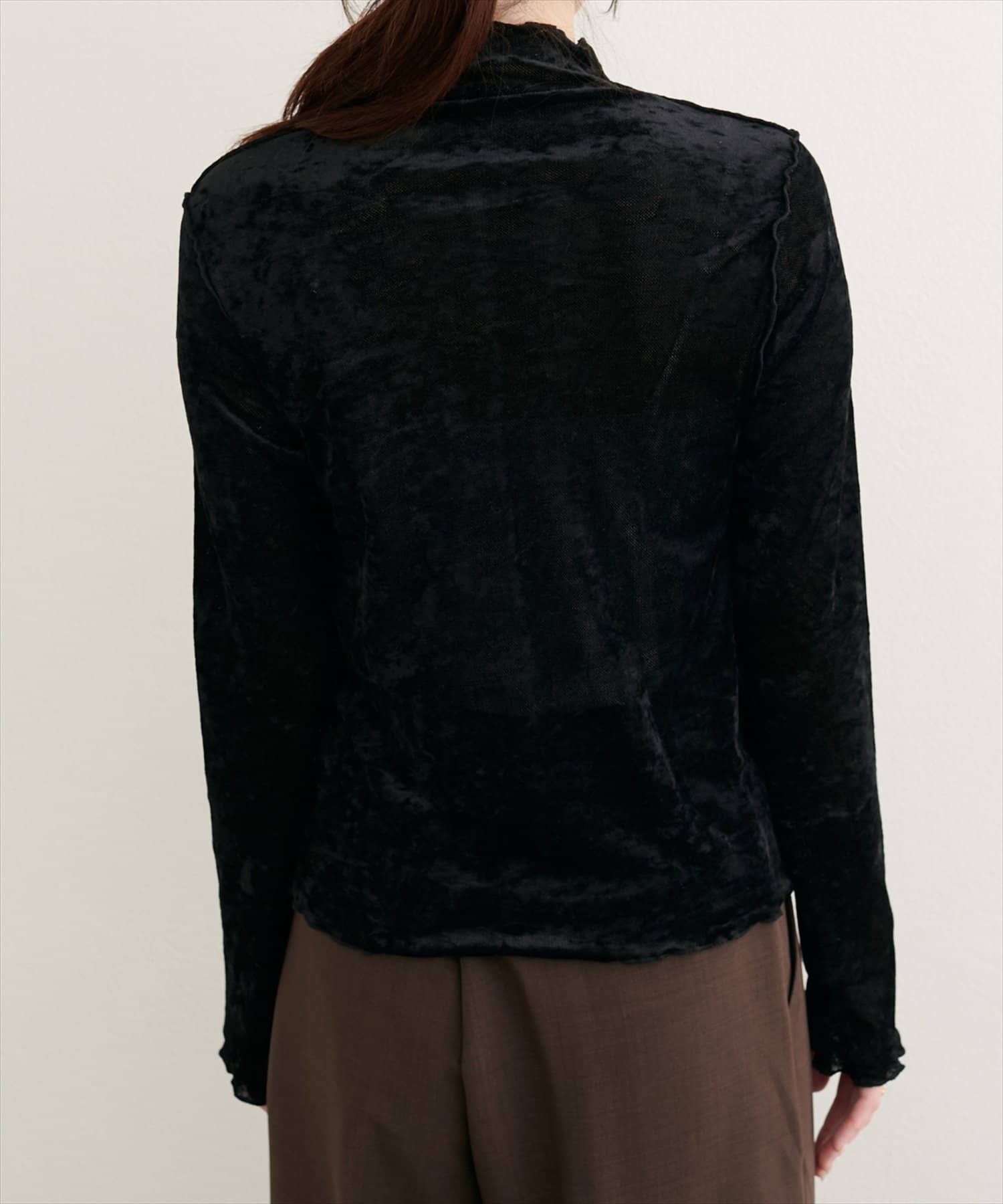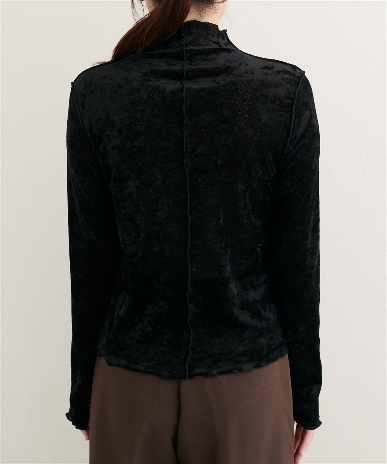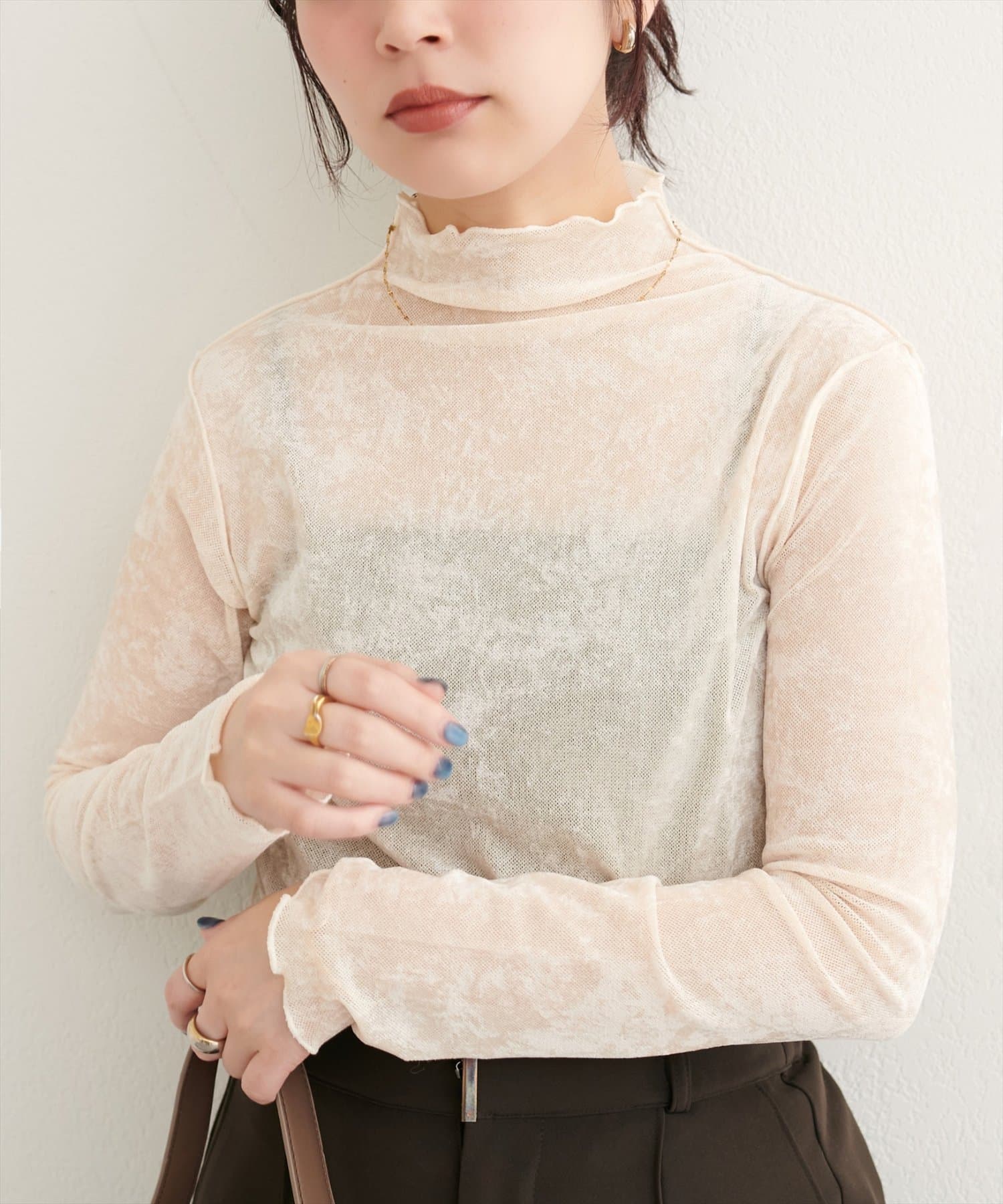 繊細な透け感と、上品なフロッキー加工が魅力のボトルネックプルオーバー。
