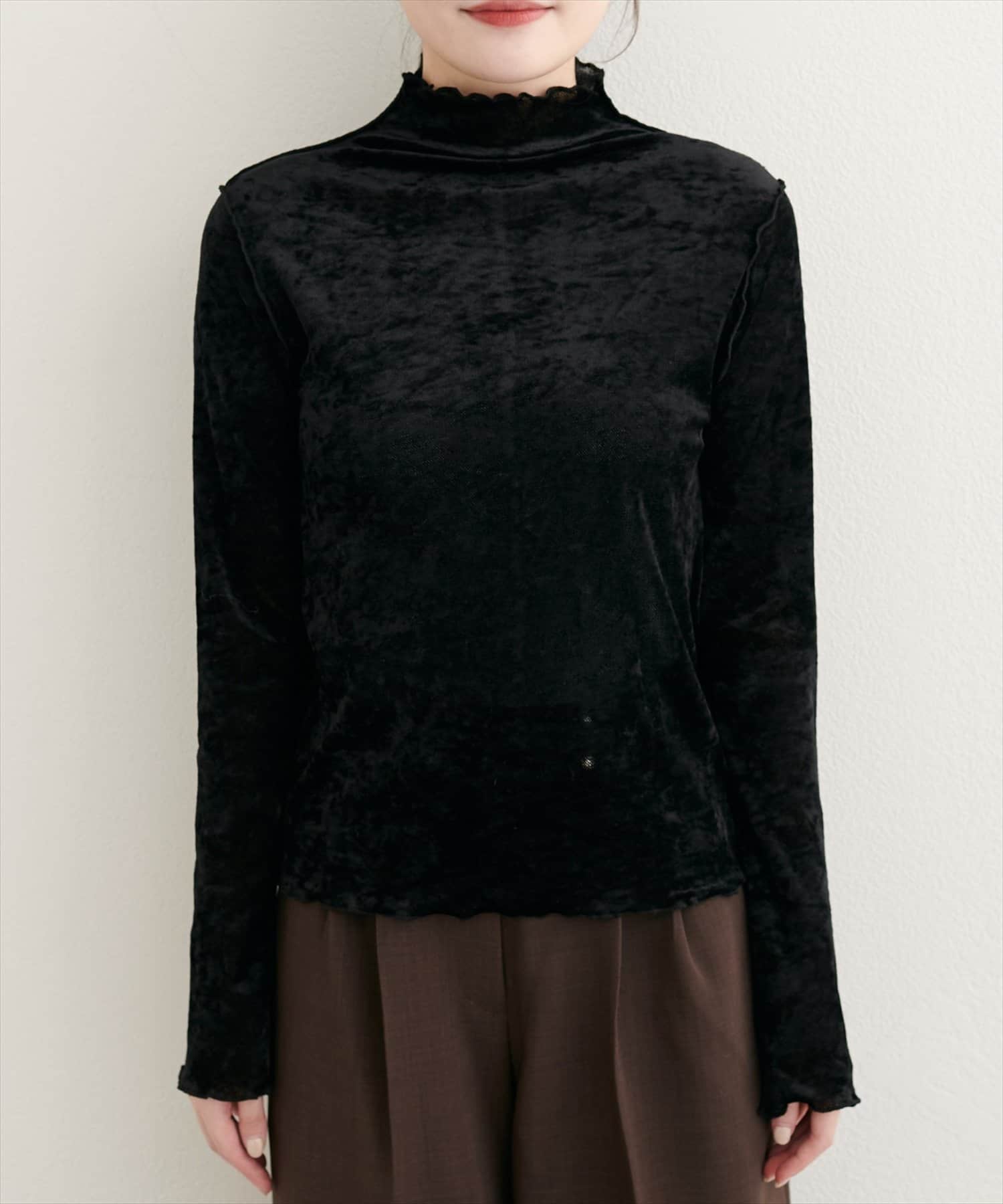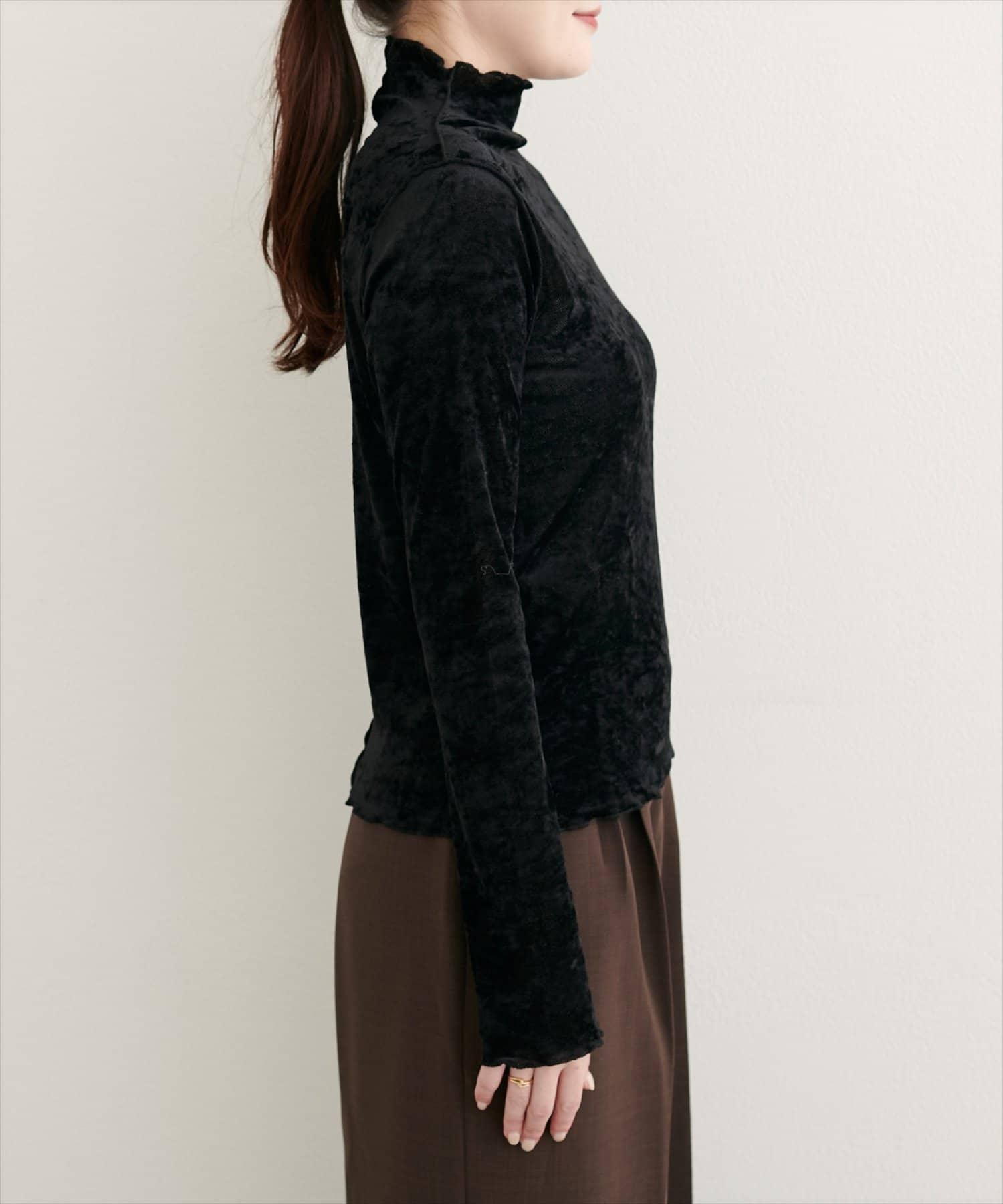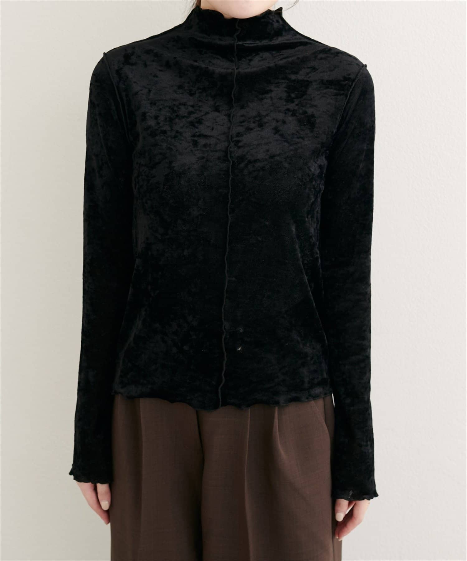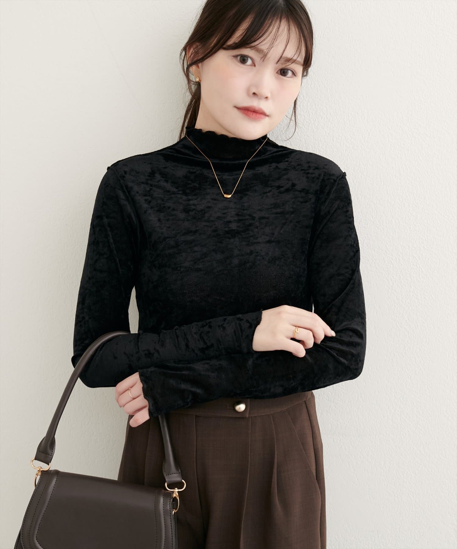 繊細な透け感と、上品なフロッキー加工が魅力のボトルネックプルオーバー。