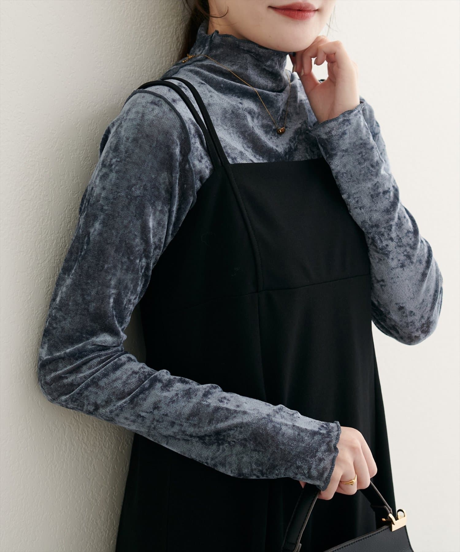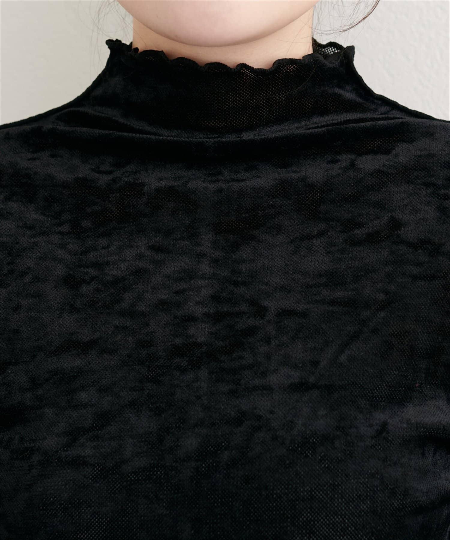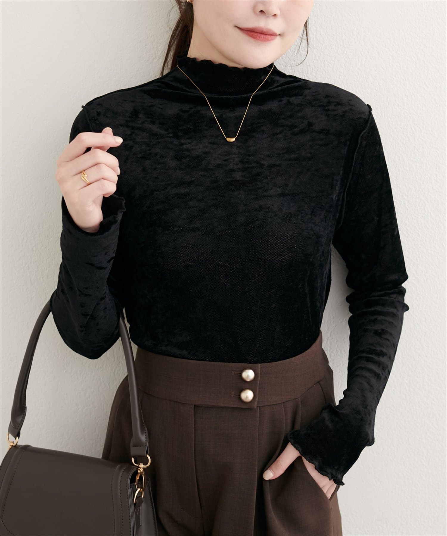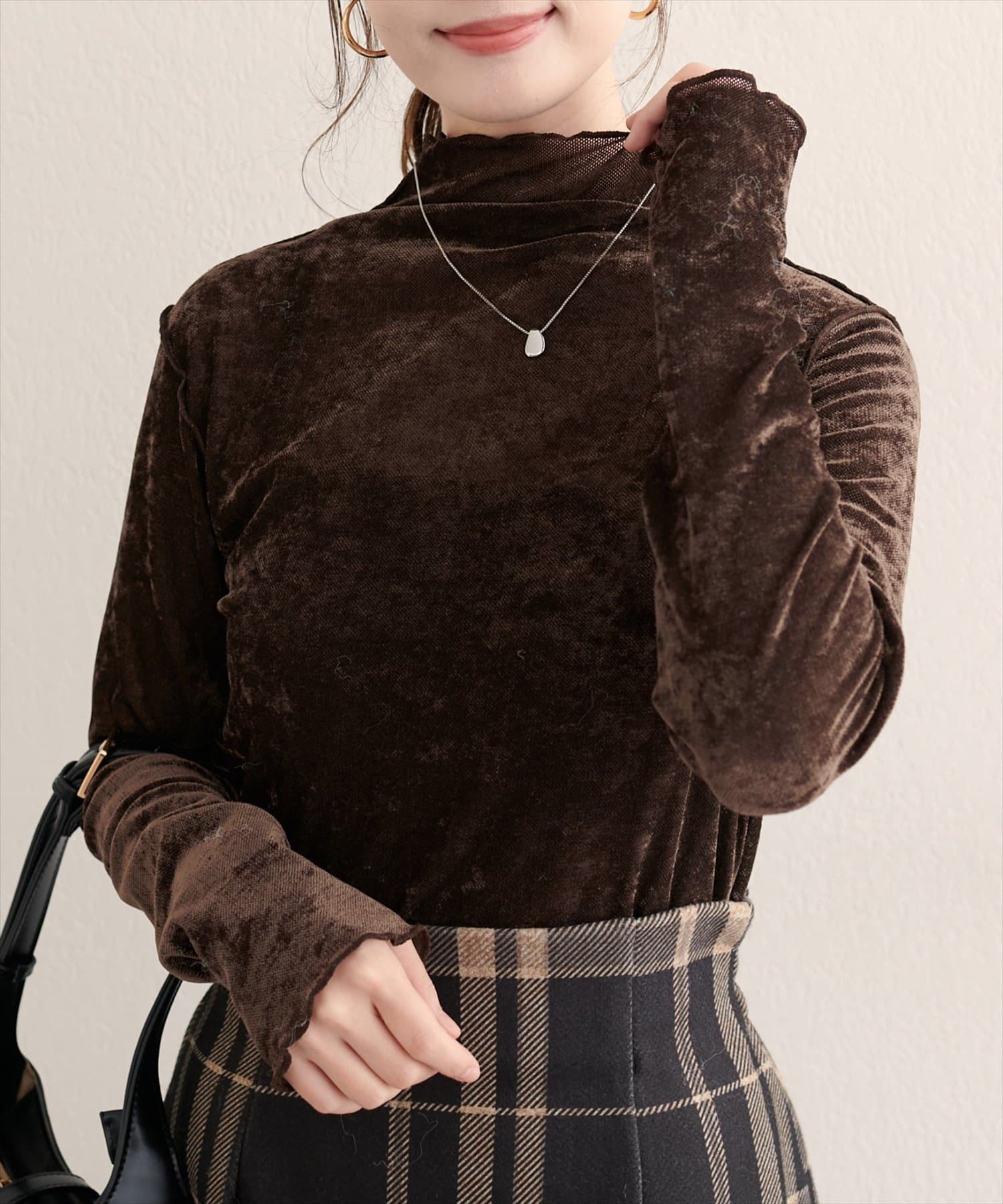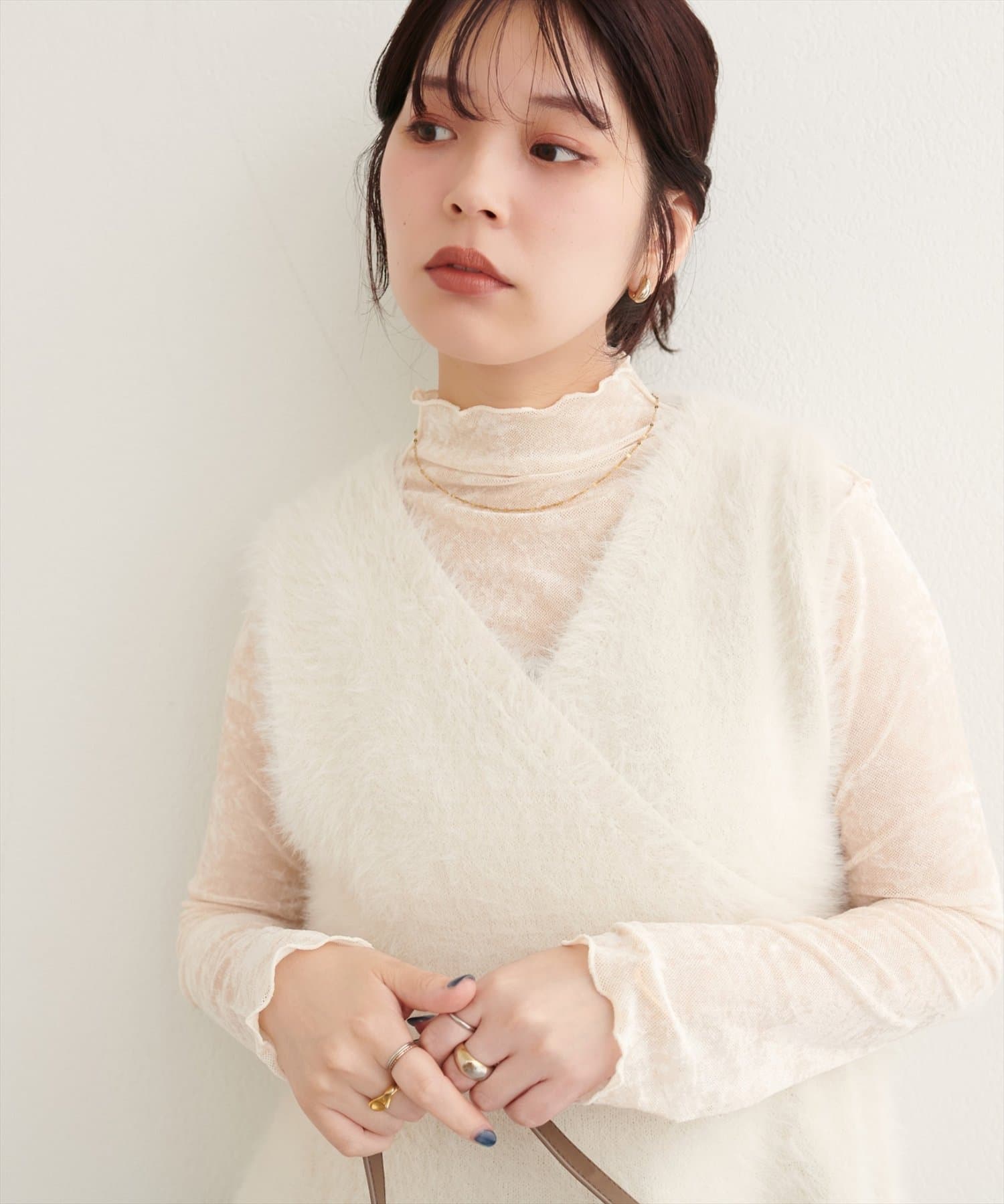 繊細な透け感と、上品なフロッキー加工が魅力のボトルネックプルオーバー。