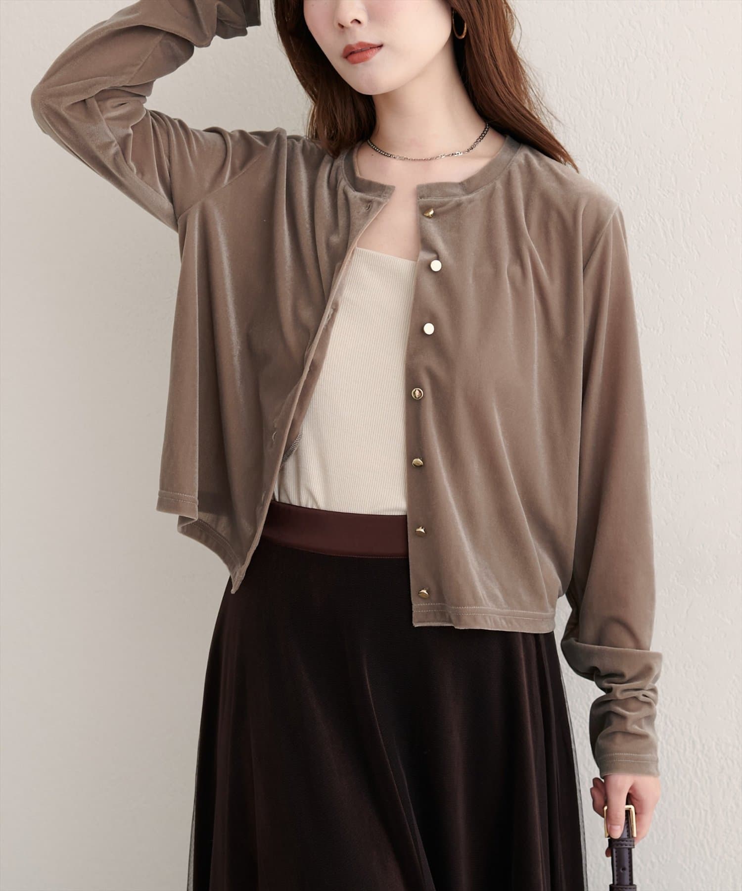上品な光沢を放つベロア素材が、大人の女性らしさを引き立てるカーディガン。