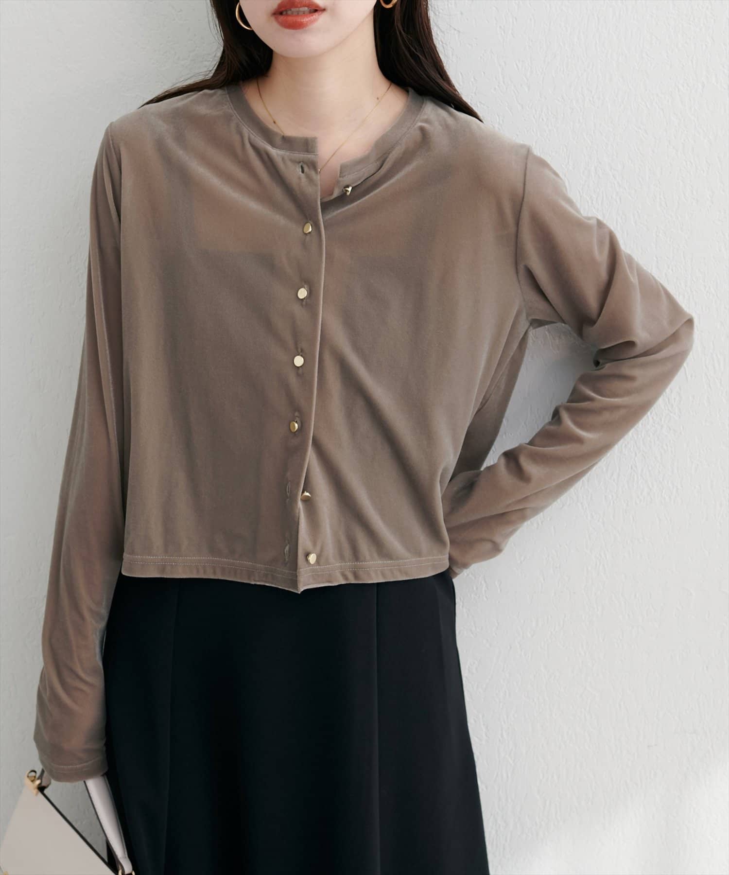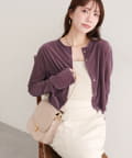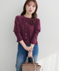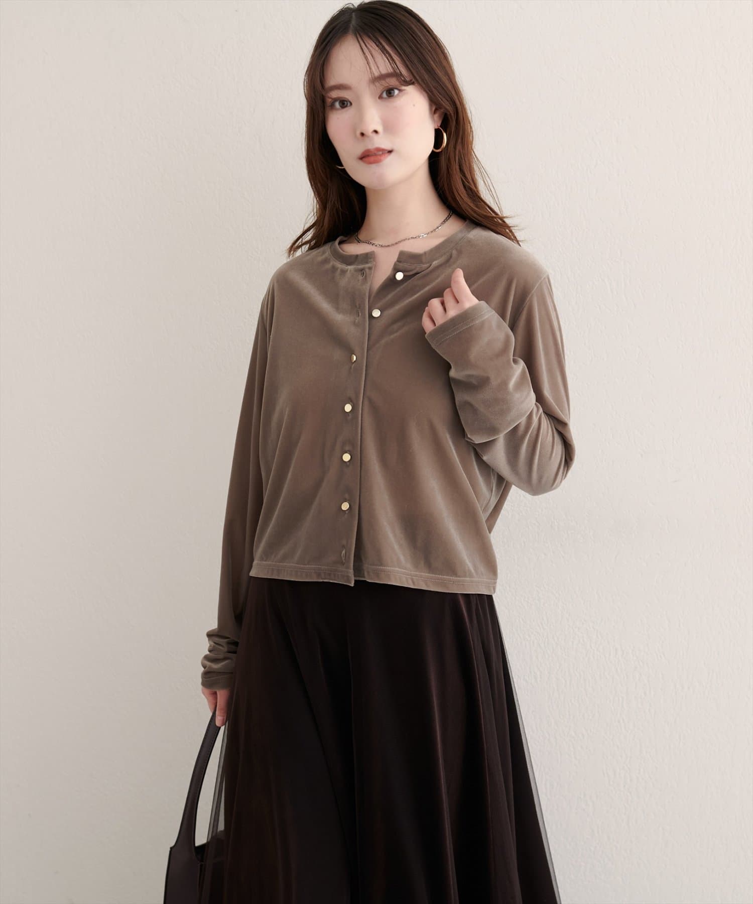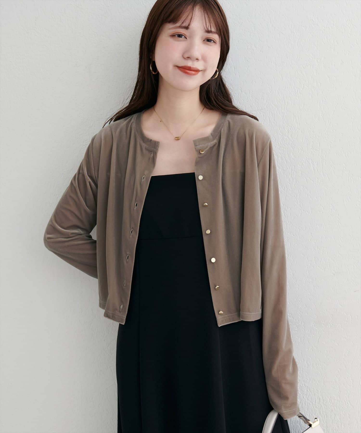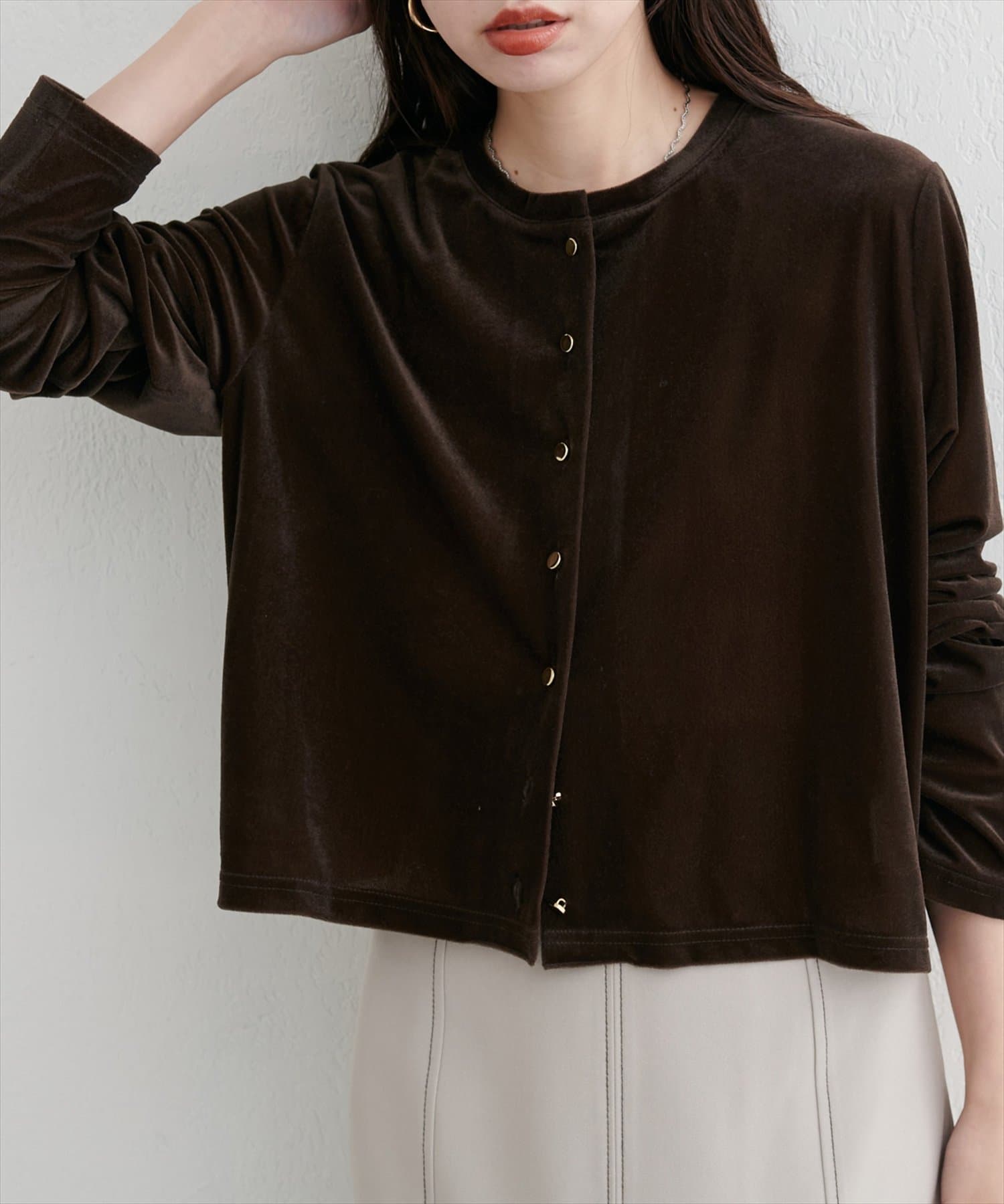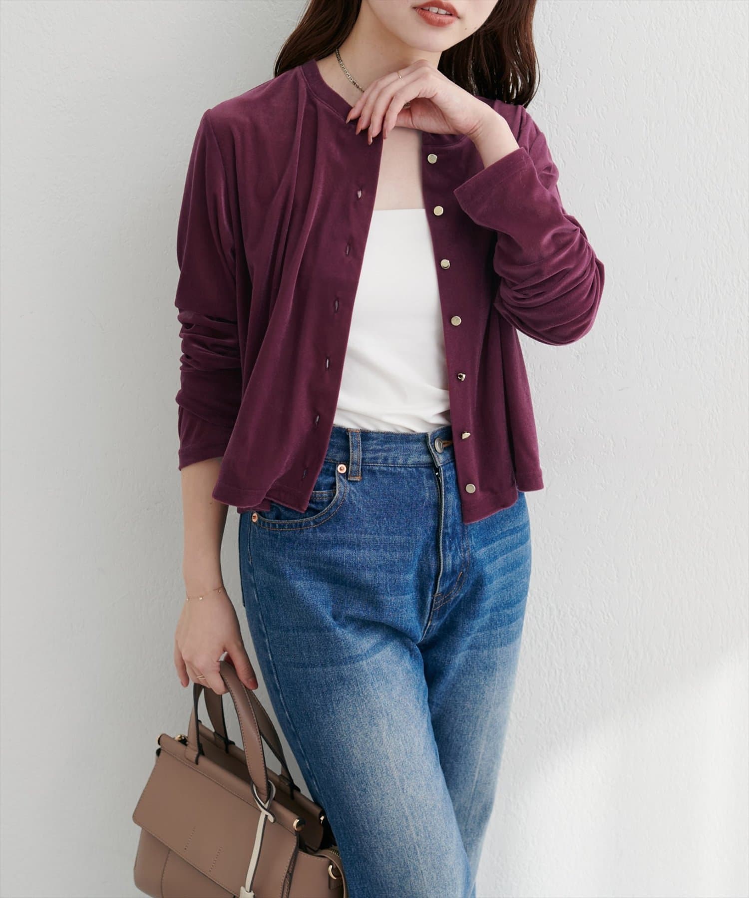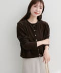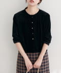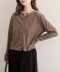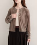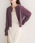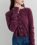 上品な光沢を放つベロア素材が、大人の女性らしさを引き立てるカーディガン。