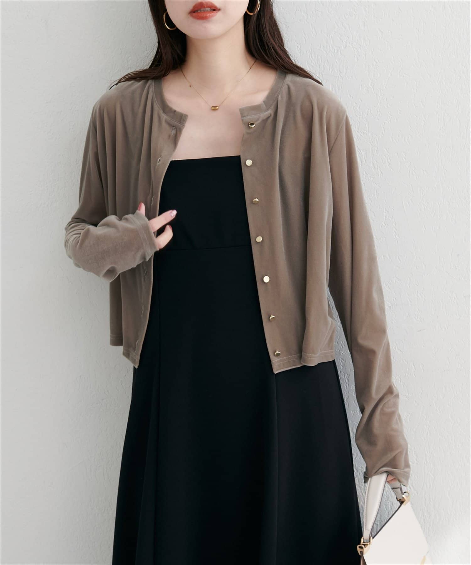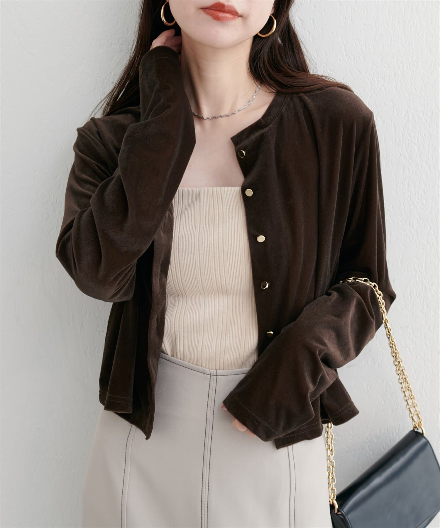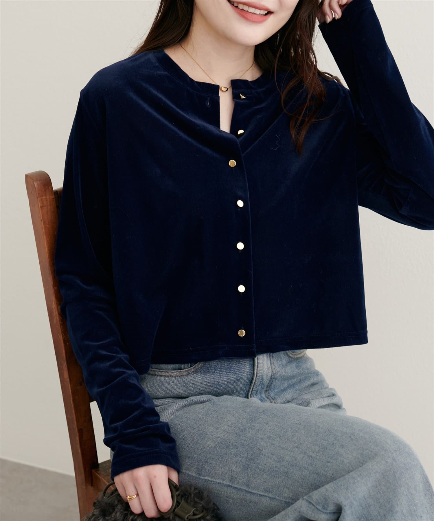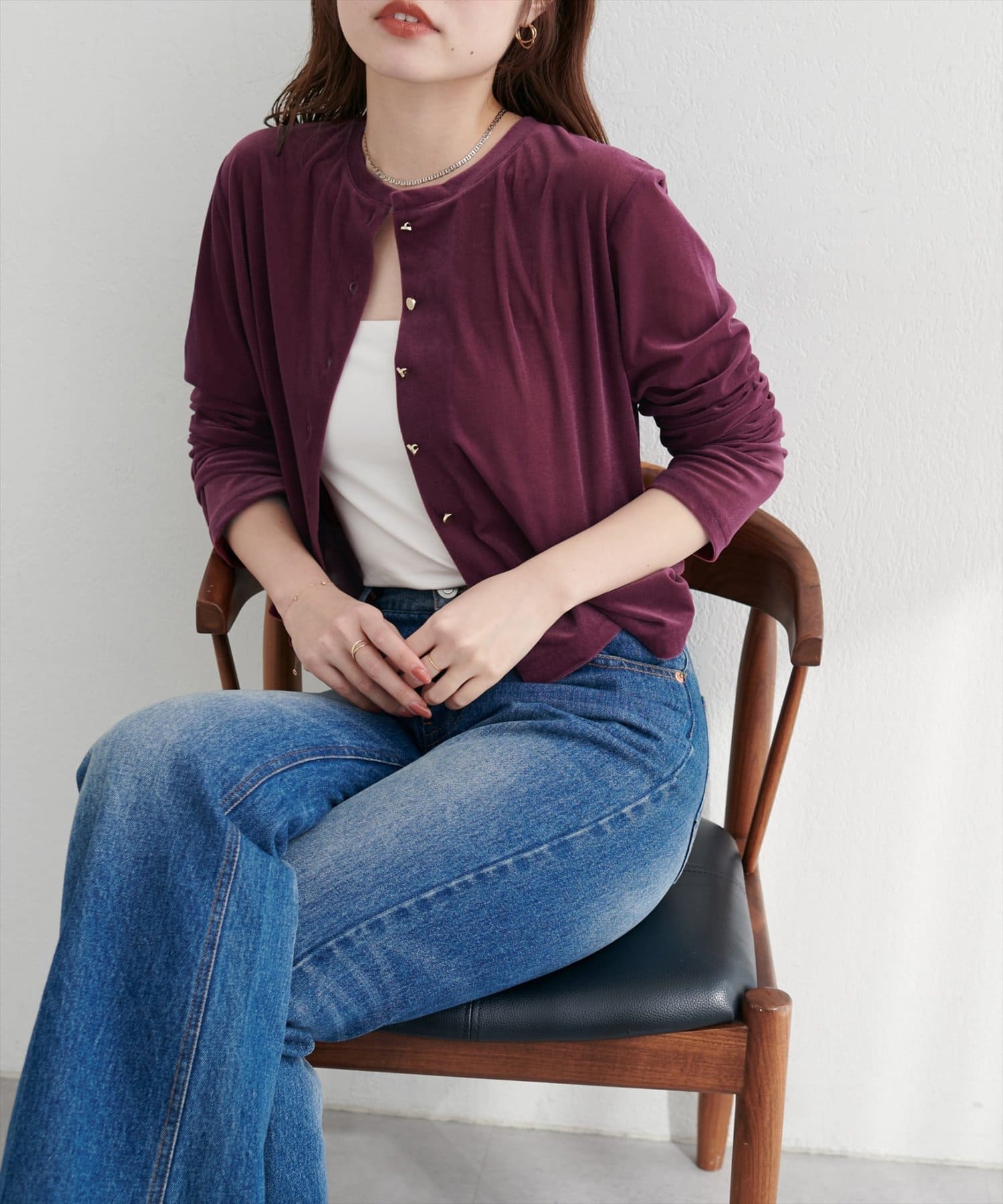 上品な光沢を放つベロア素材が、大人の女性らしさを引き立てるカーディガン。