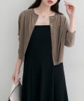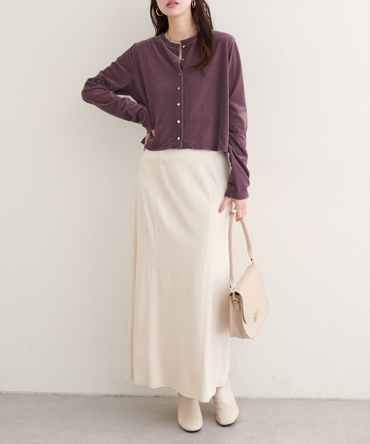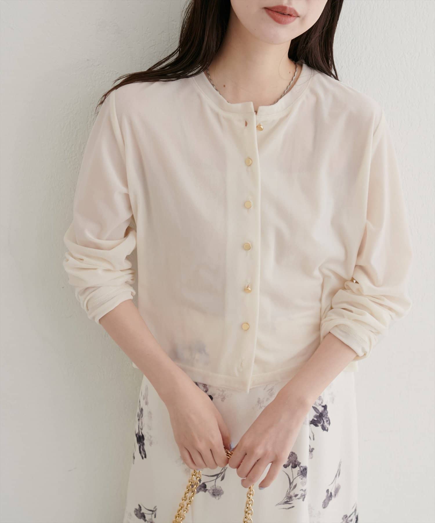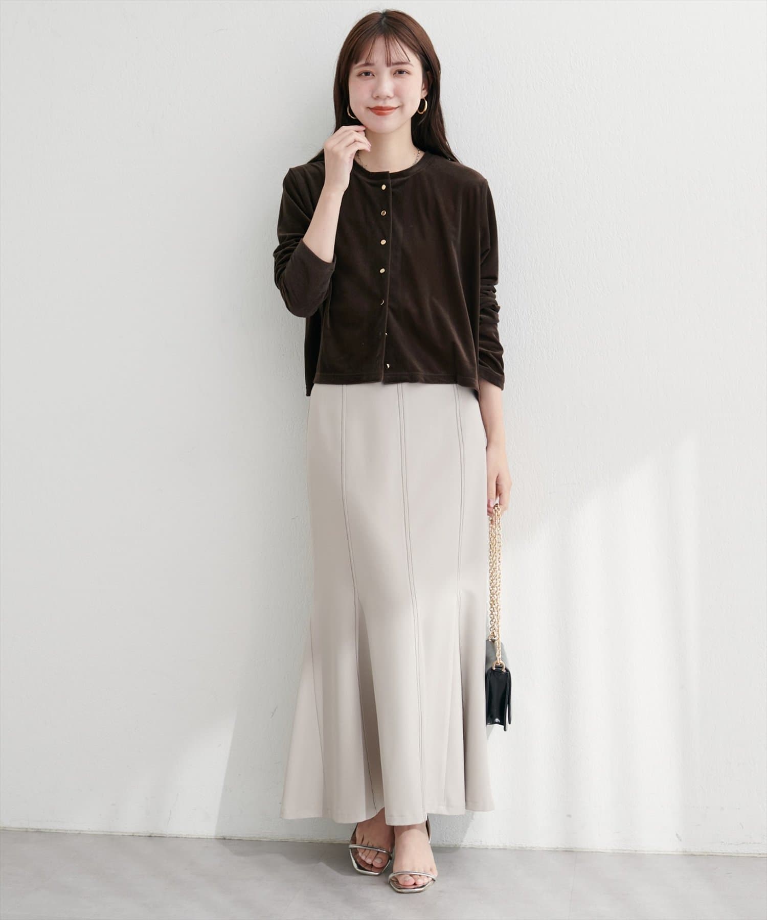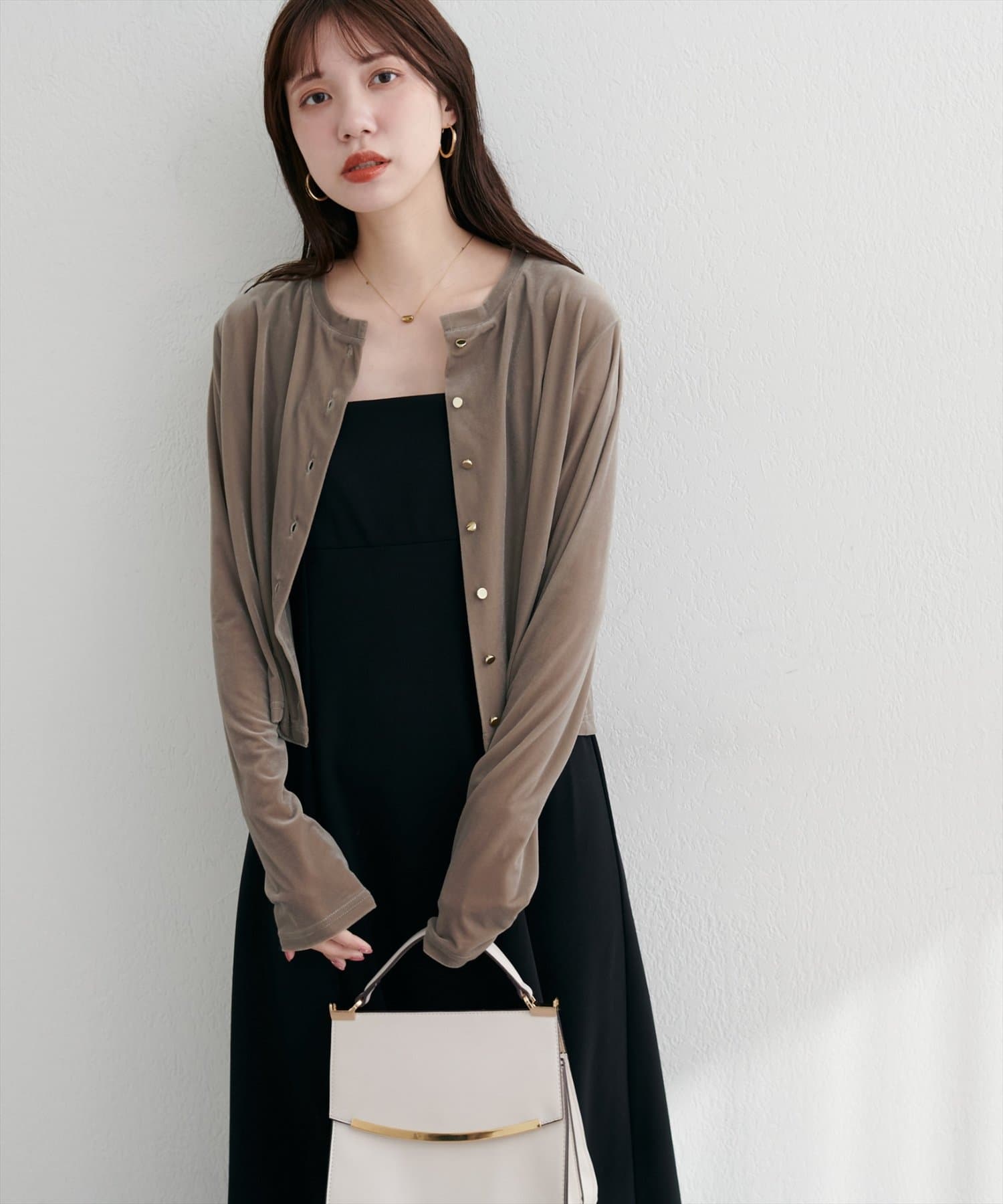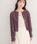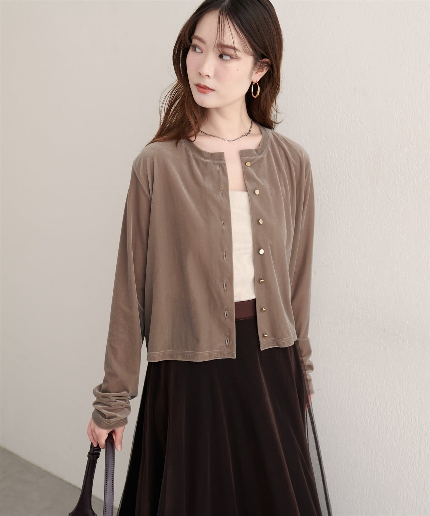 上品な光沢を放つベロア素材が、大人の女性らしさを引き立てるカーディガン。
