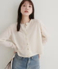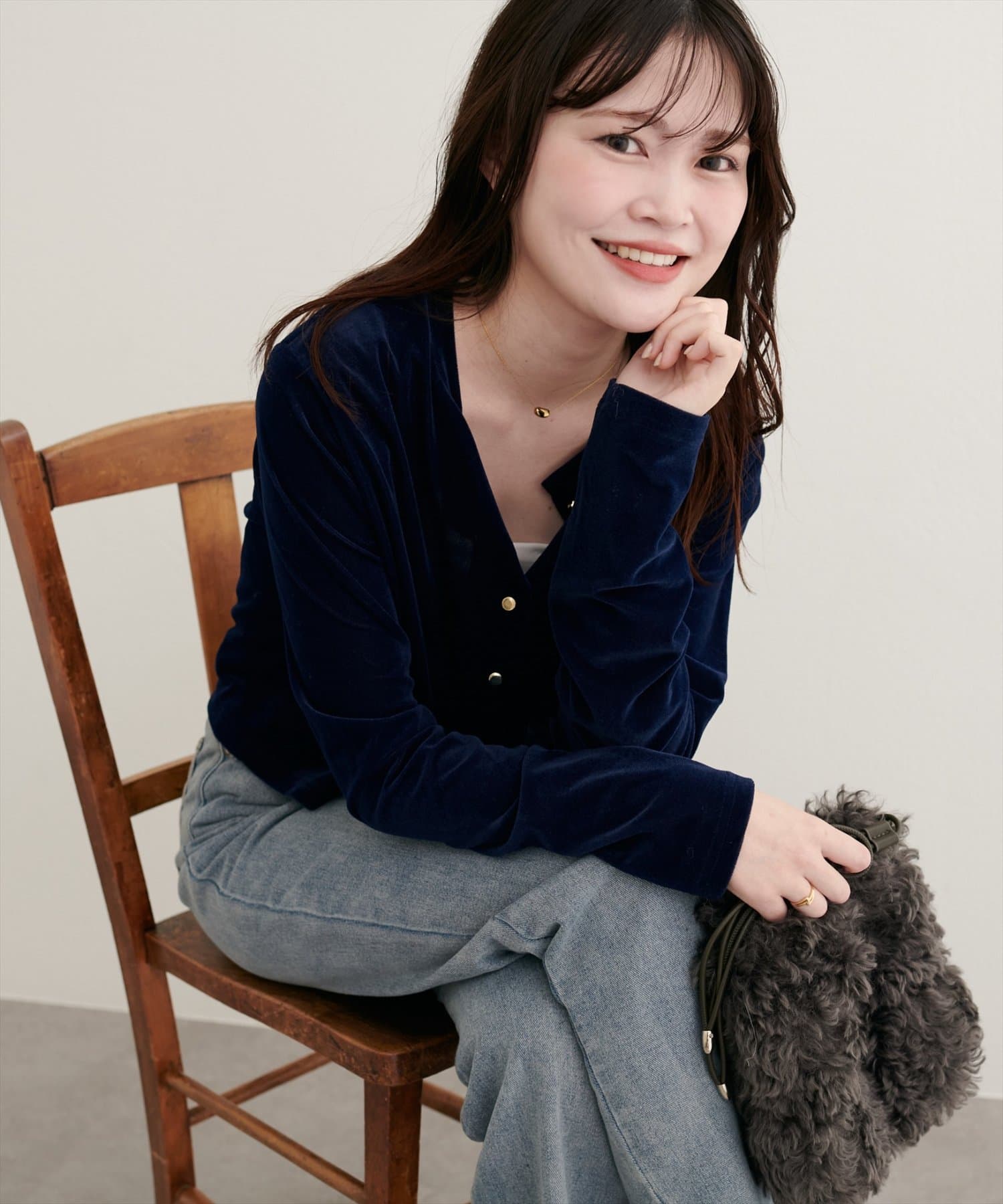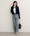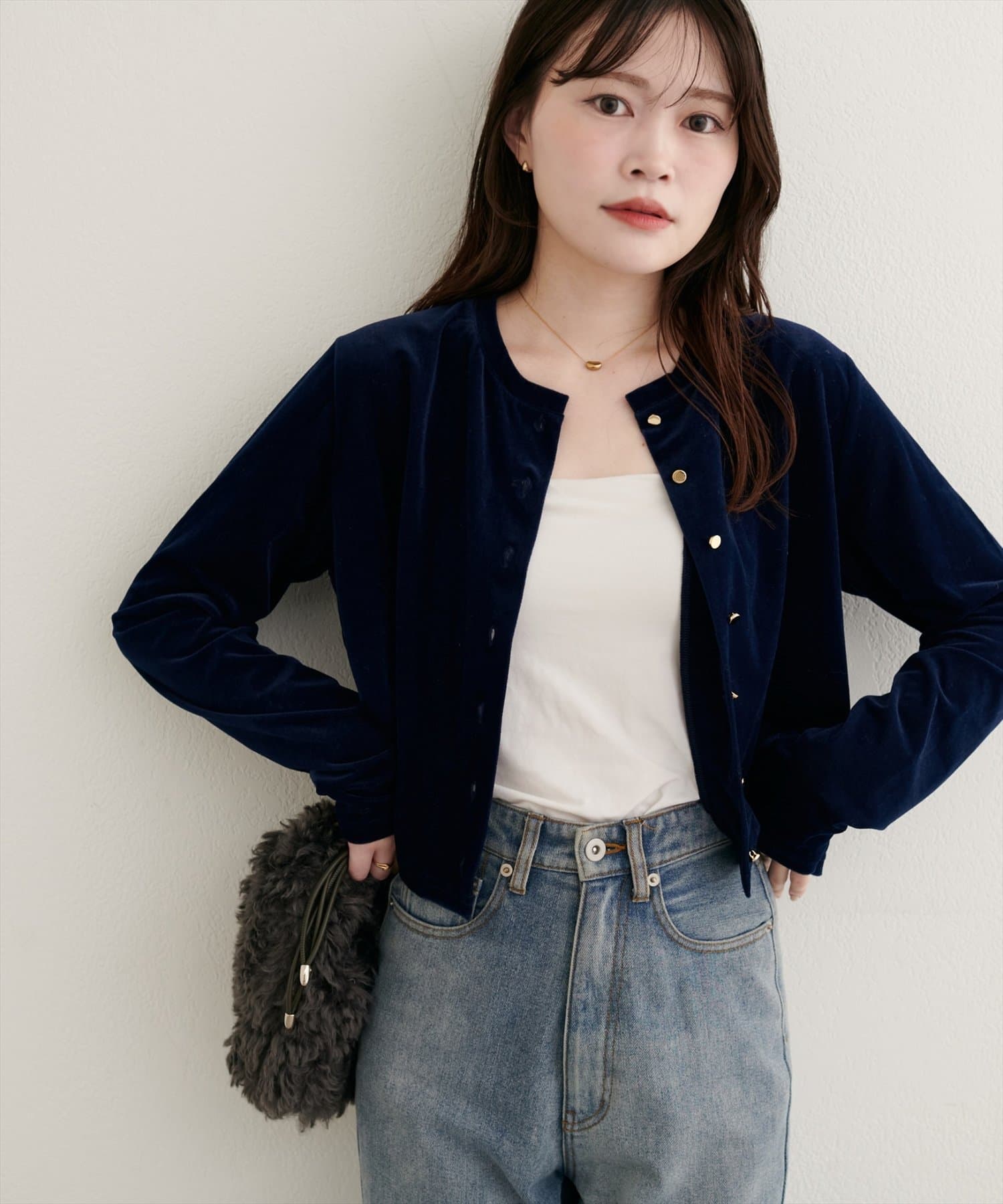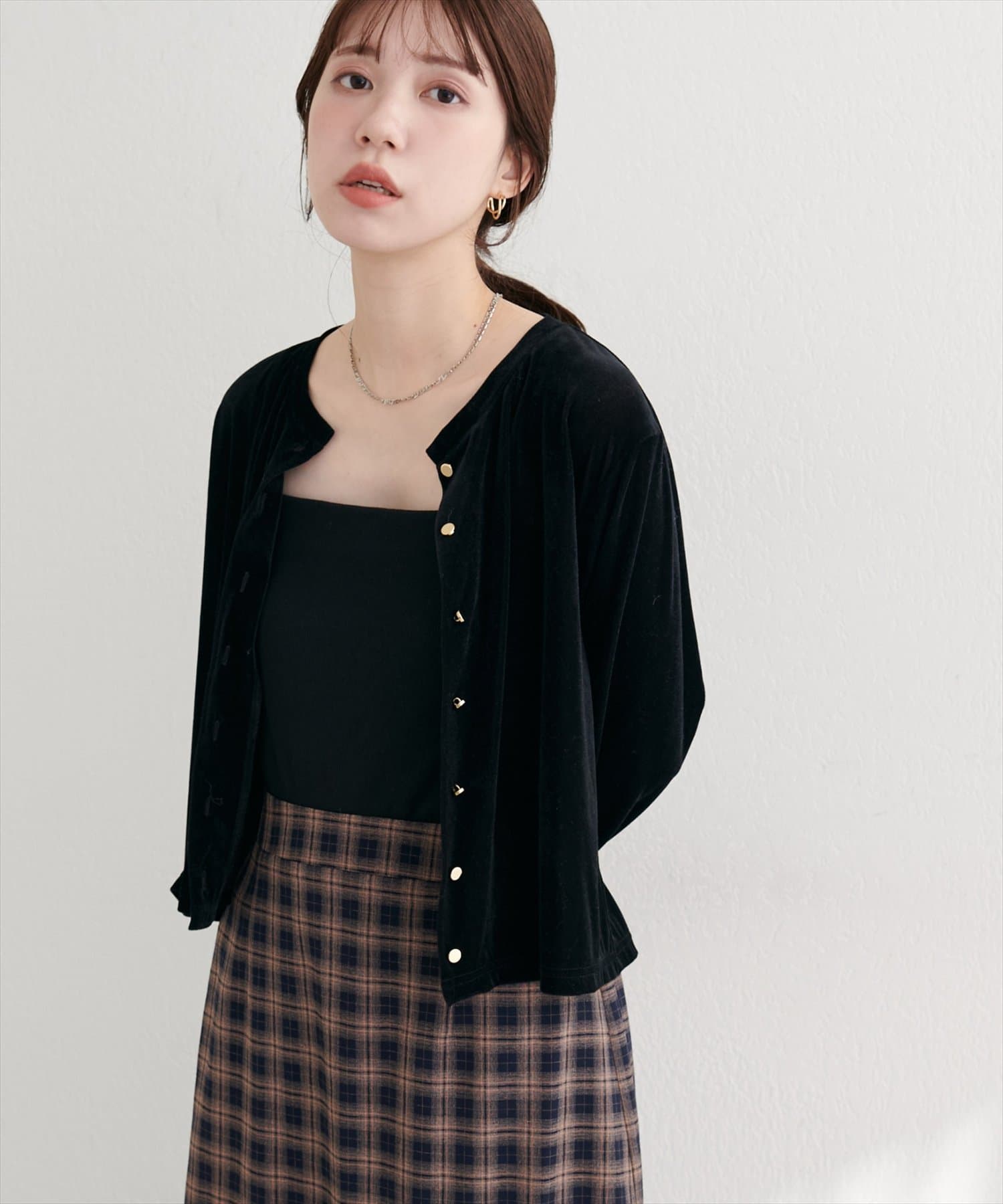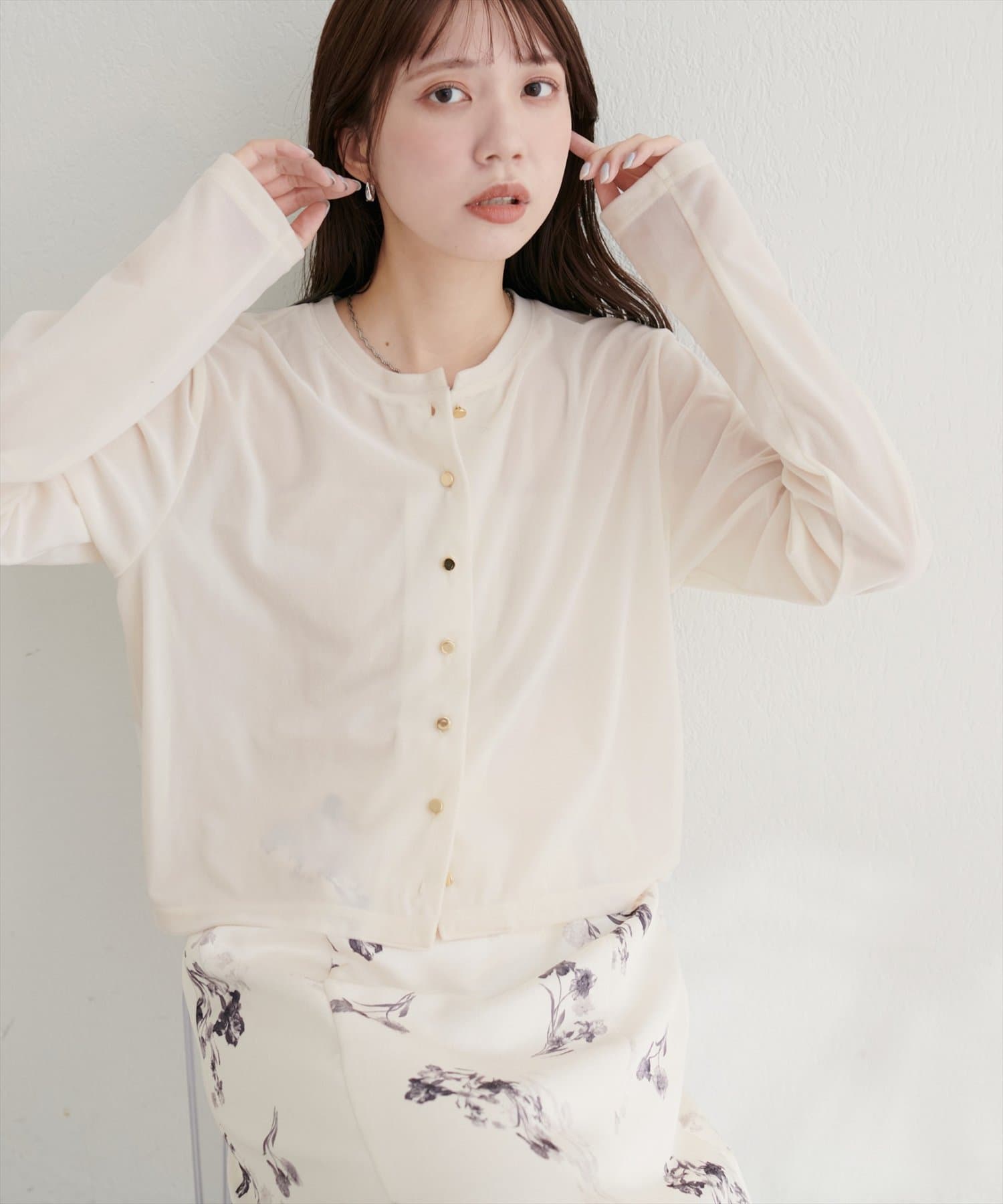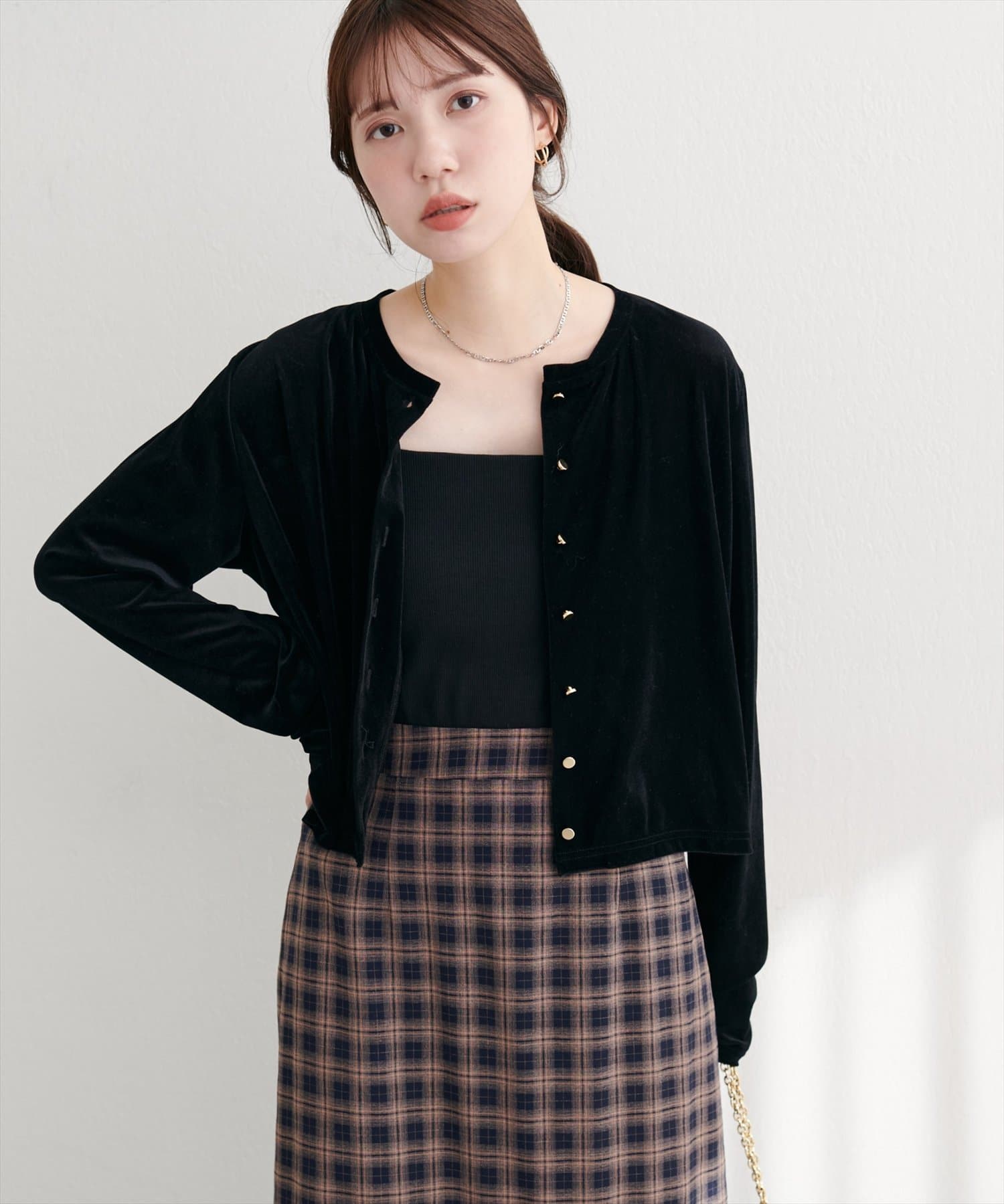上品な光沢を放つベロア素材が、大人の女性らしさを引き立てるカーディガン。