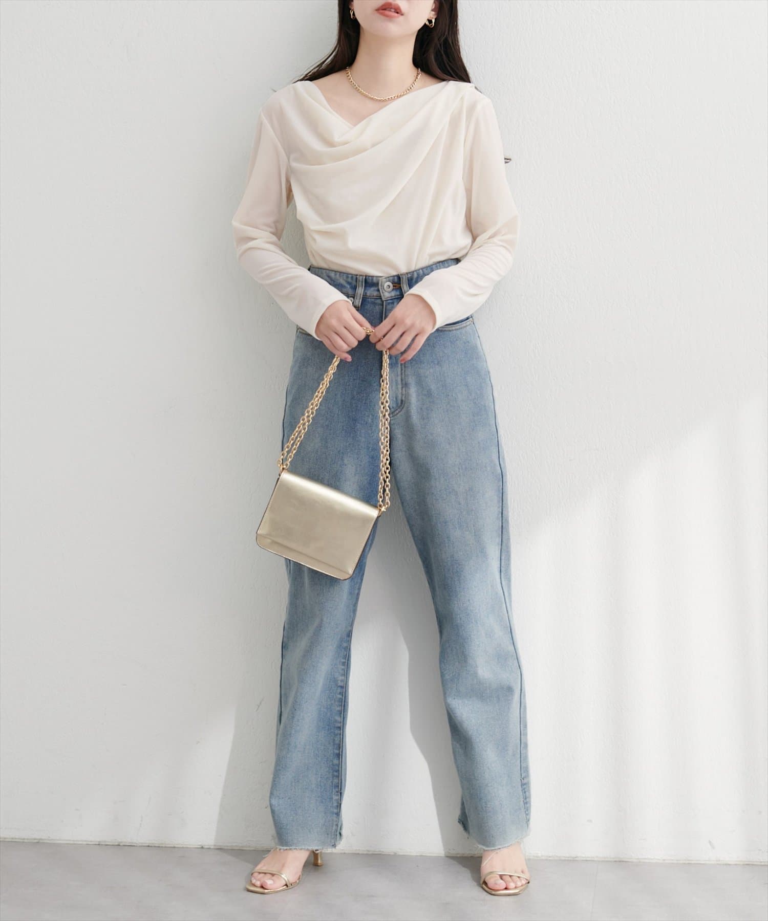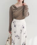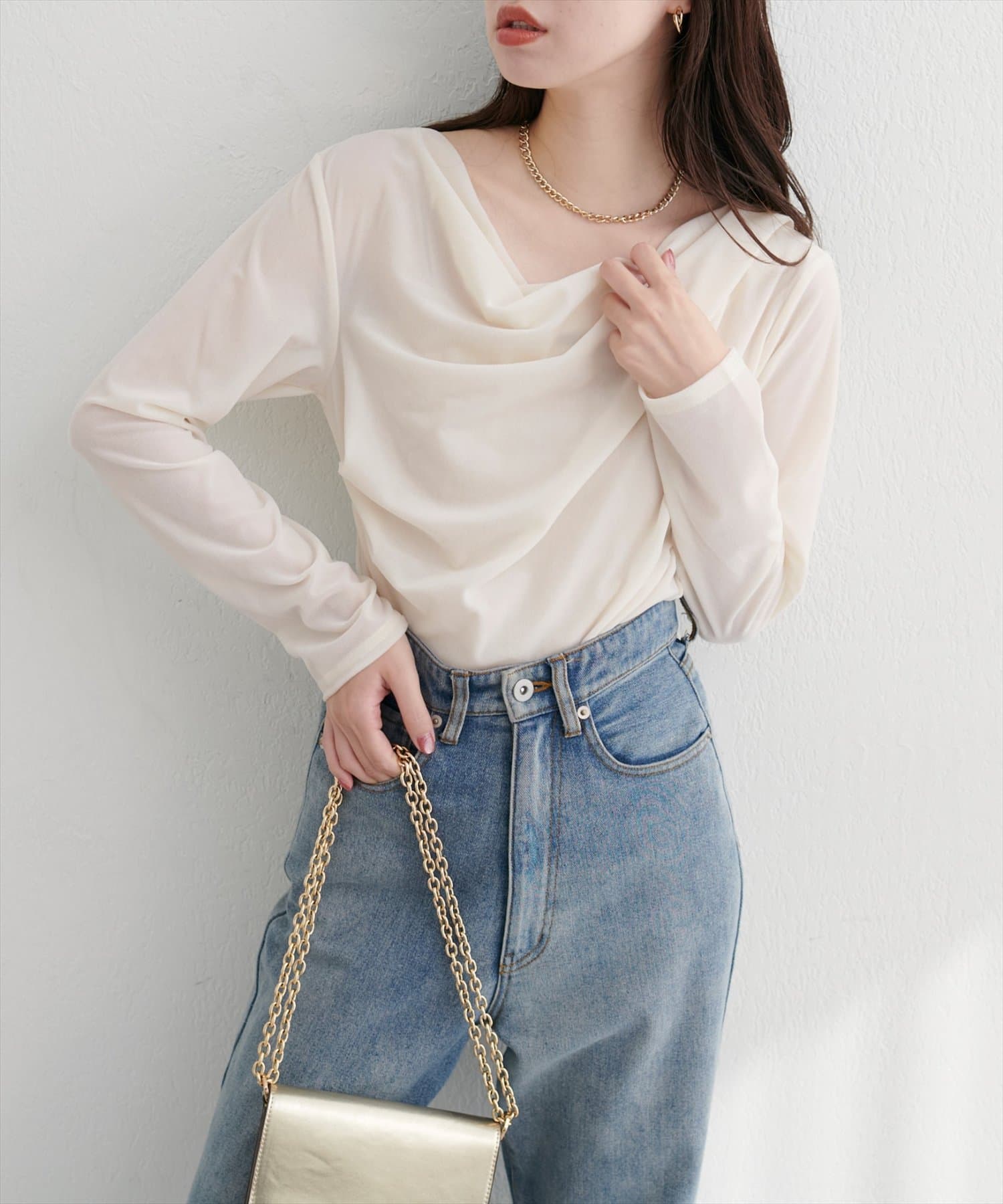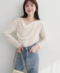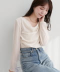 デコルテを美しく見せるドレープネックは、顔まわりを華やかに演出し、女性らしい雰囲気を高めます。