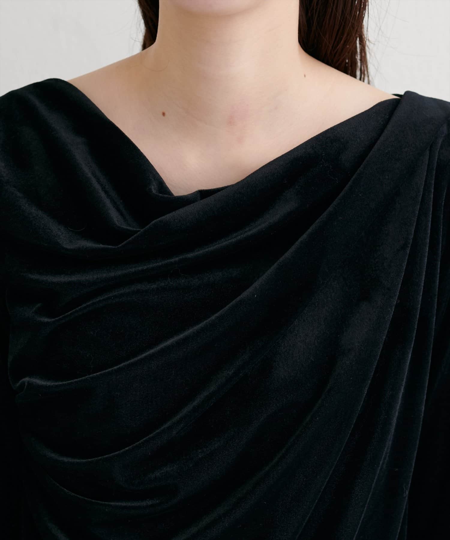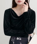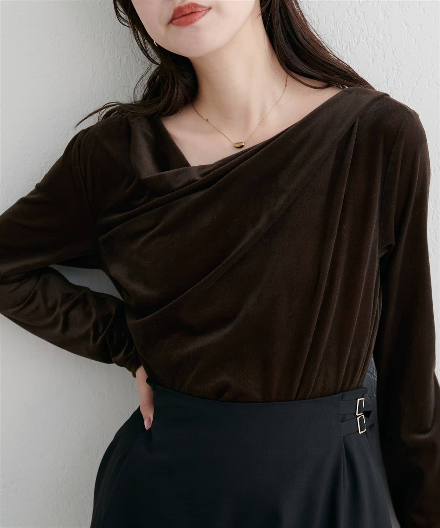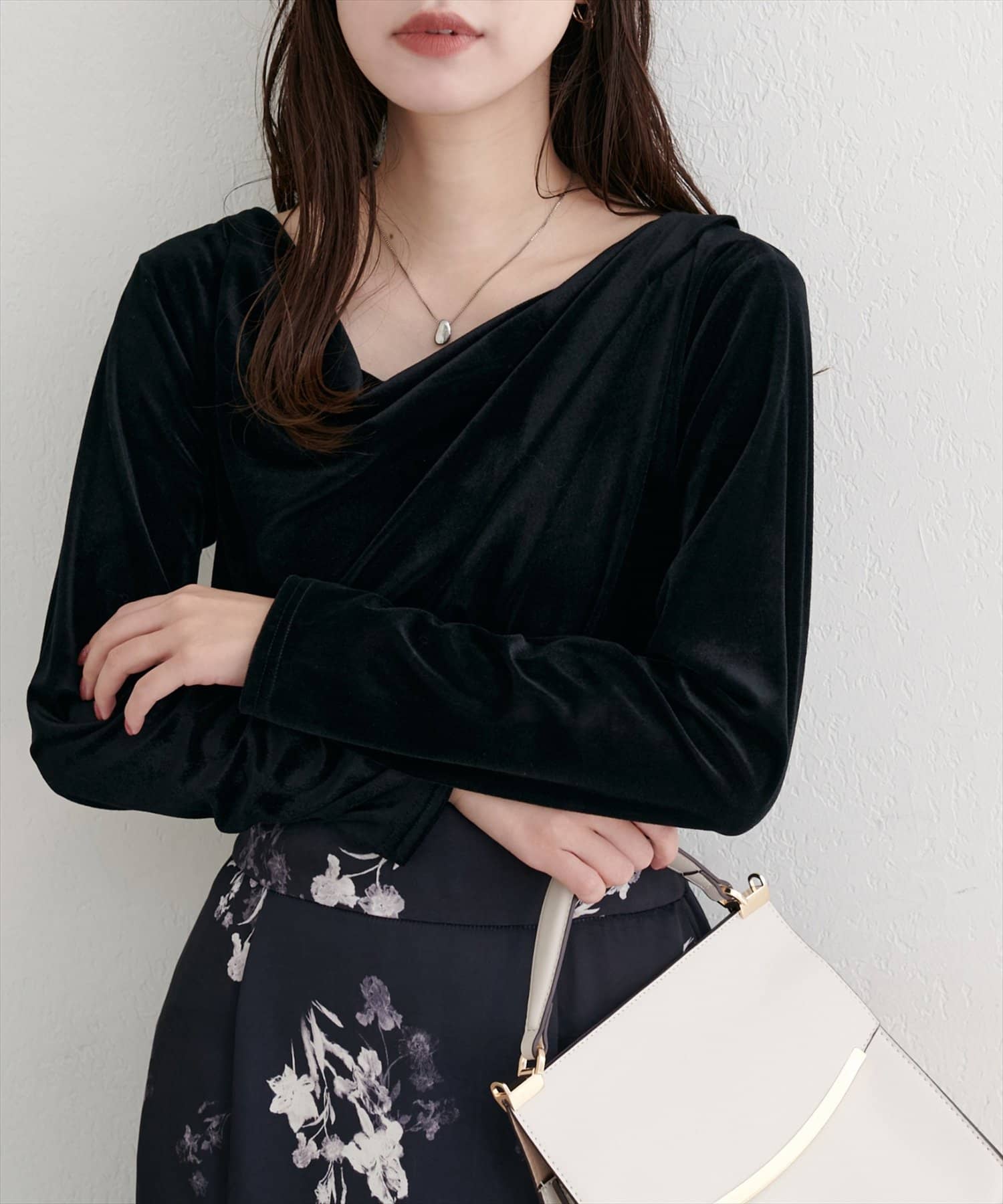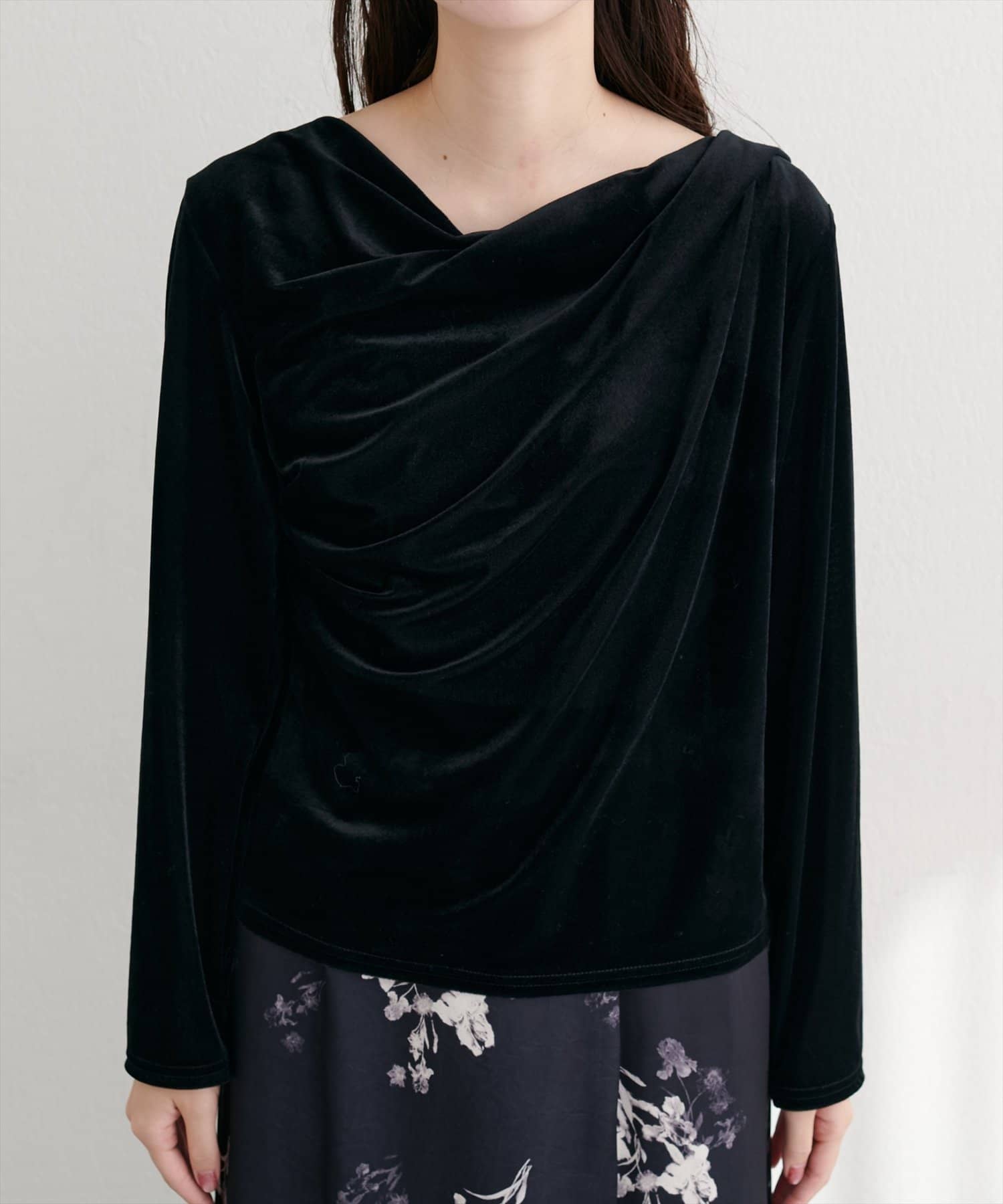 大人の抜け感を演出する、ドレープネックのベロアトップス。