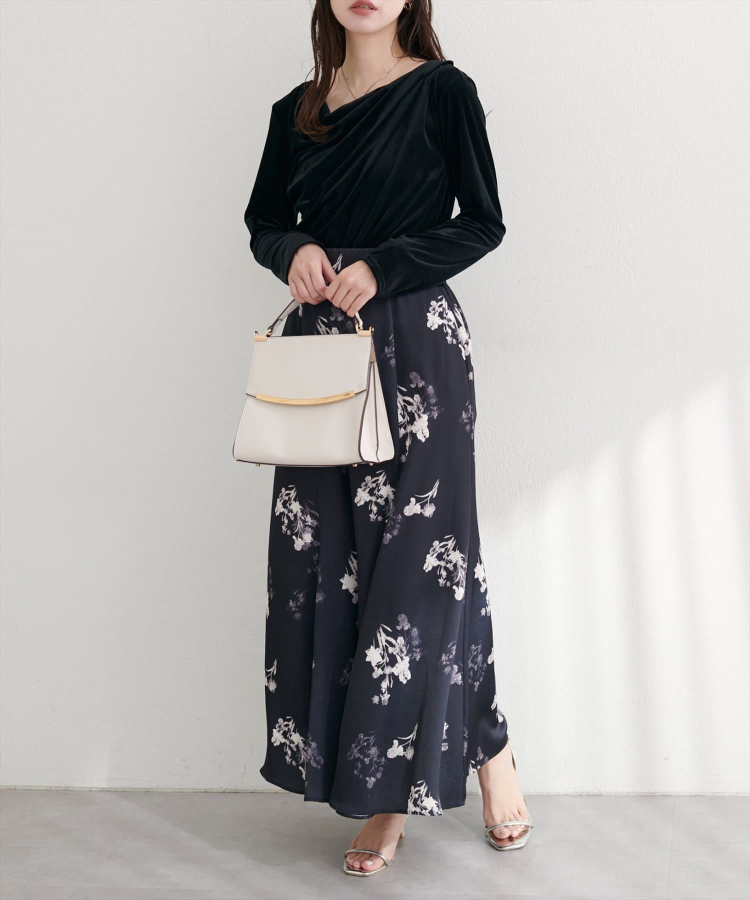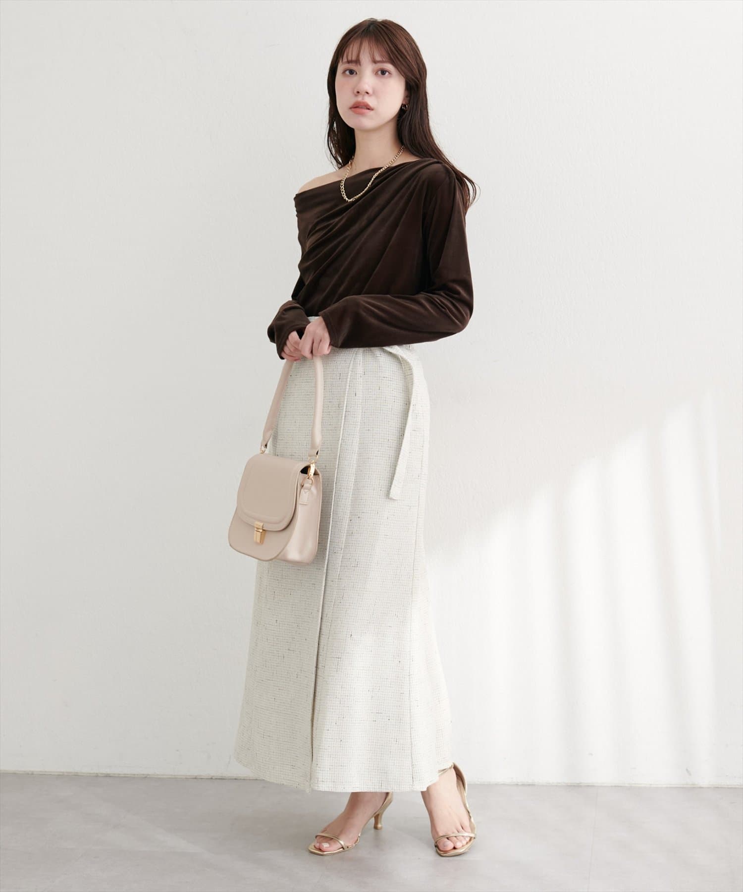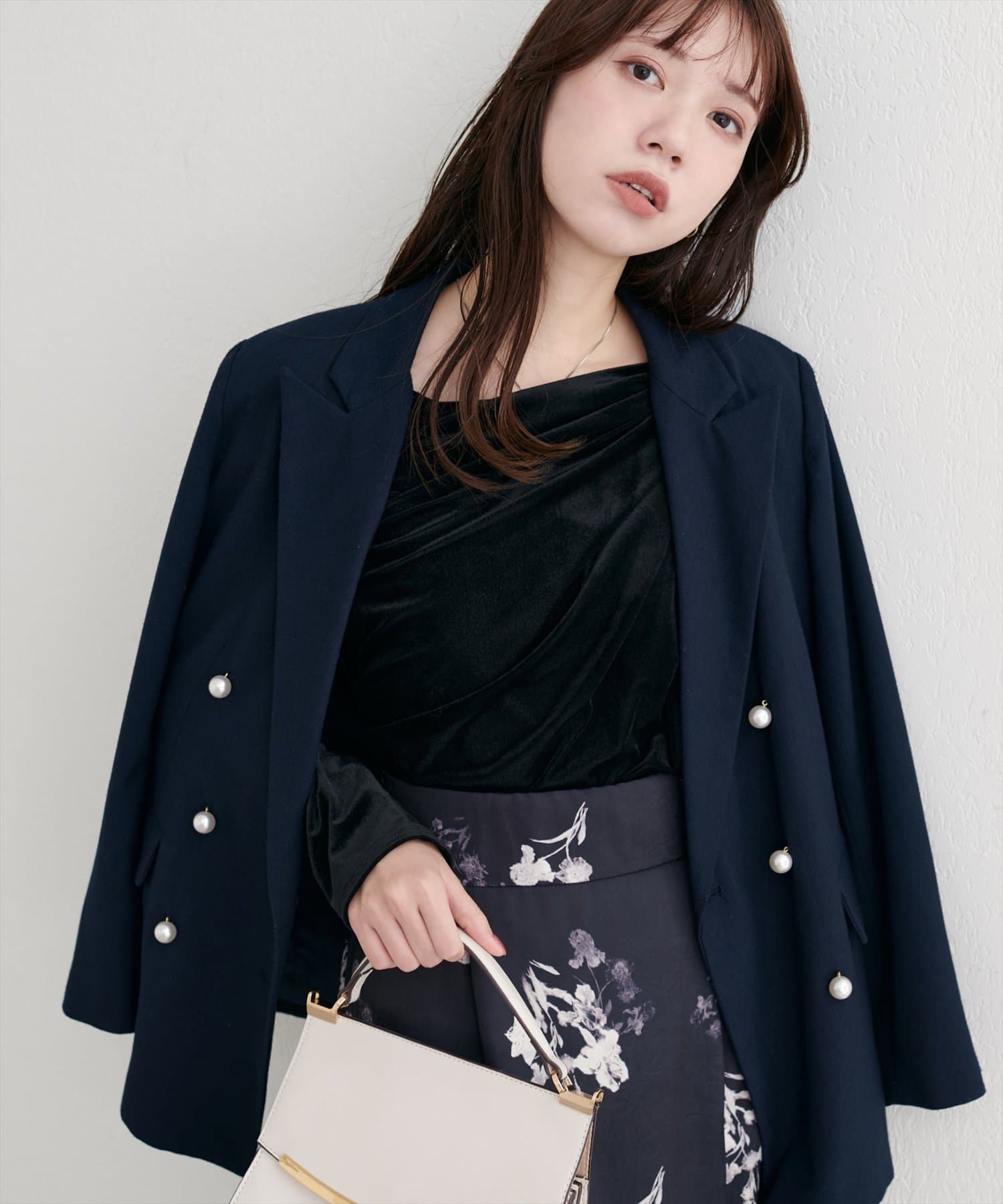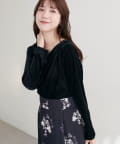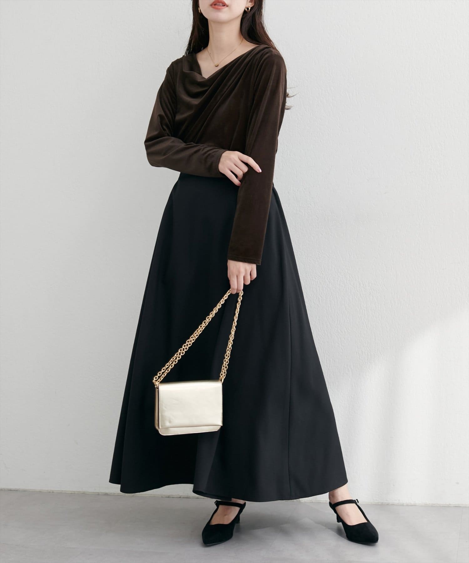 大人の抜け感を演出する、ドレープネックのベロアトップス。
