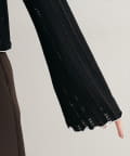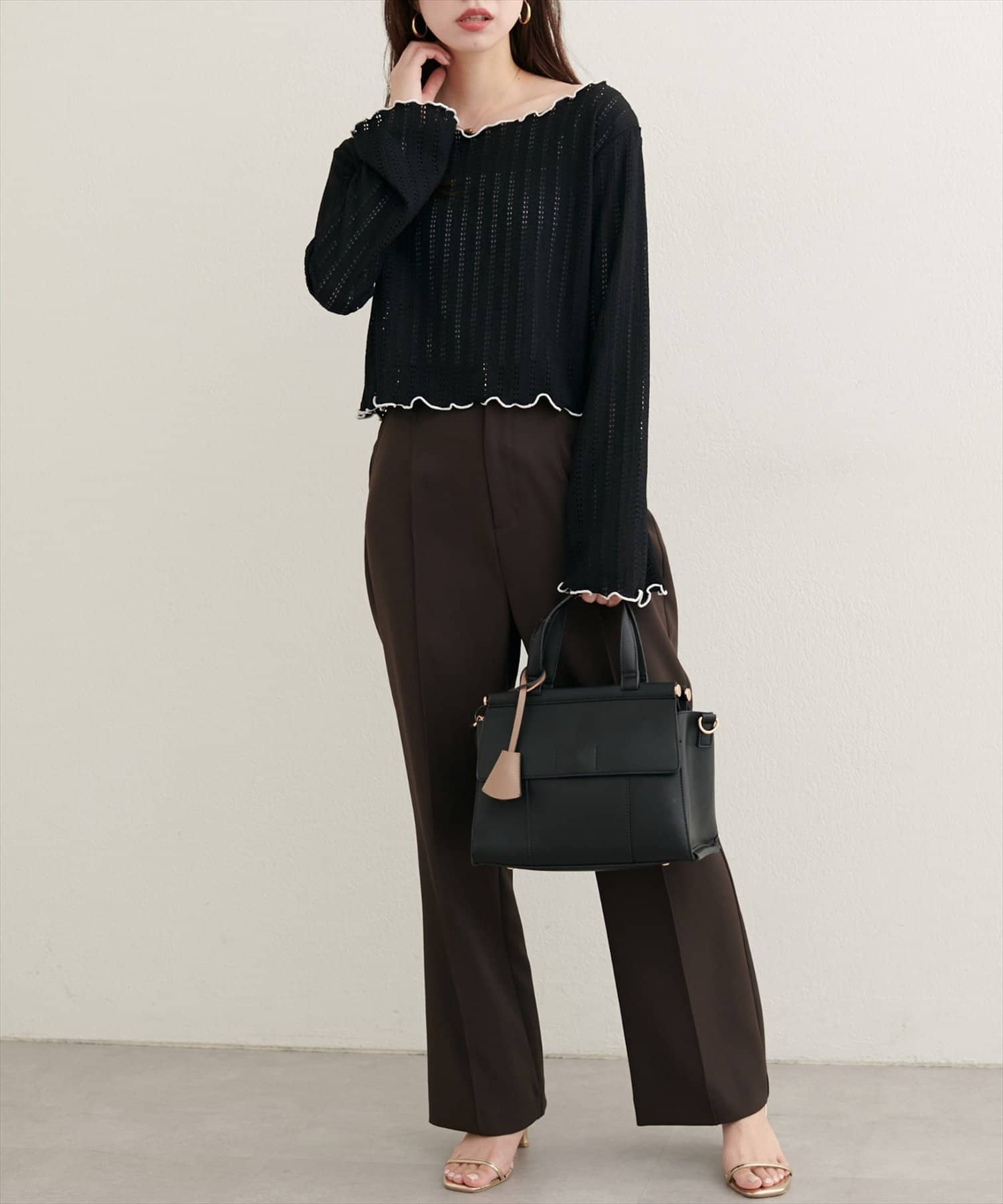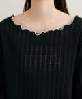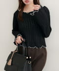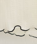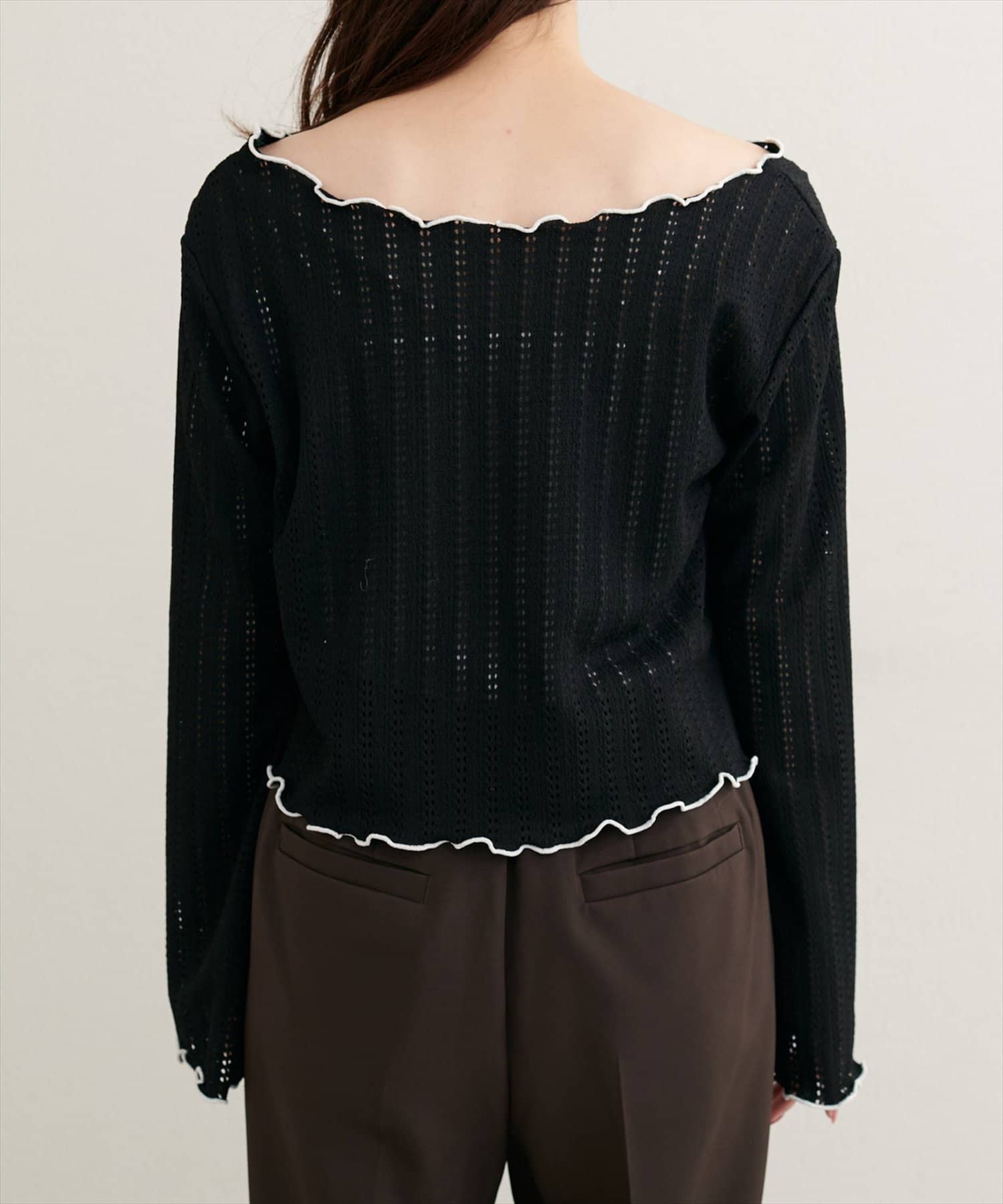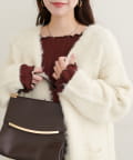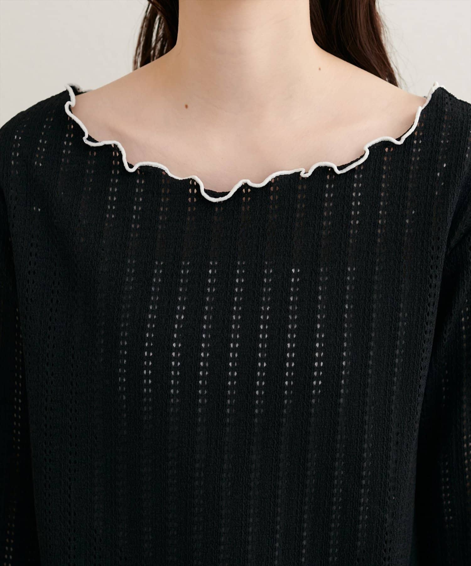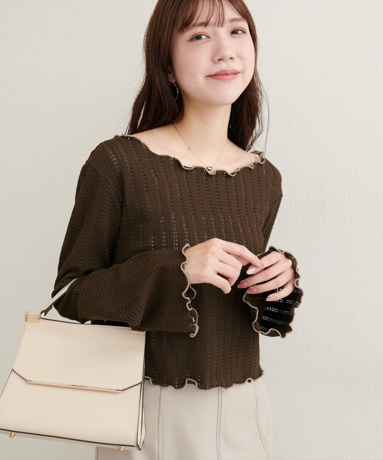 ネックと袖口のメロウフリルが、フェミニンな印象をプラス。
