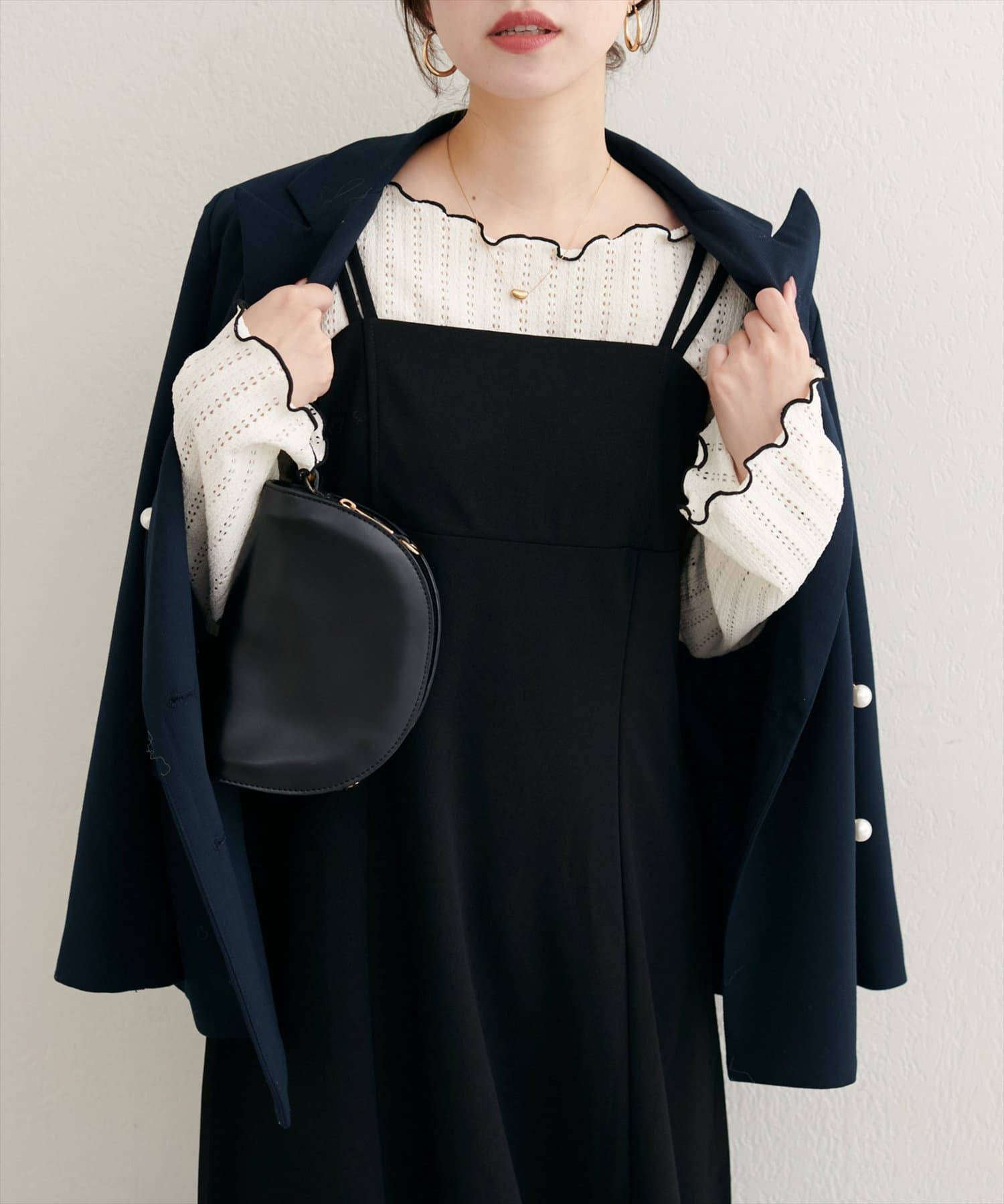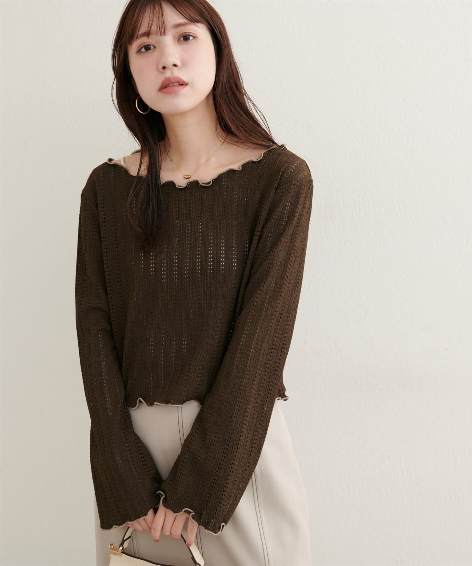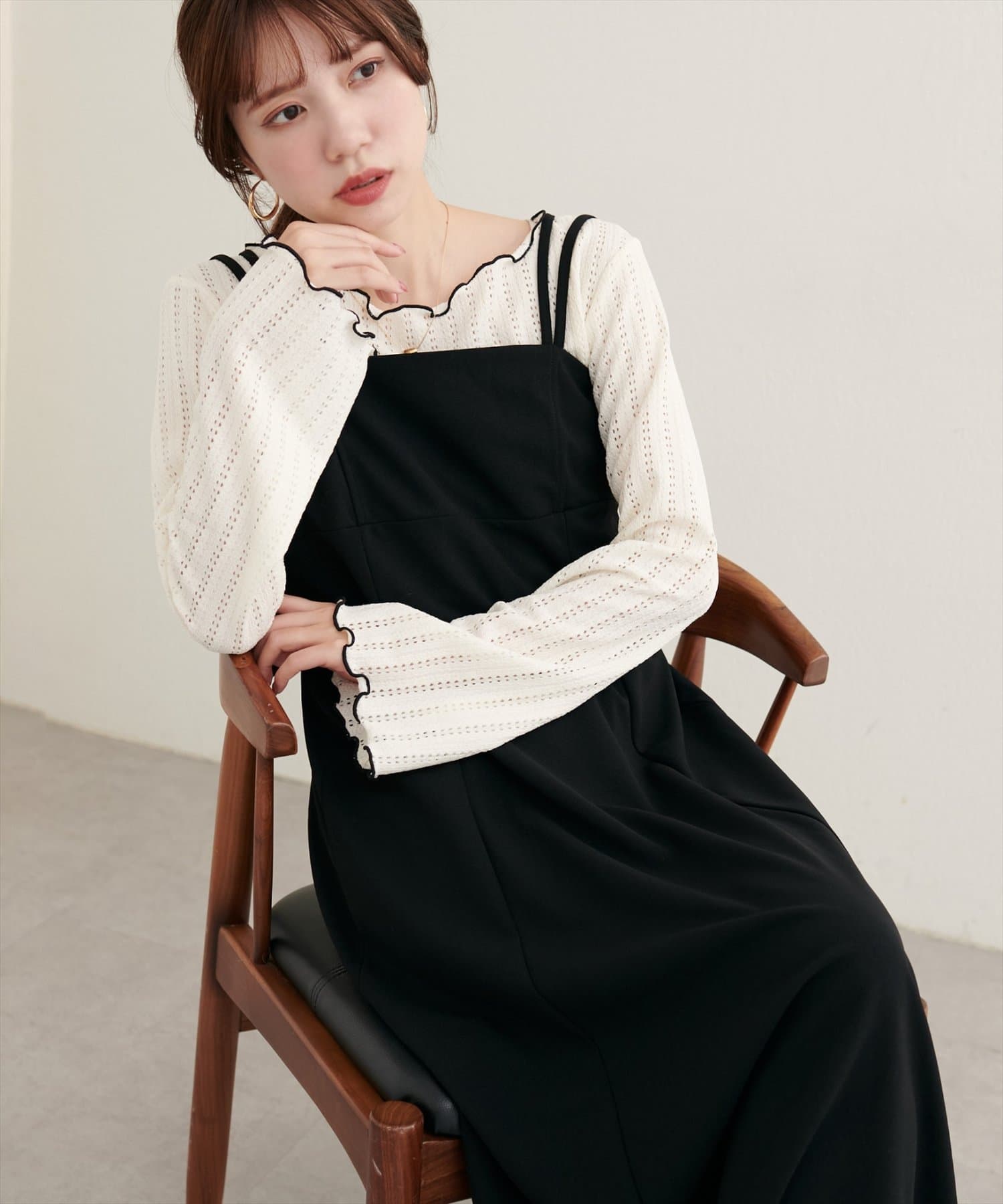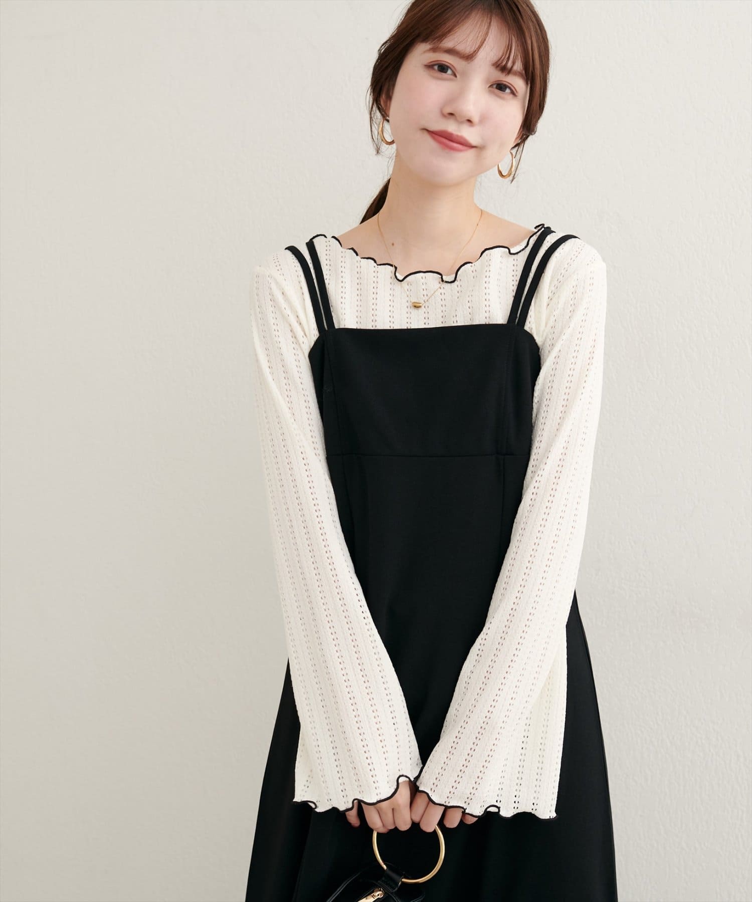 カーディガンやキャミワンピースにインナーとして合わせれば、大人かわいいフェミニンなスタイルに。
