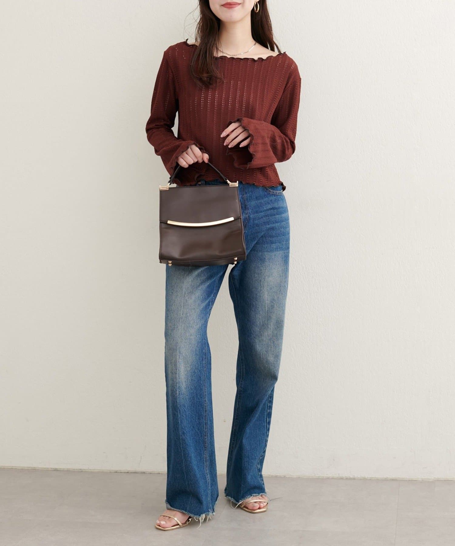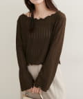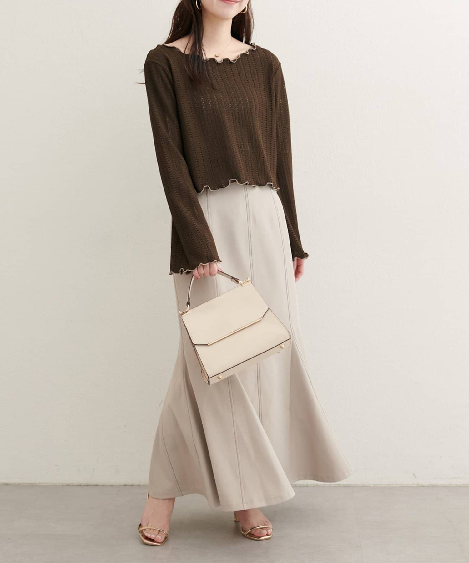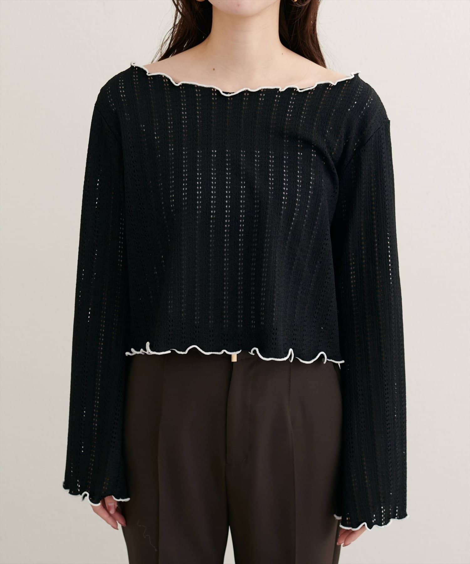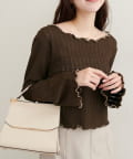 ネックと袖口のメロウフリルが、フェミニンな印象をプラス。