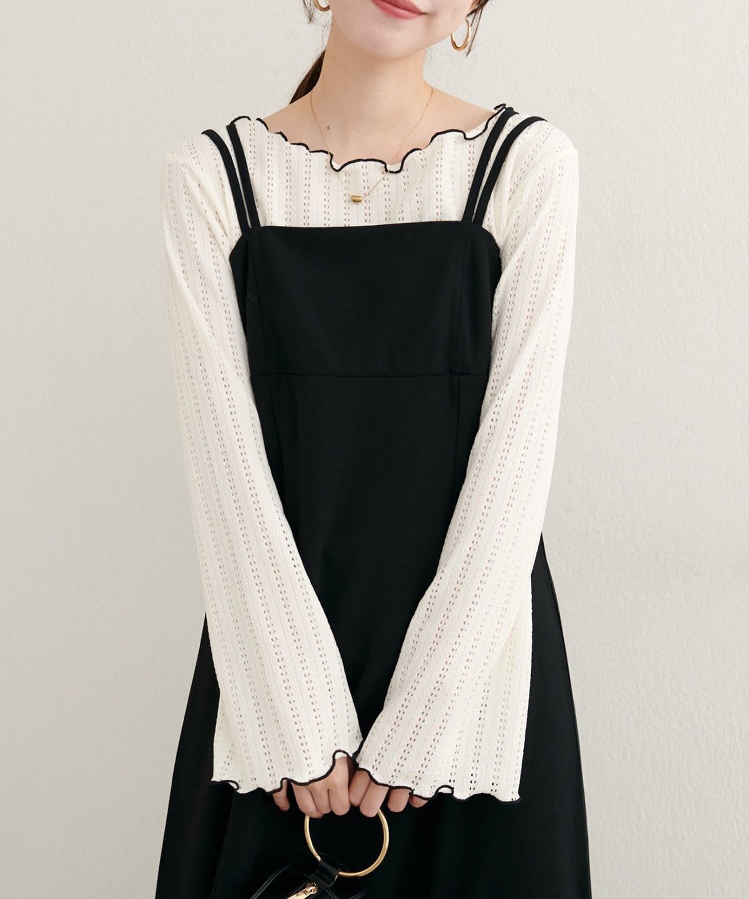 カーディガンやキャミワンピースにインナーとして合わせれば、大人かわいいフェミニンなスタイルに。
