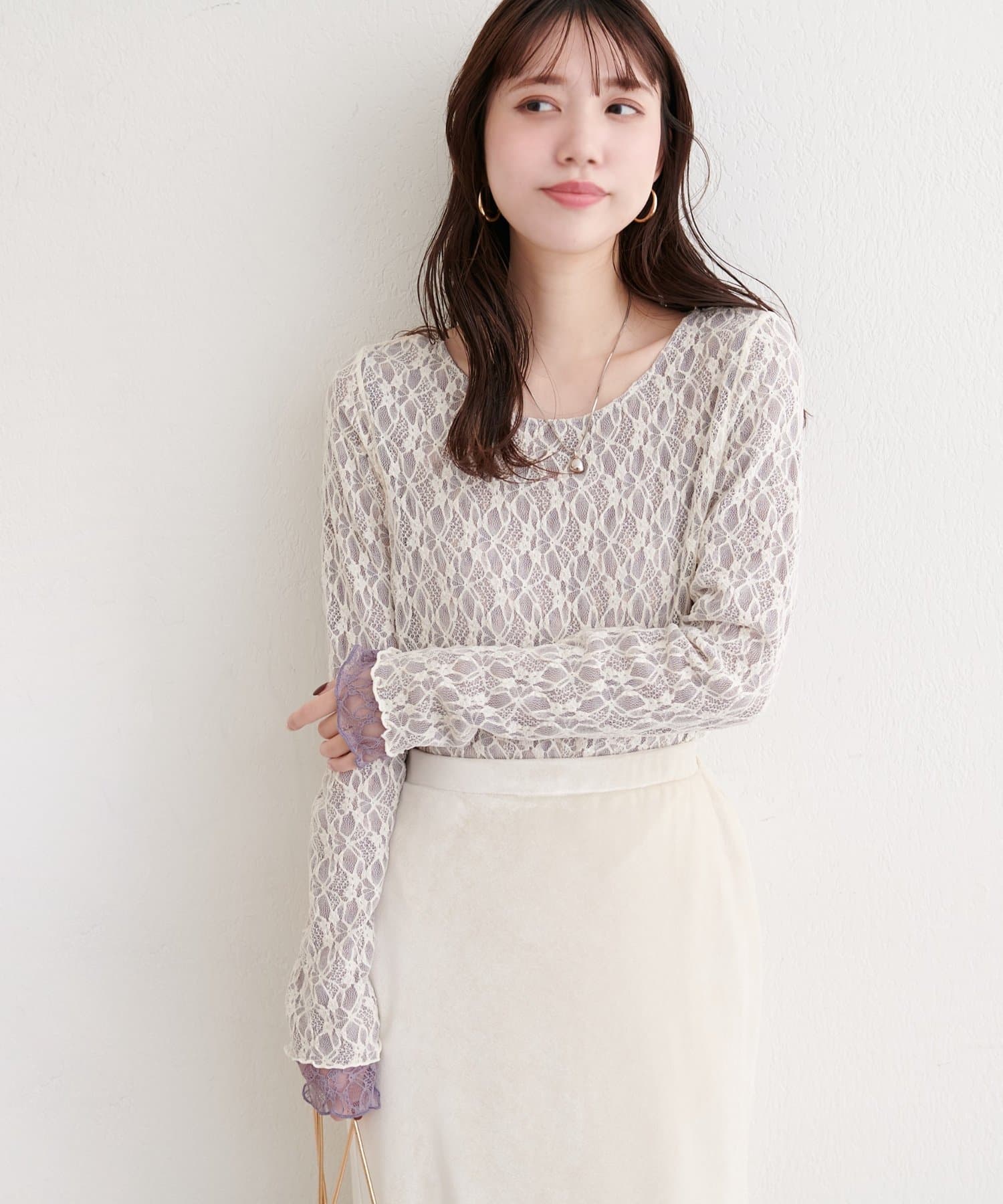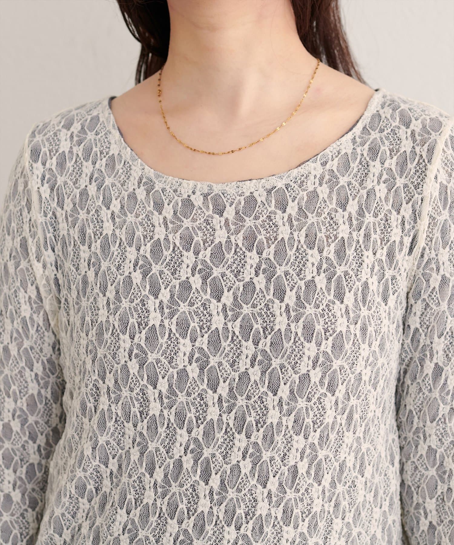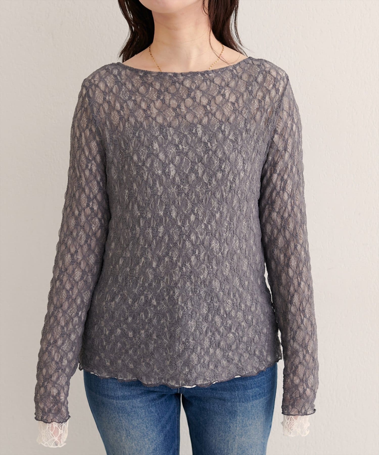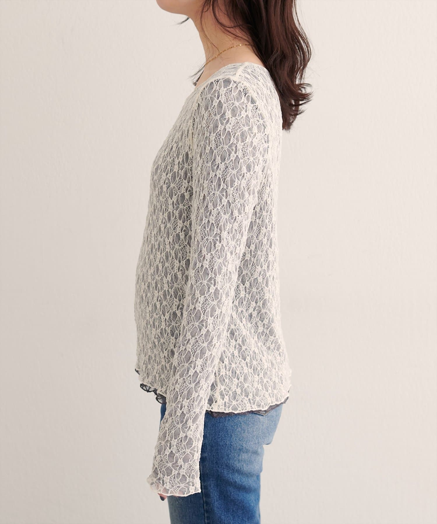 上品な肌見せが、女性らしさを引き立てます。袖口のさりげないレース使いもポイント。