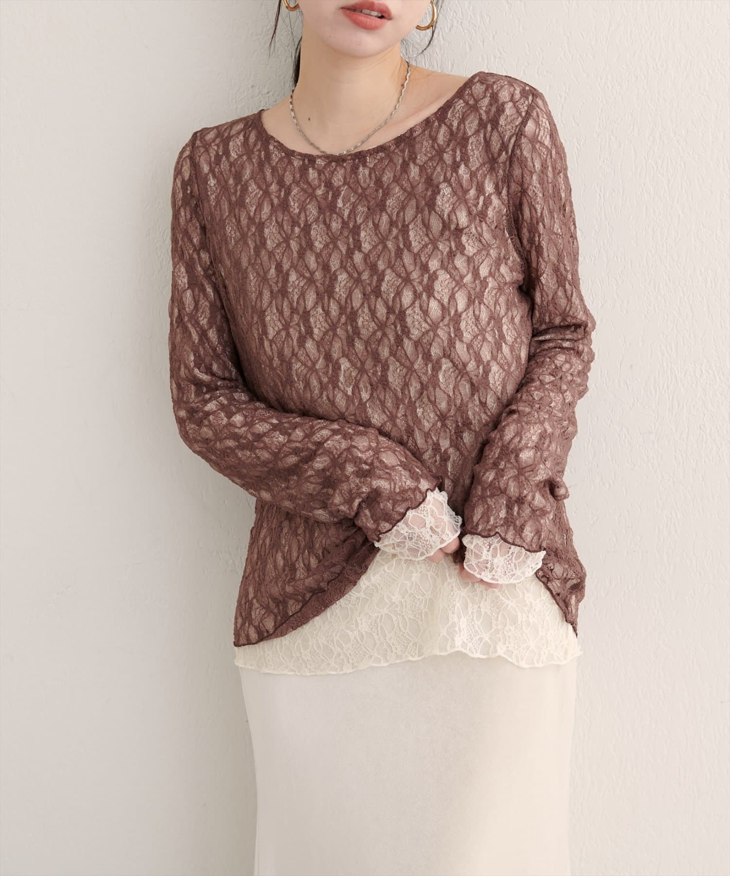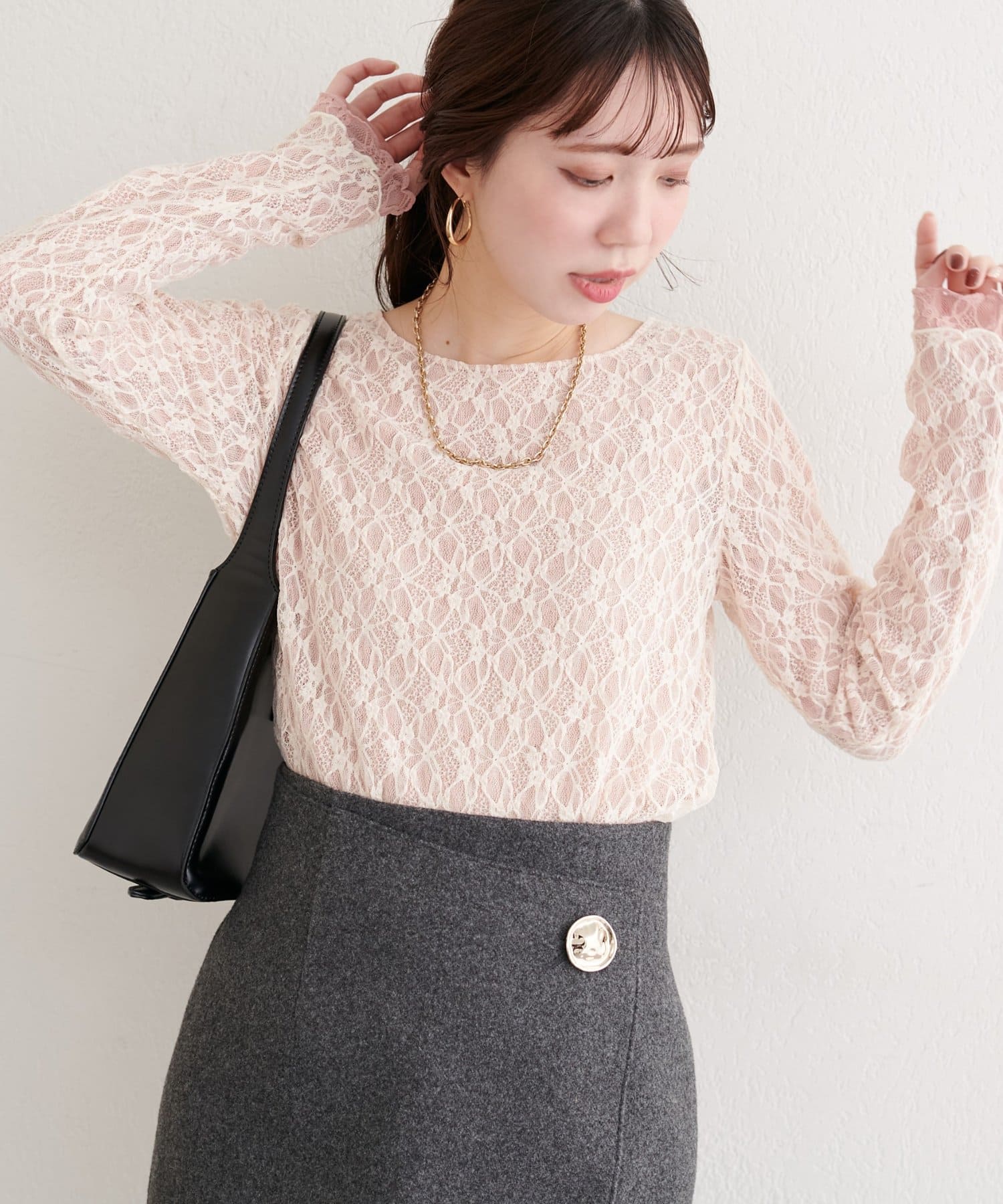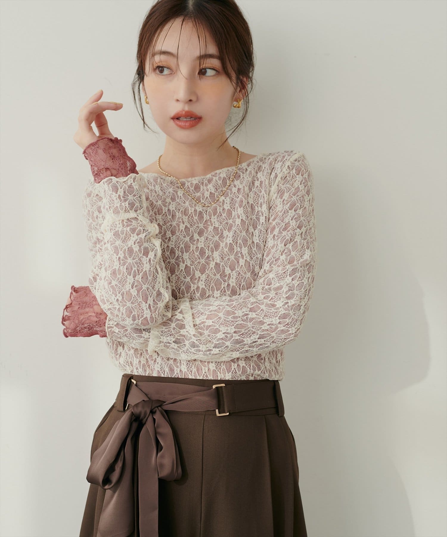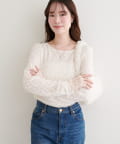 上品な肌見せが、女性らしさを引き立てます。袖口のさりげないレース使いもポイント。