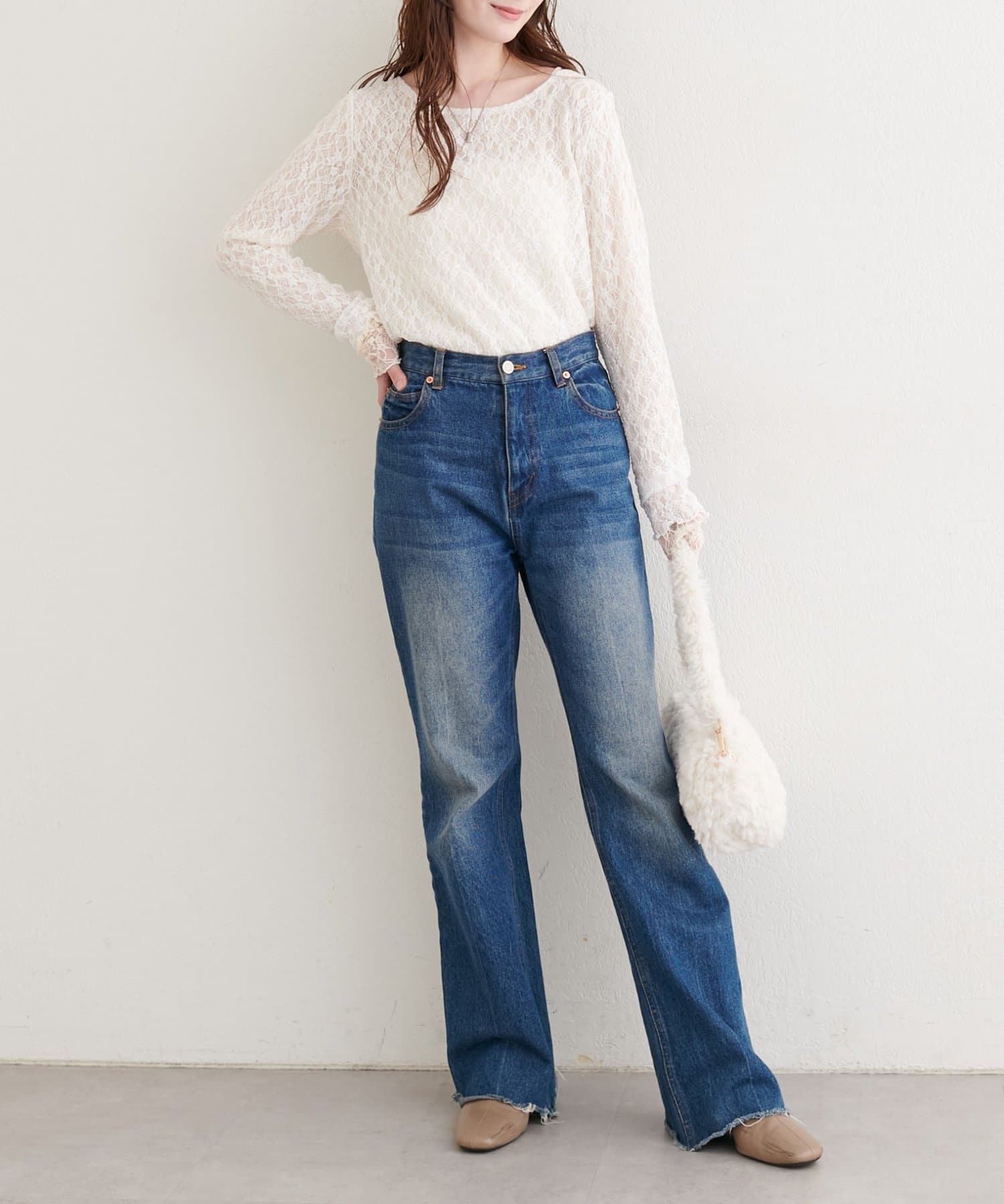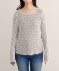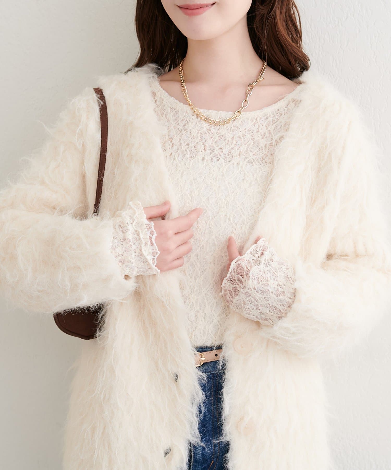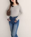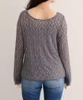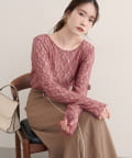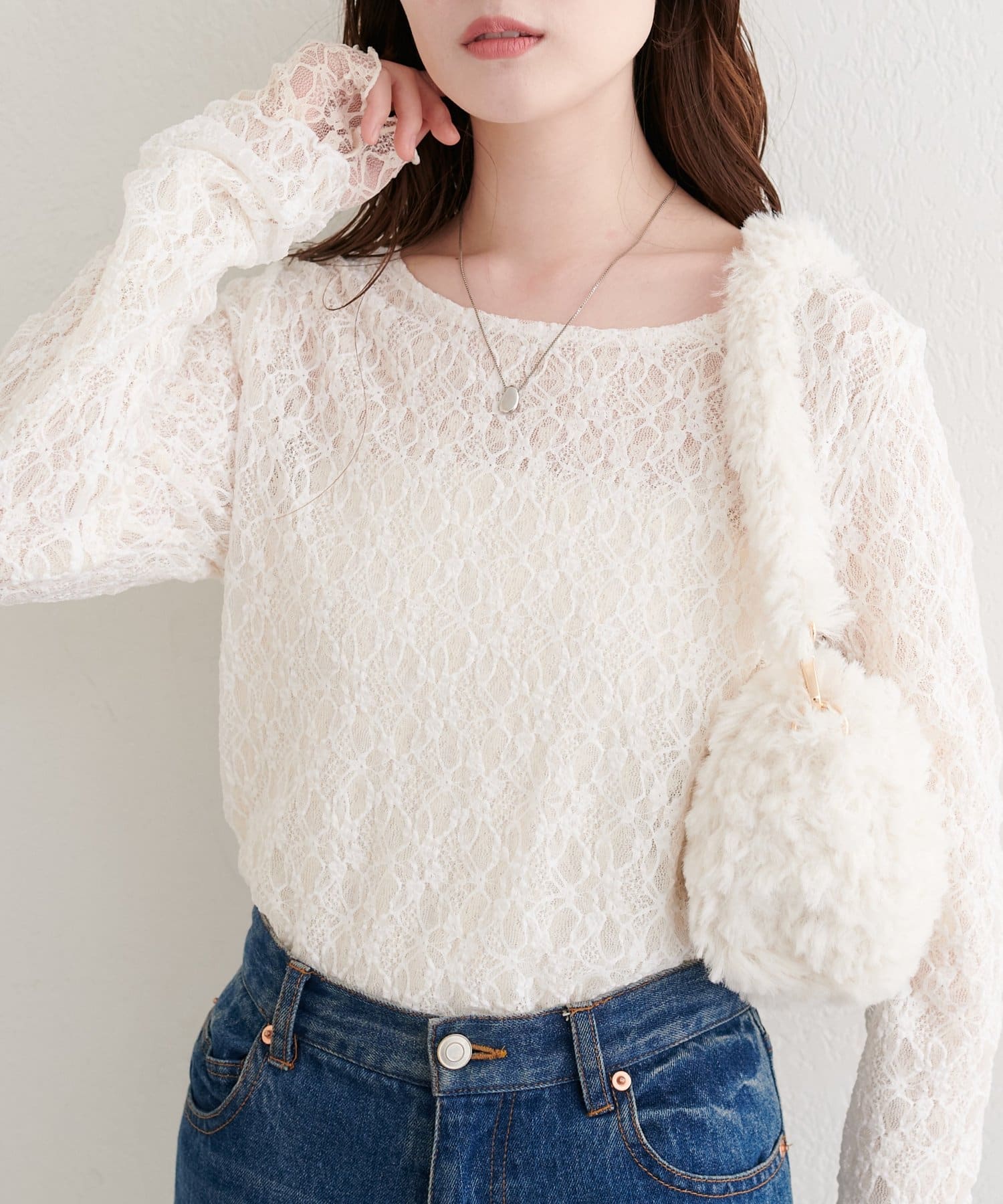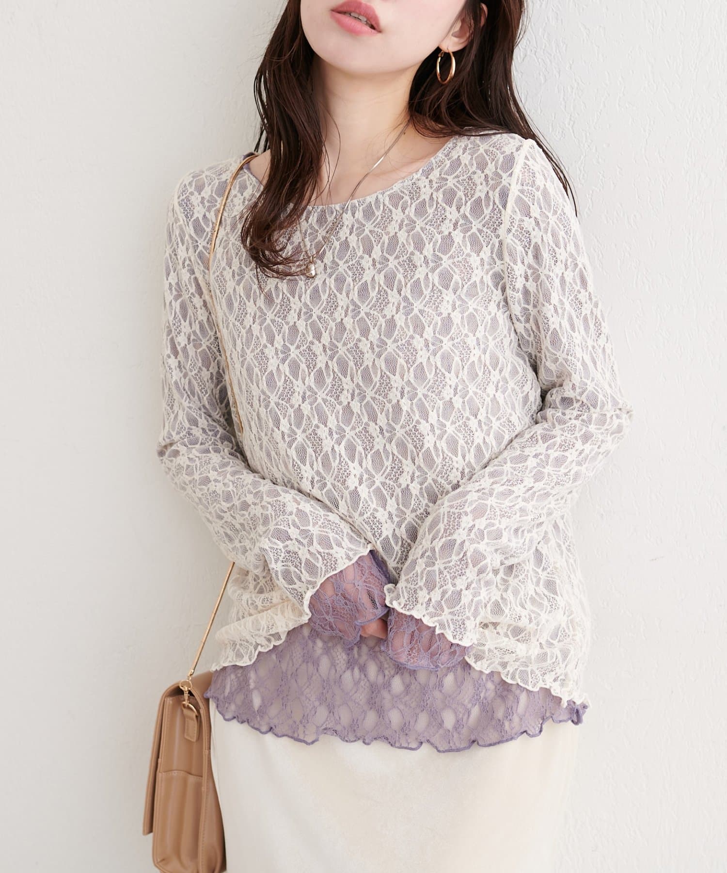 上品な肌見せが、女性らしさを引き立てます。袖口のさりげないレース使いもポイント。