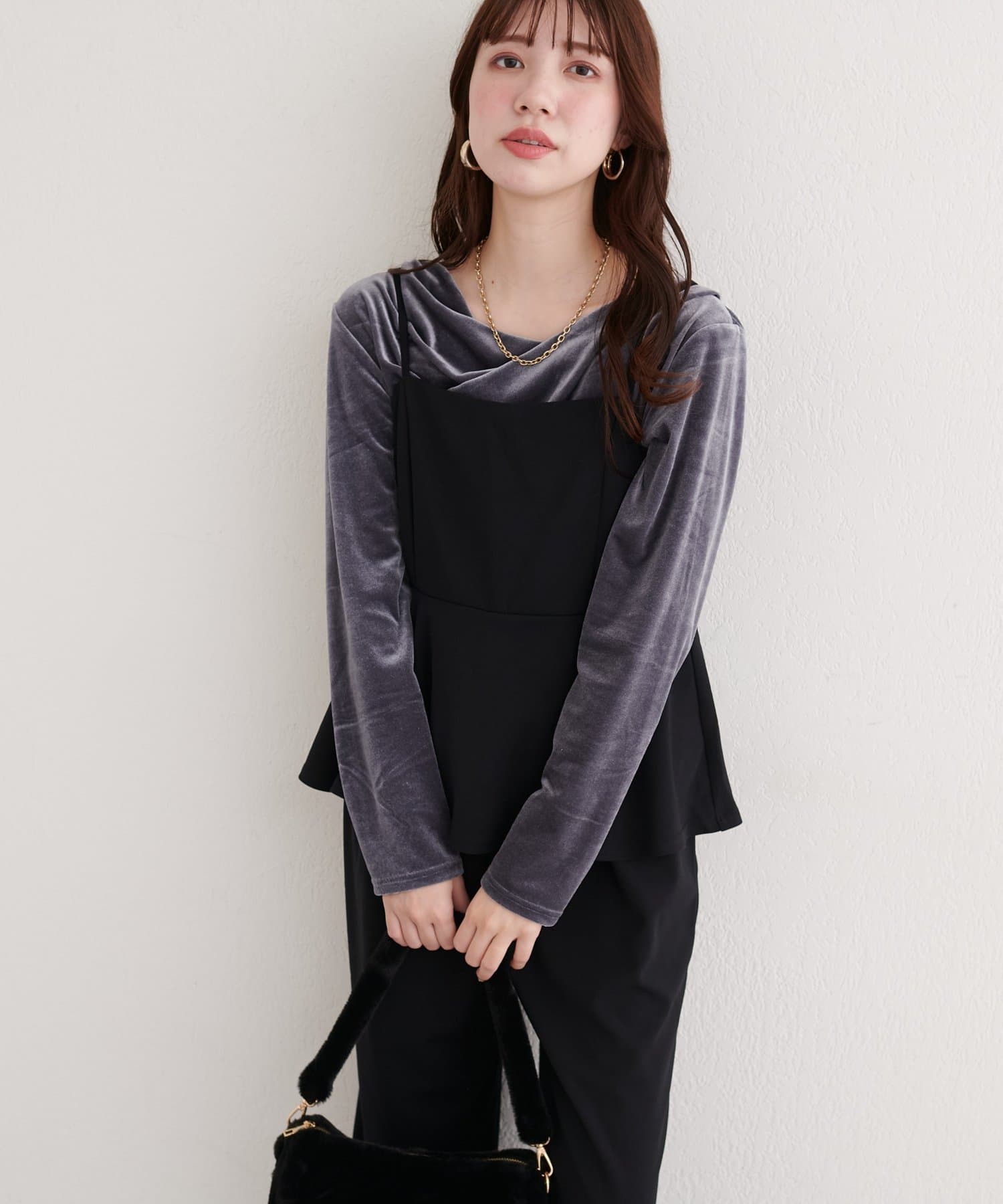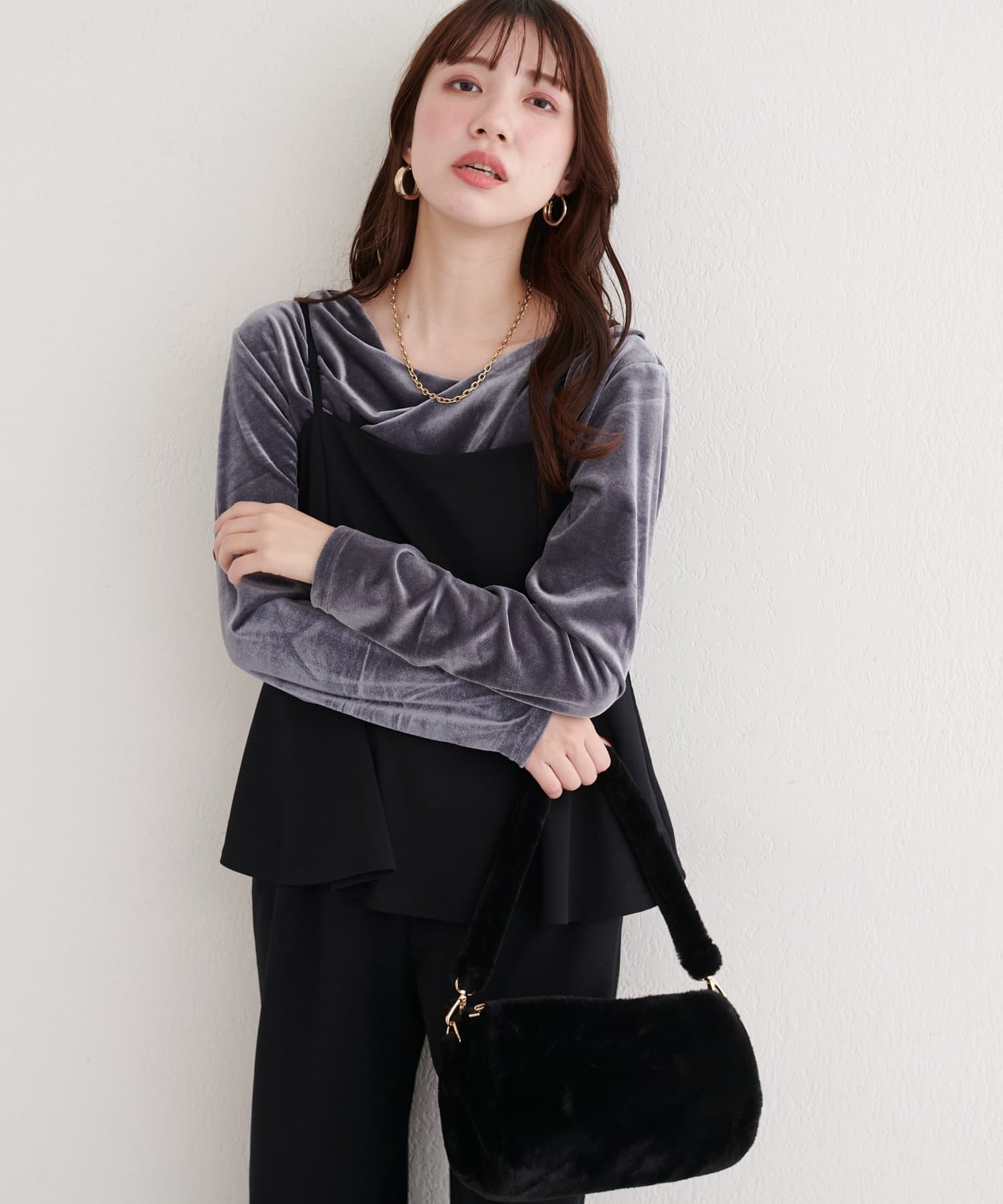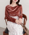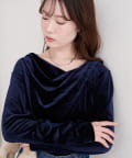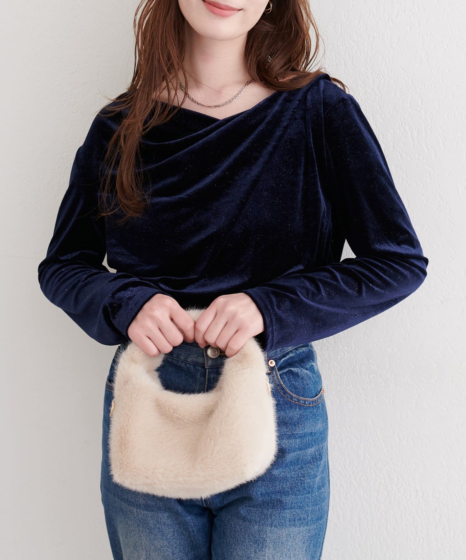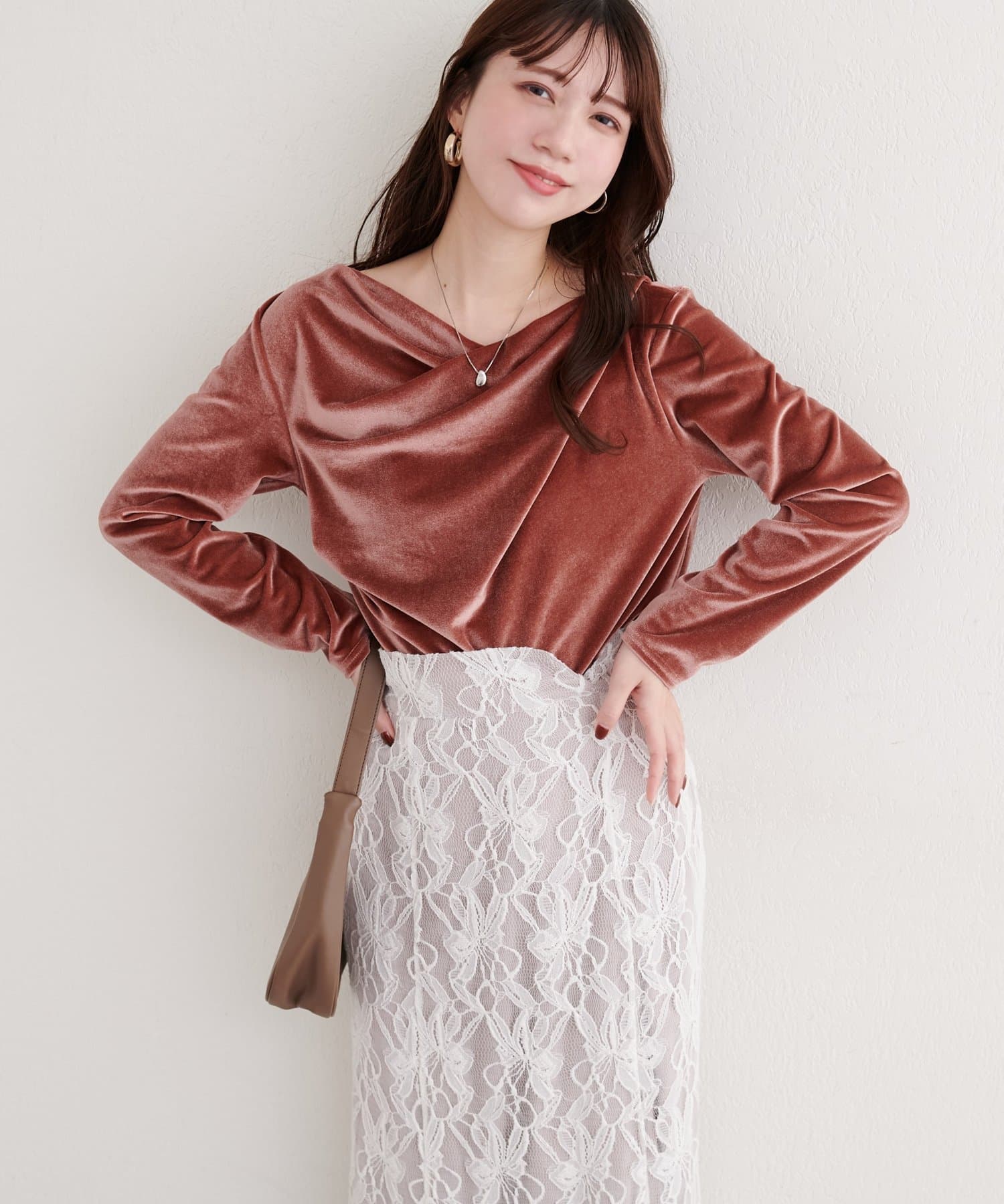 長めのスリーブは、手首を華奢に見せる効果も。繊細なラメとベロア生地の光沢感で高見え感UP◎