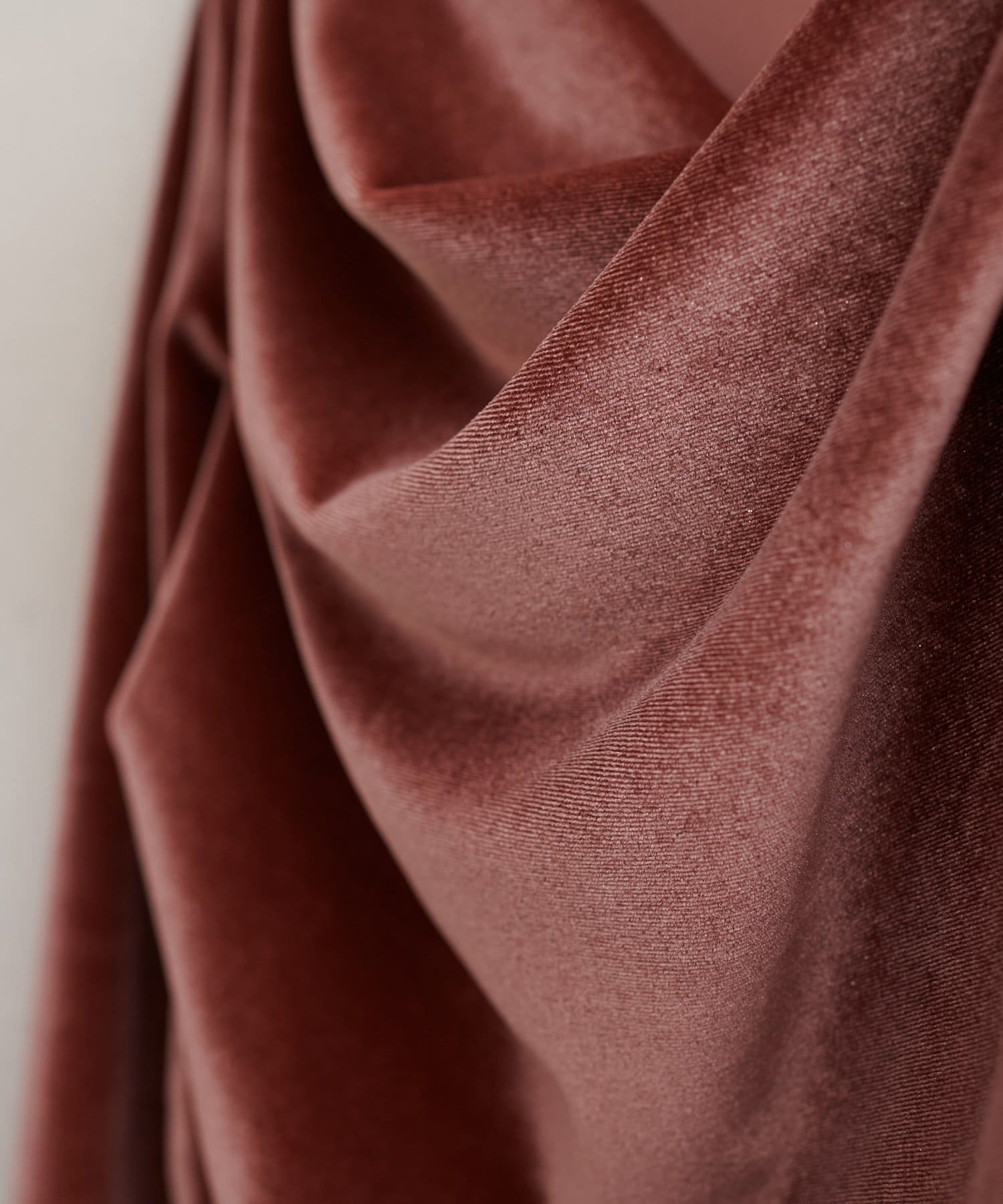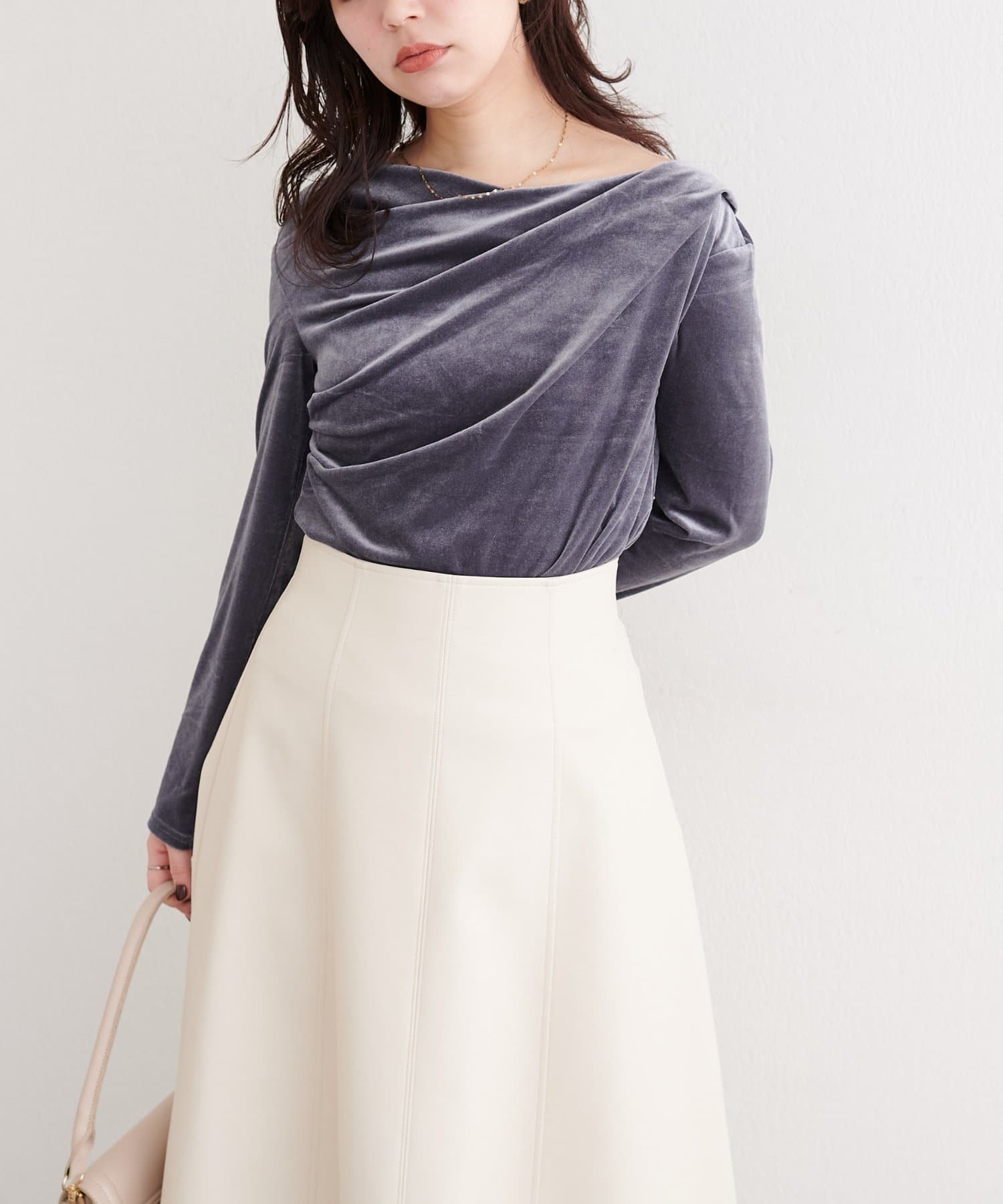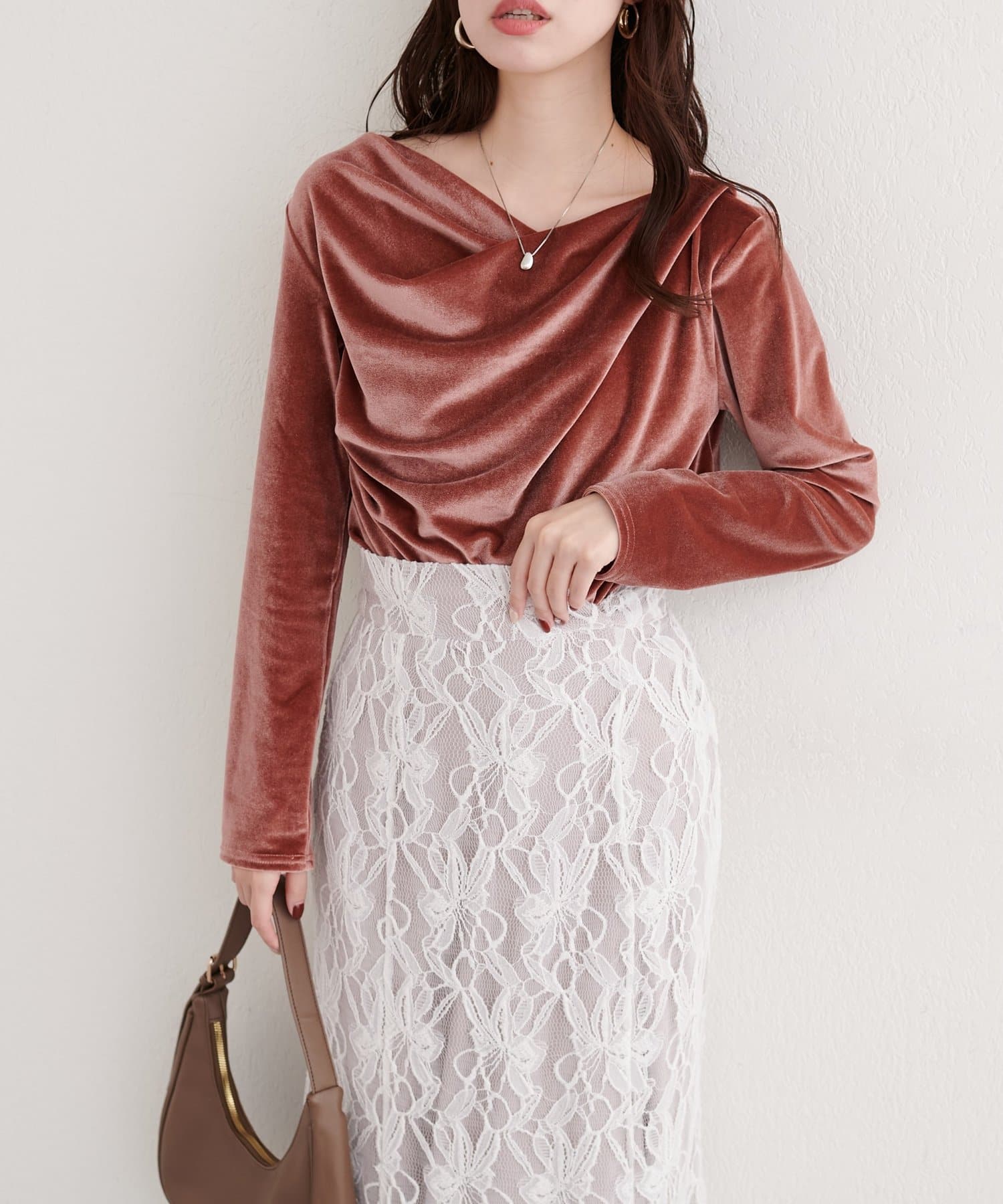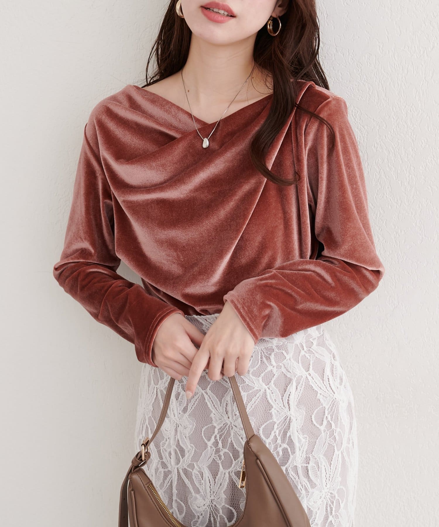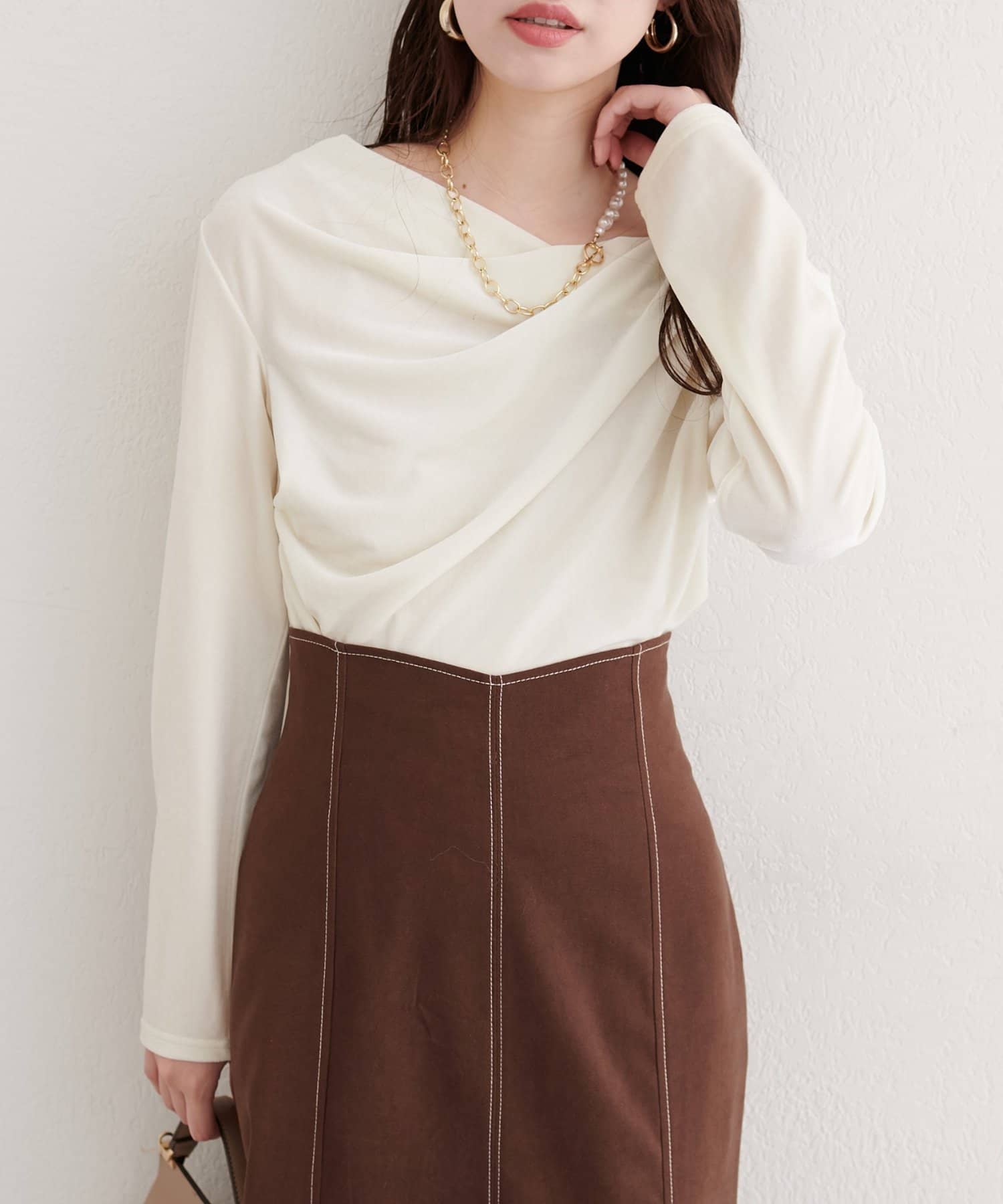 特徴的なドレープネックは、デコルテを美しく見せ、女性らしさを引き立てます。