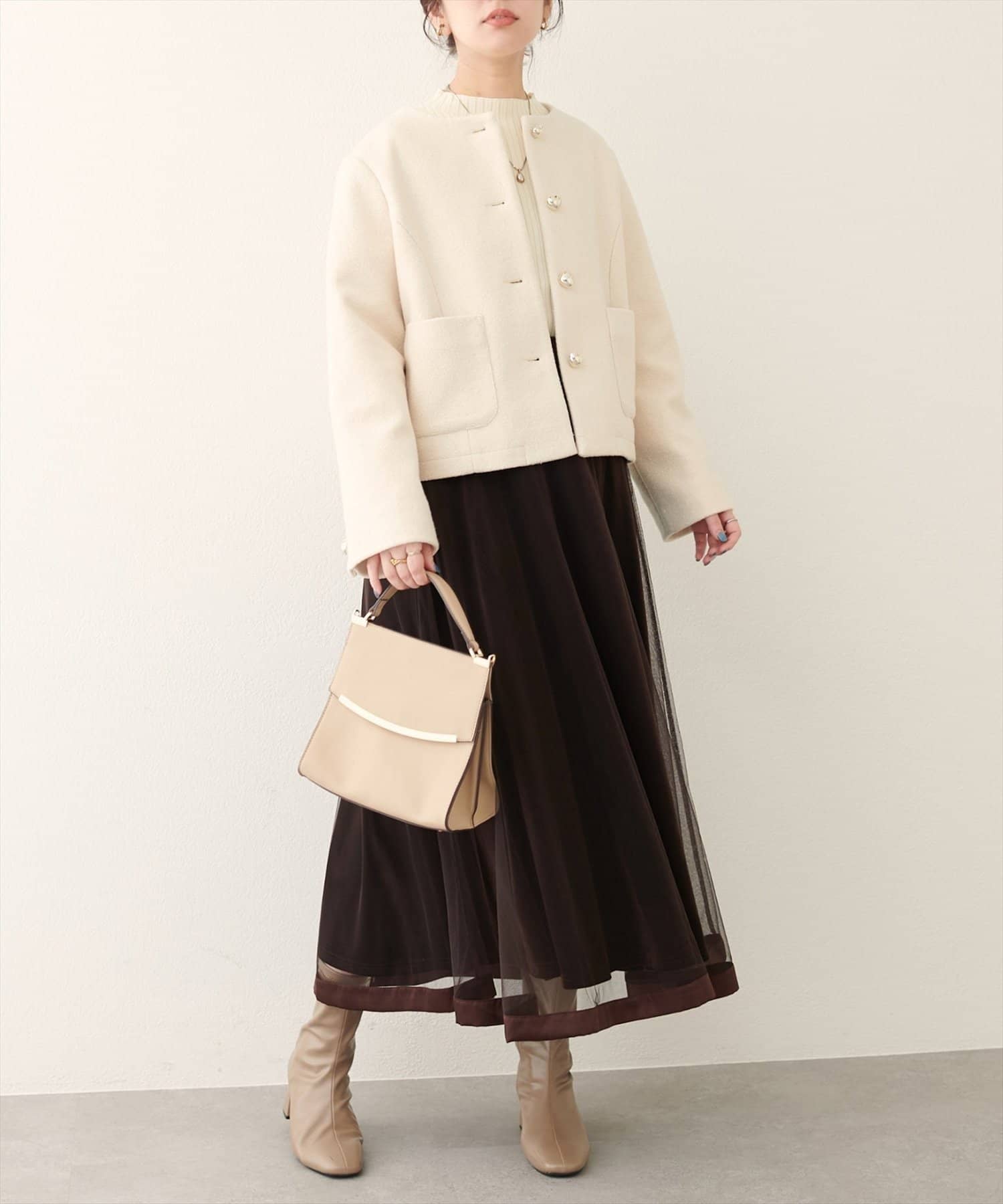 首元をすっきりと見せるノーカラーデザインは、タートルネックやマフラーとの相性も抜群。