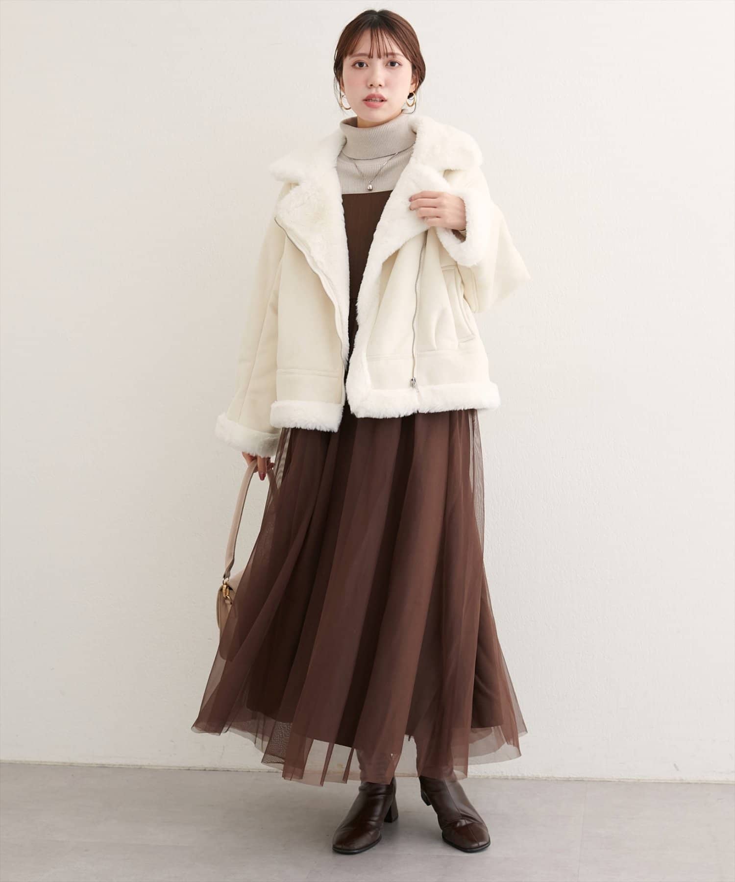ワンピースやスカートと合わせてフェミニンに着こなすのもおすすめです。
