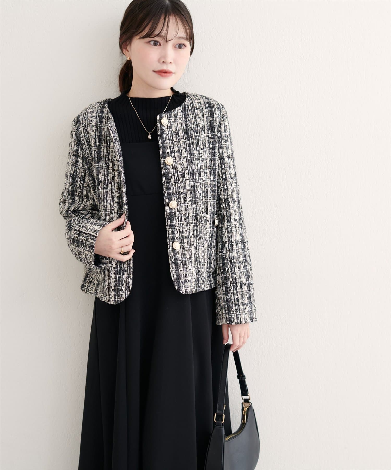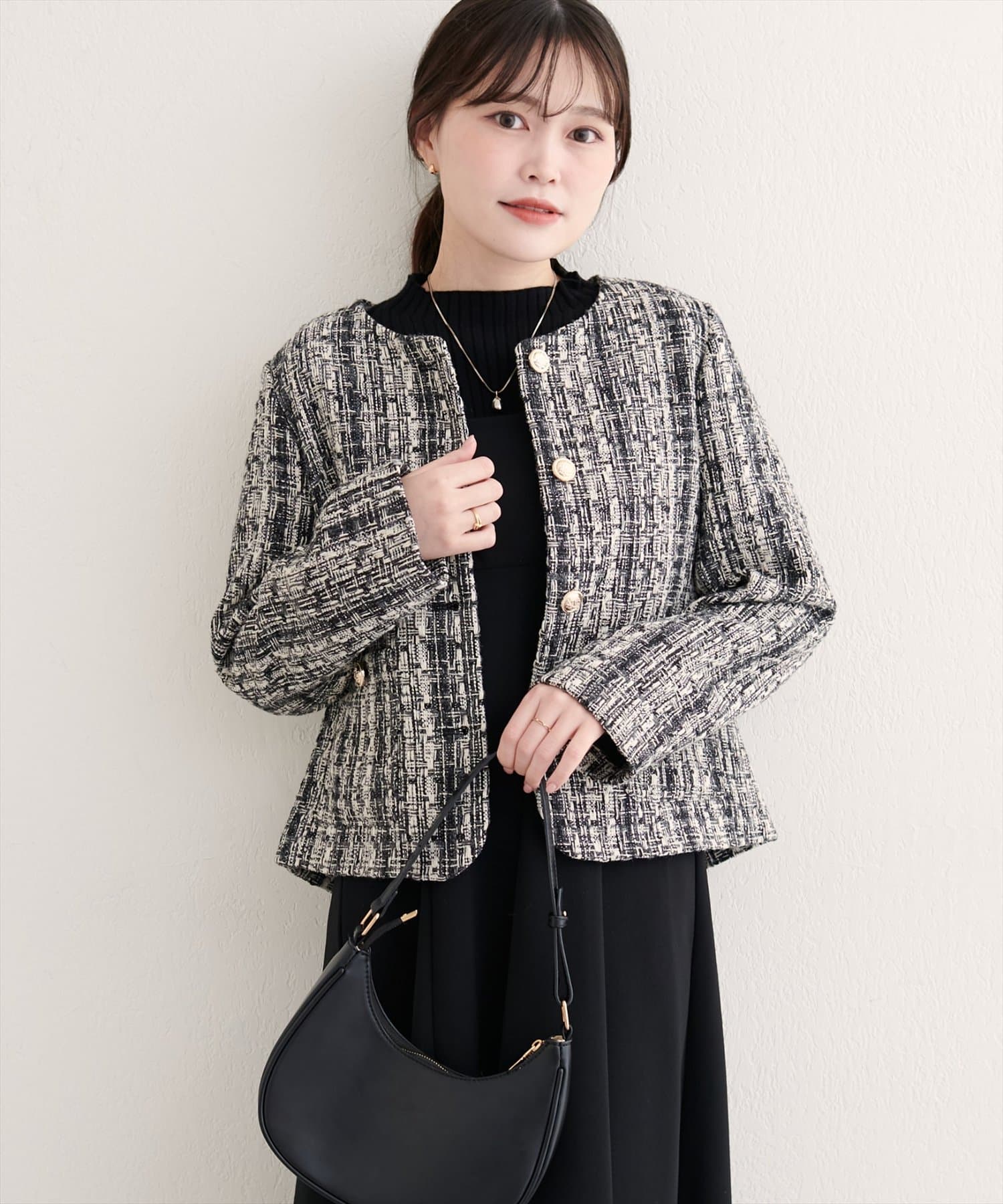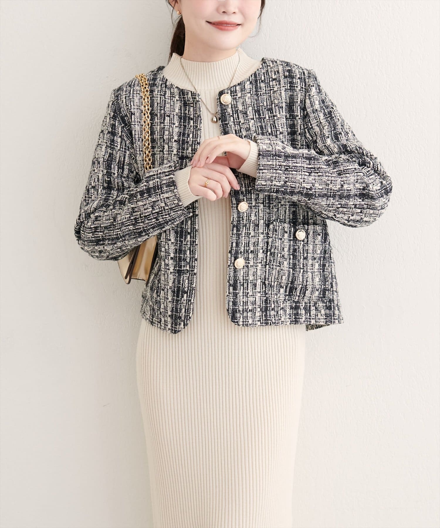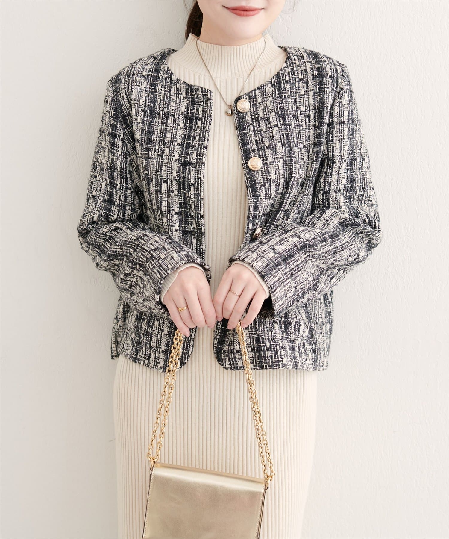 きちんと感とこなれ感を両立する、MIXツイードノーカラージャケット。