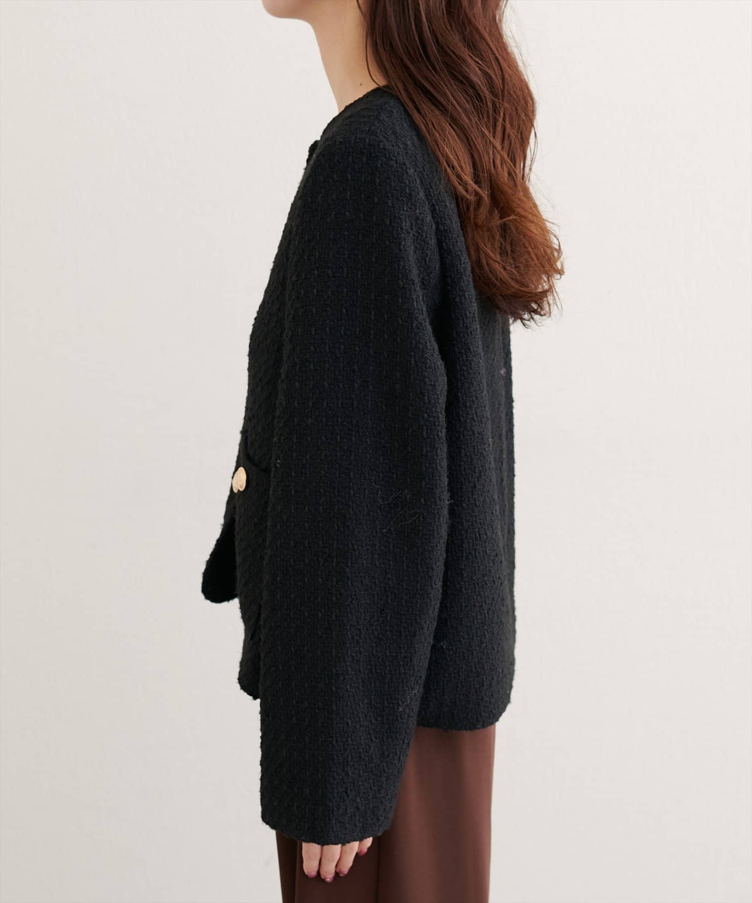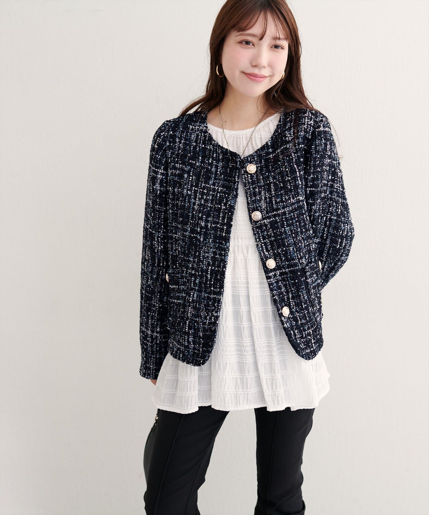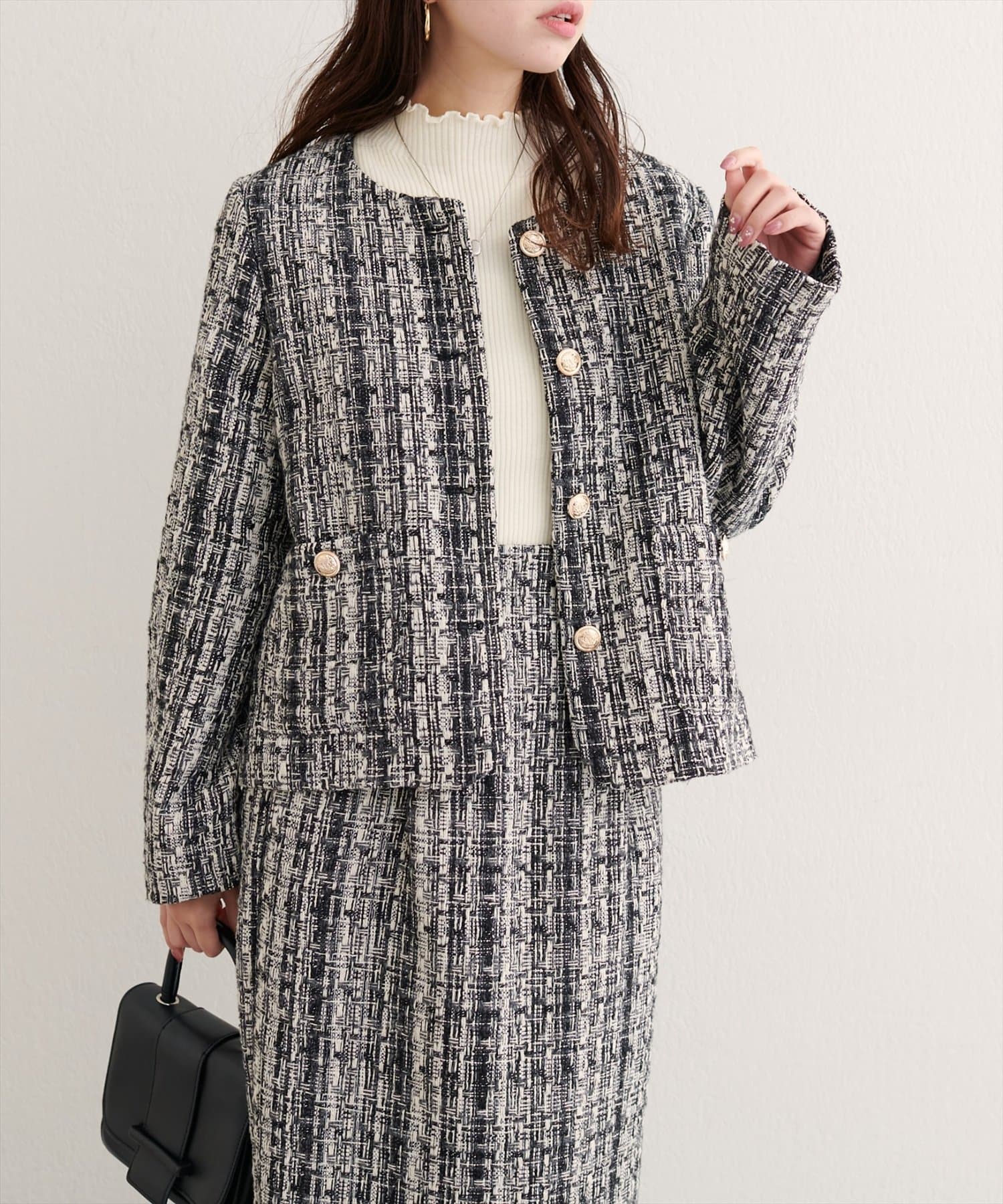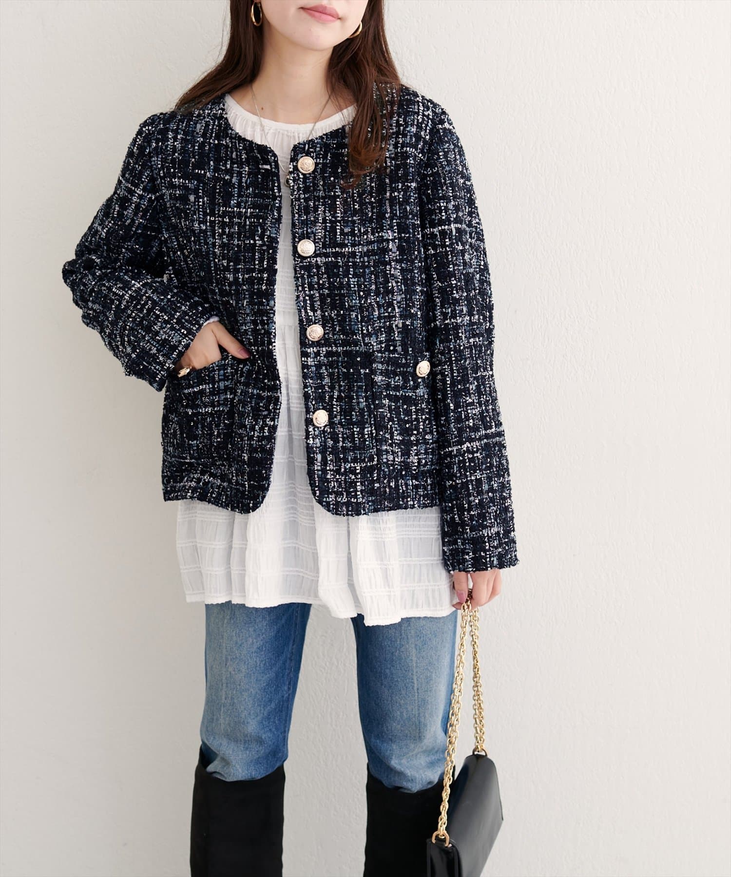 きちんと感とこなれ感を両立する、MIXツイードノーカラージャケット。