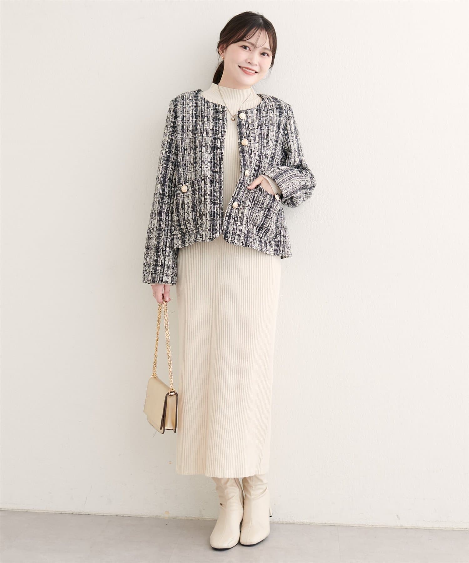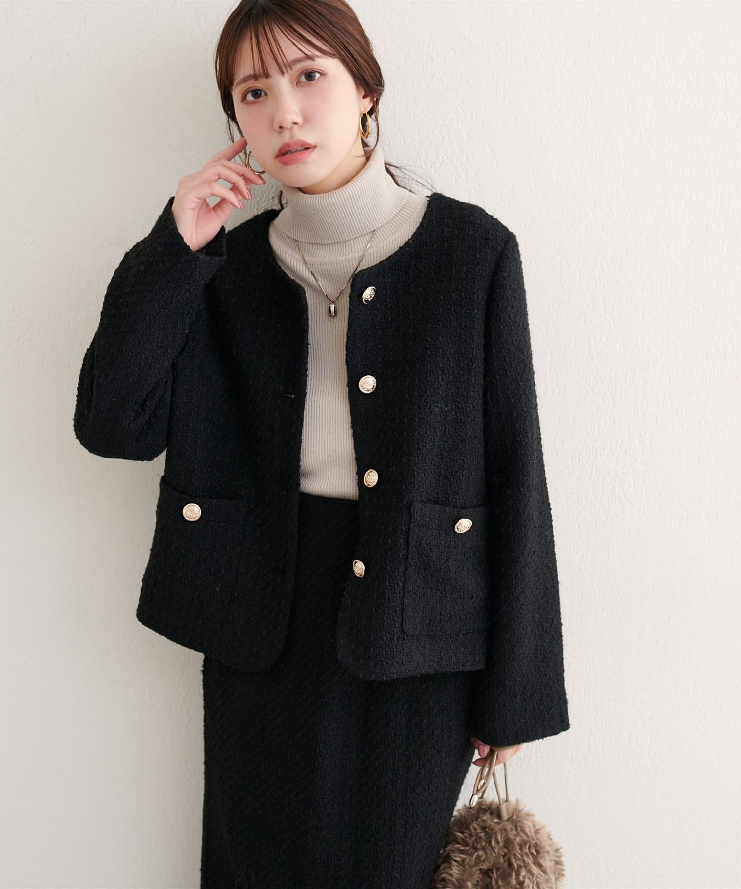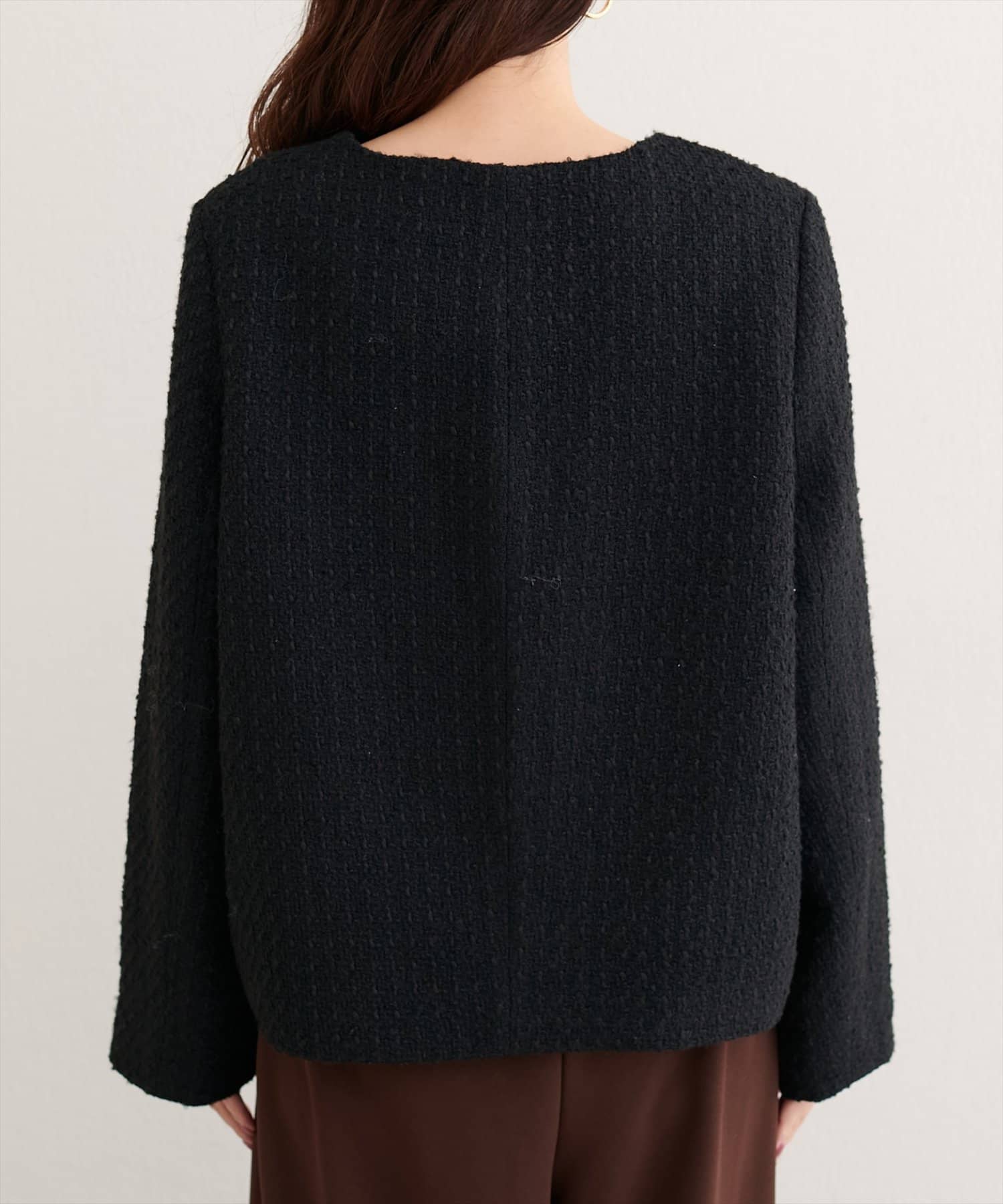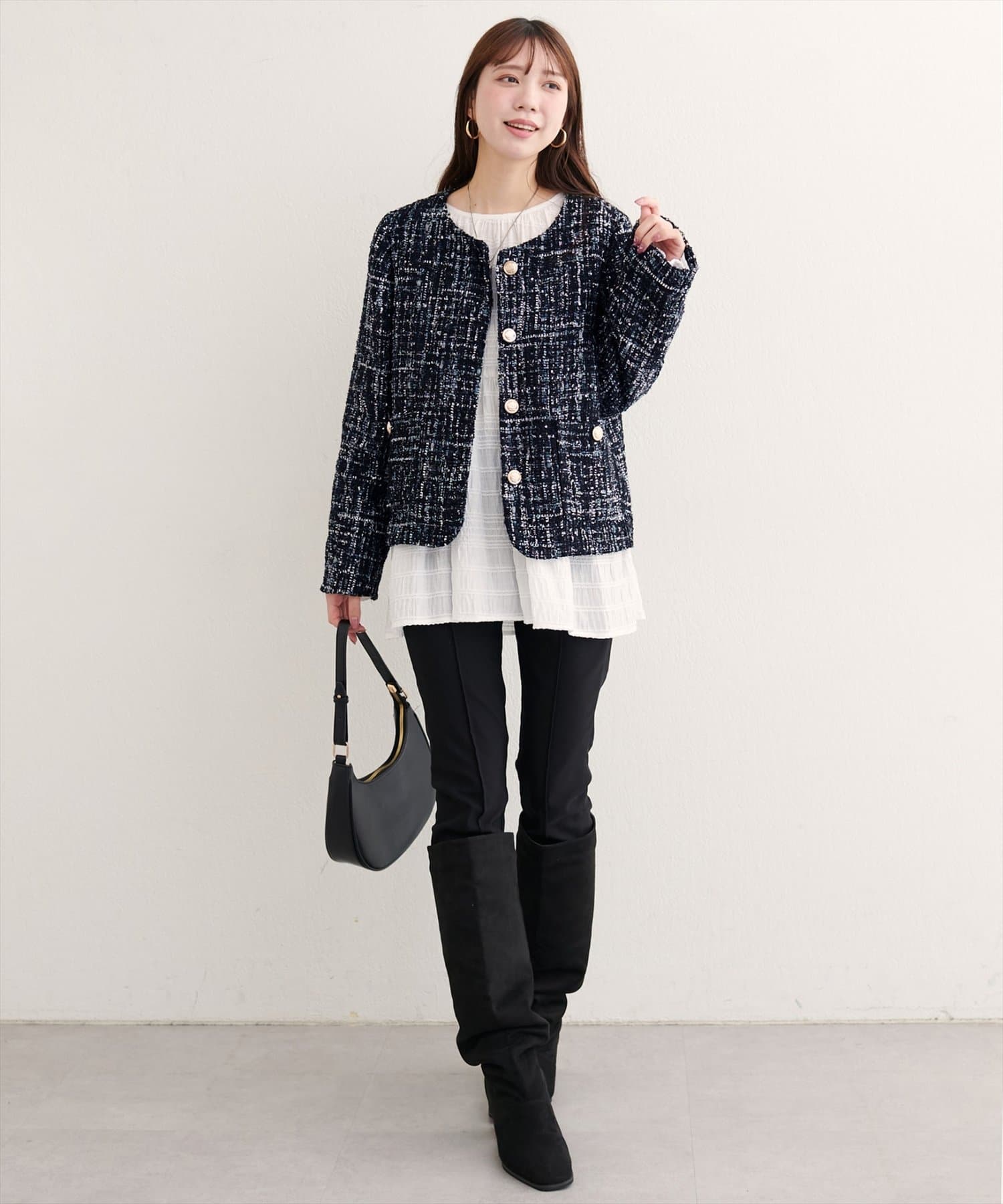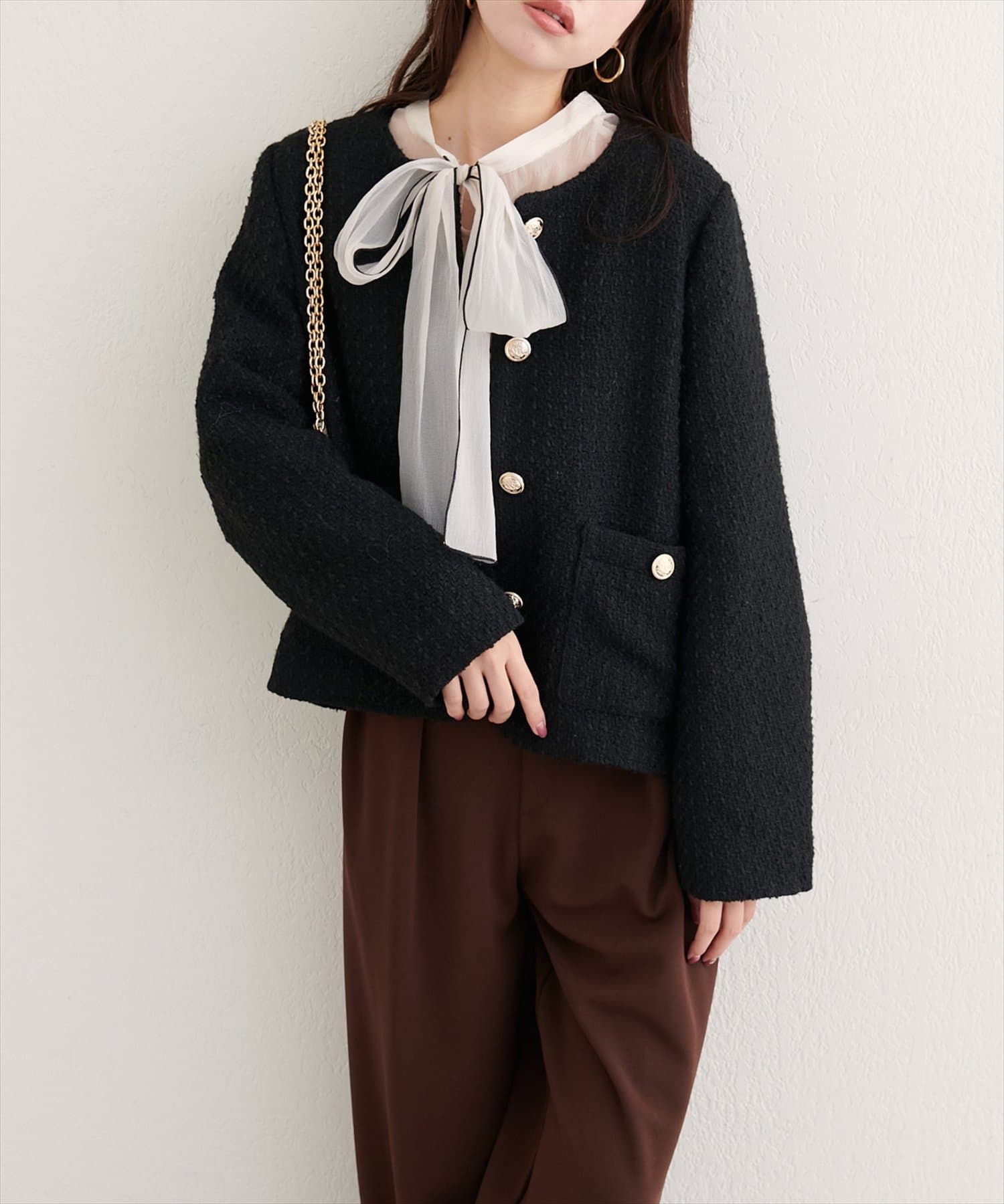 きちんと感とこなれ感を両立する、MIXツイードノーカラージャケット。