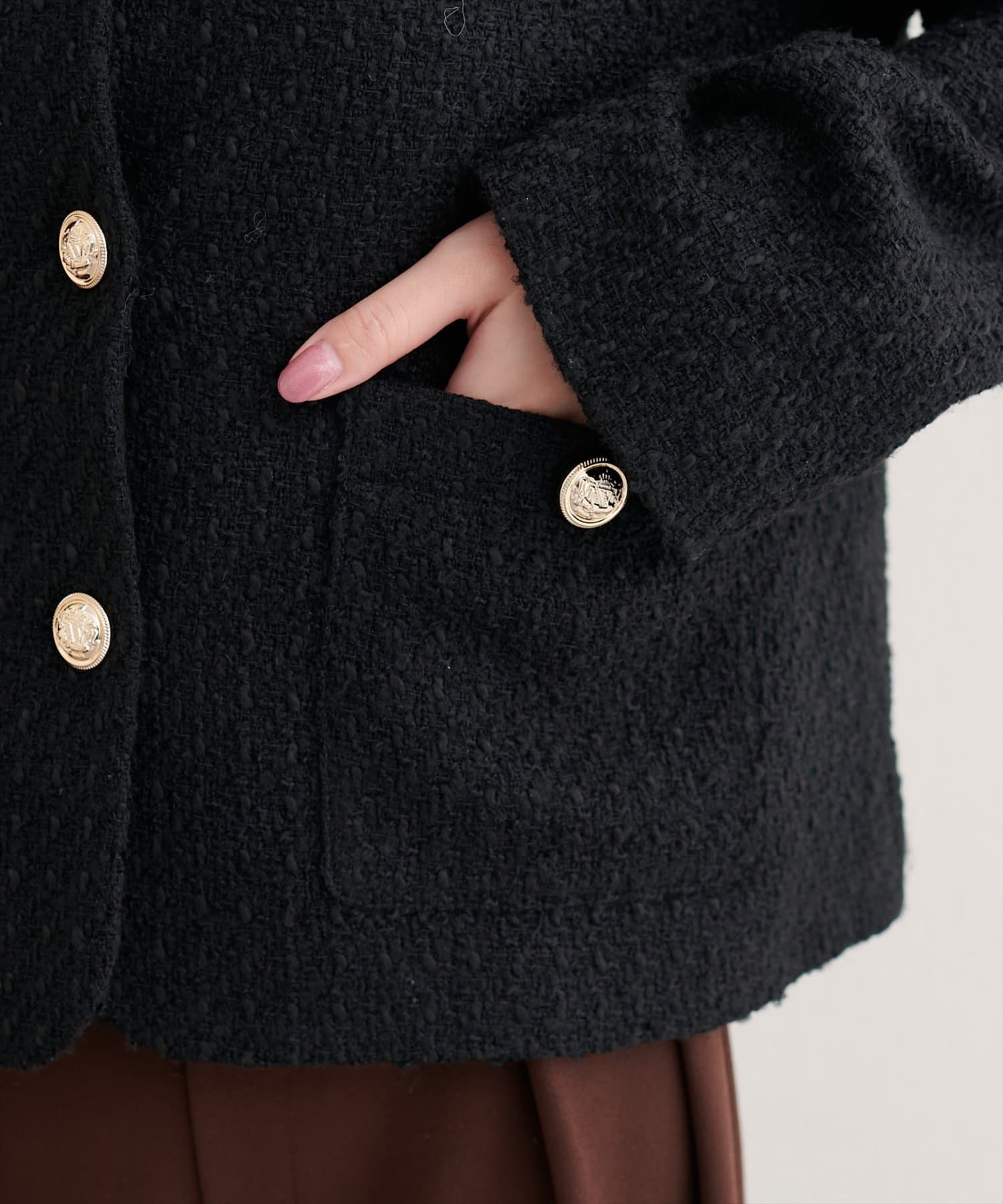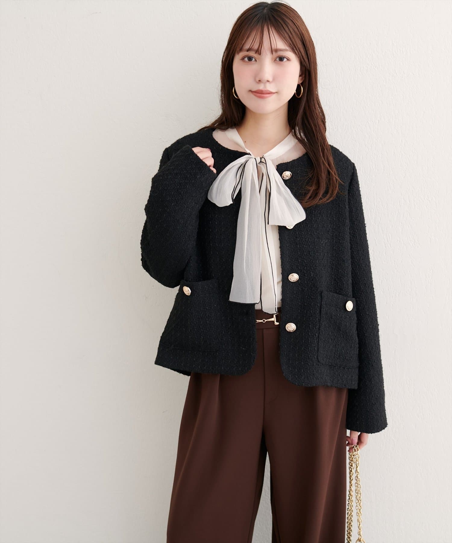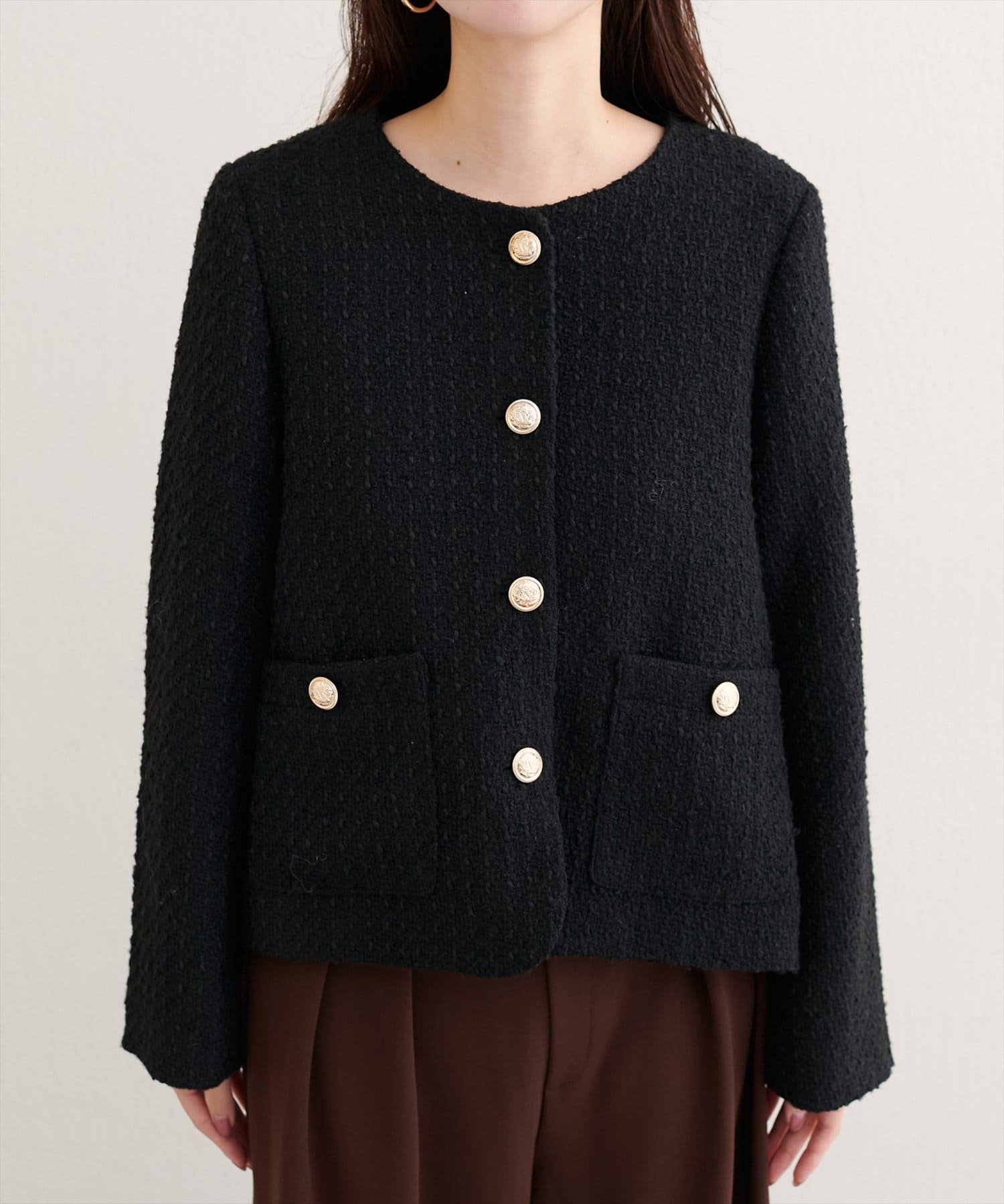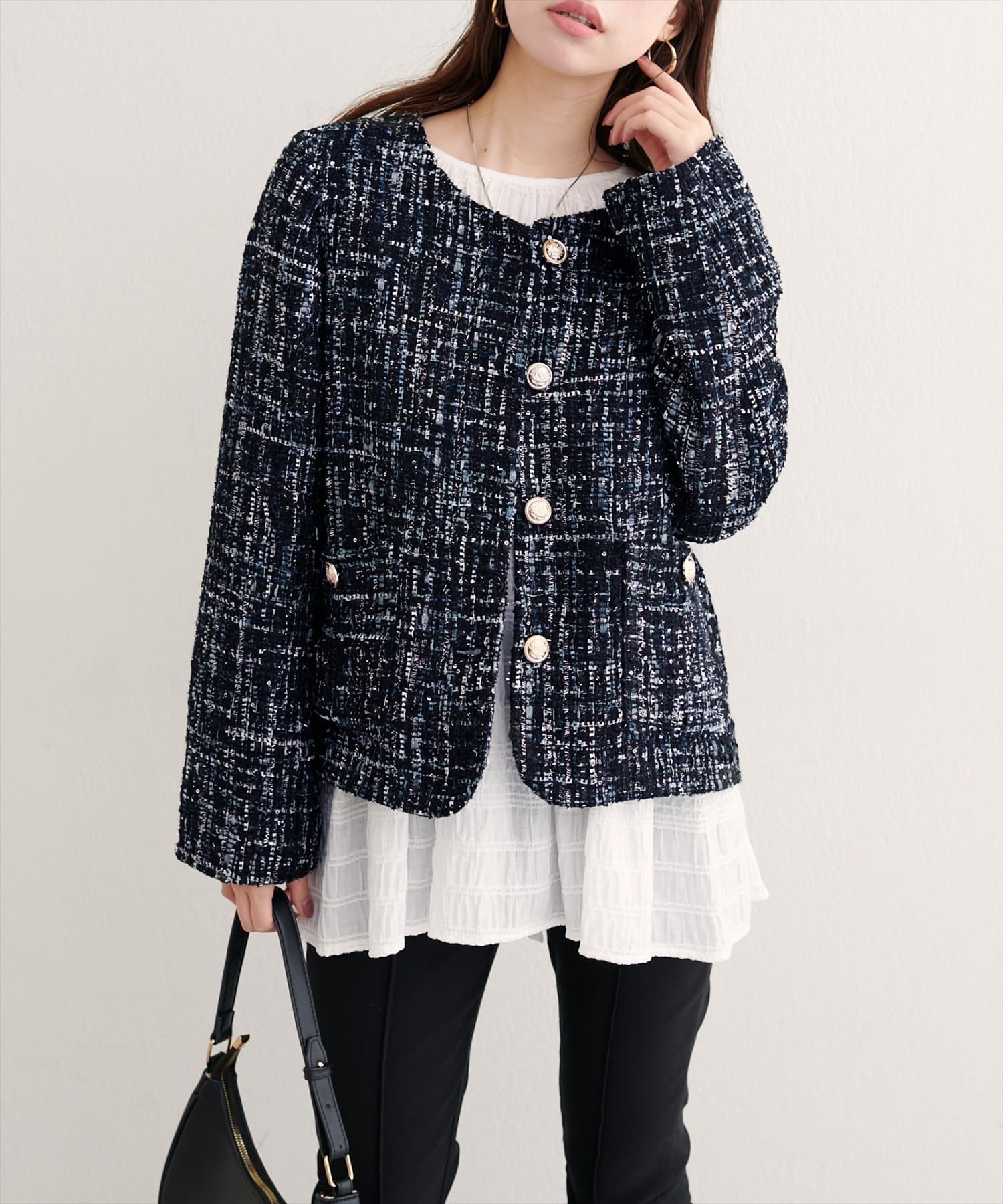 きちんと感とこなれ感を両立する、MIXツイードノーカラージャケット。