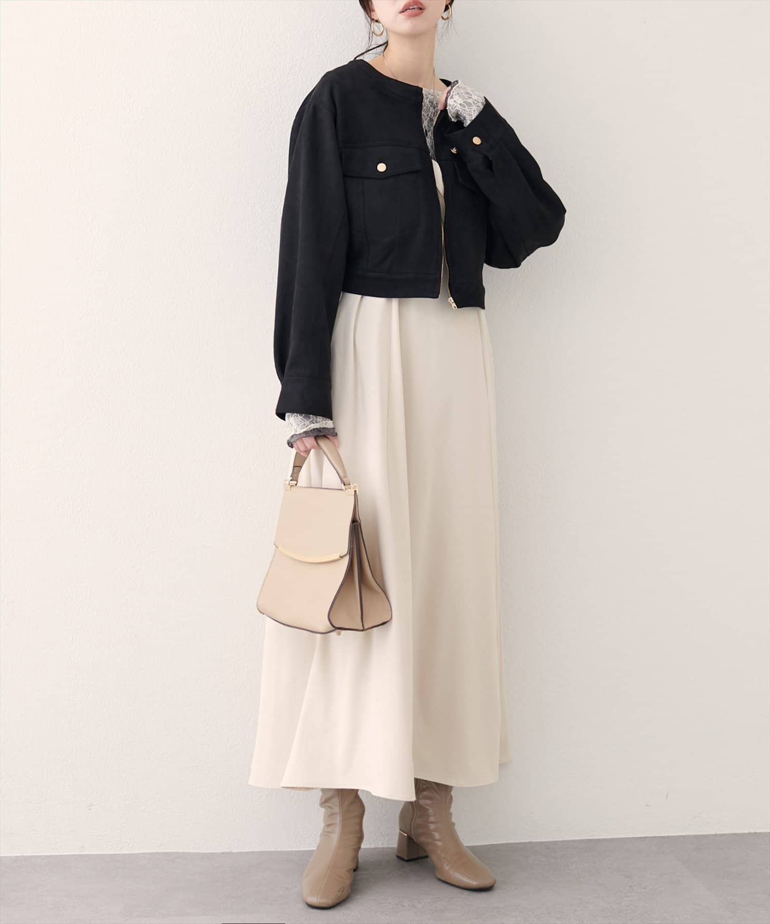 短めの丈感とコンパクトなシルエットが、スタイルアップ効果を発揮。