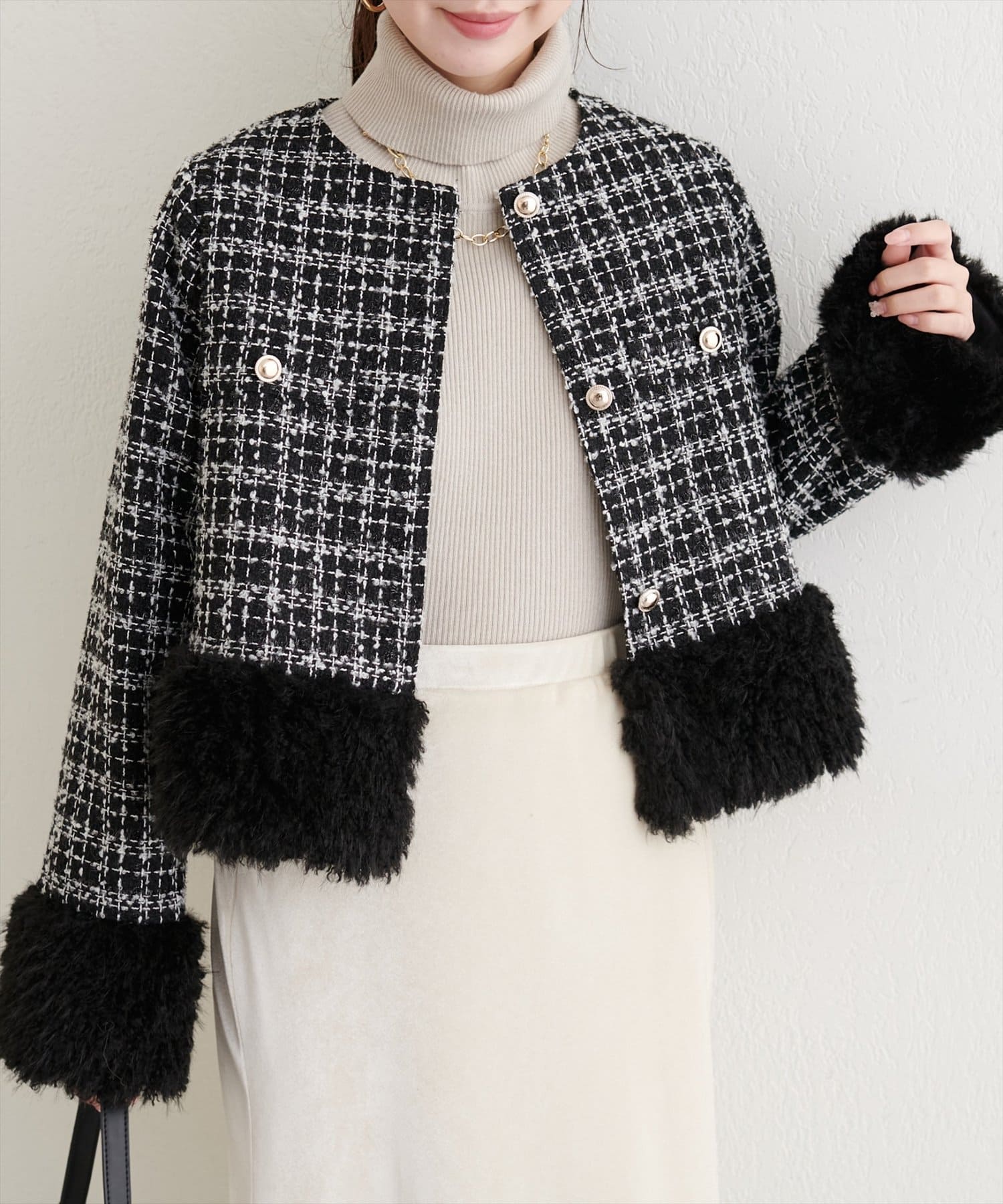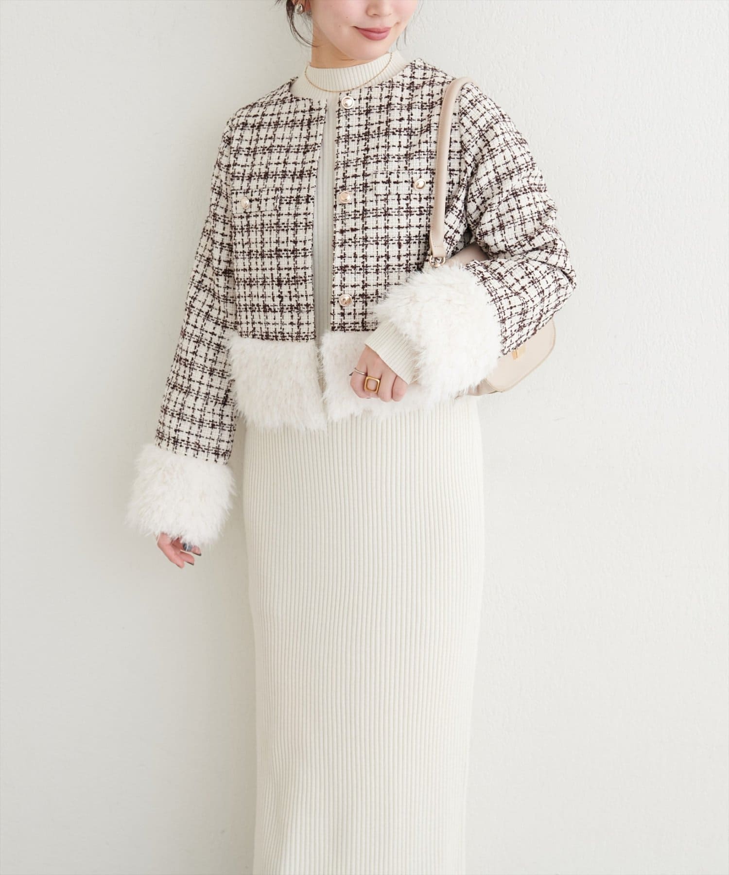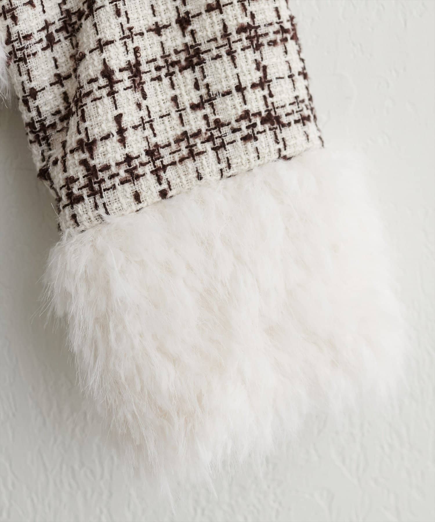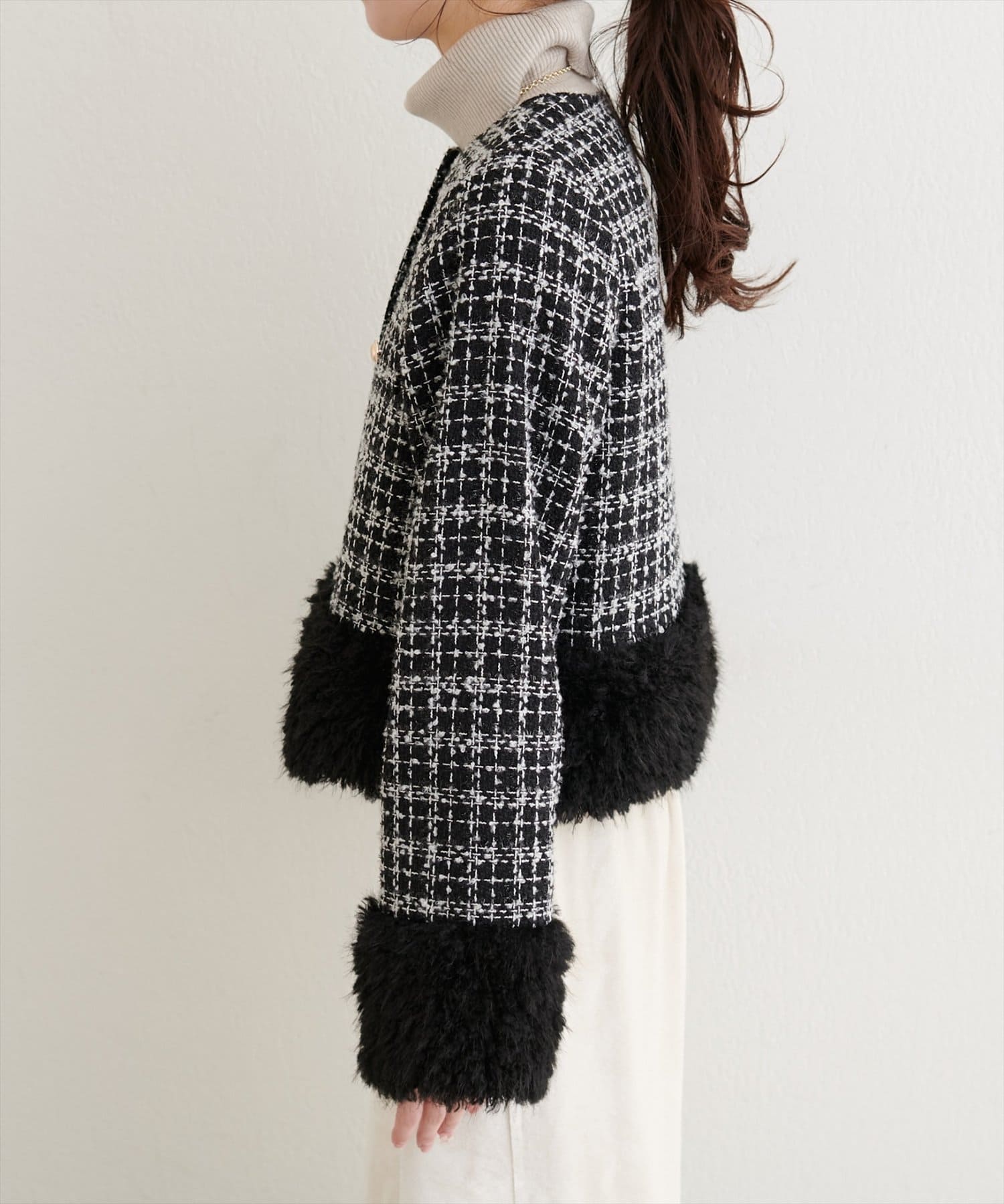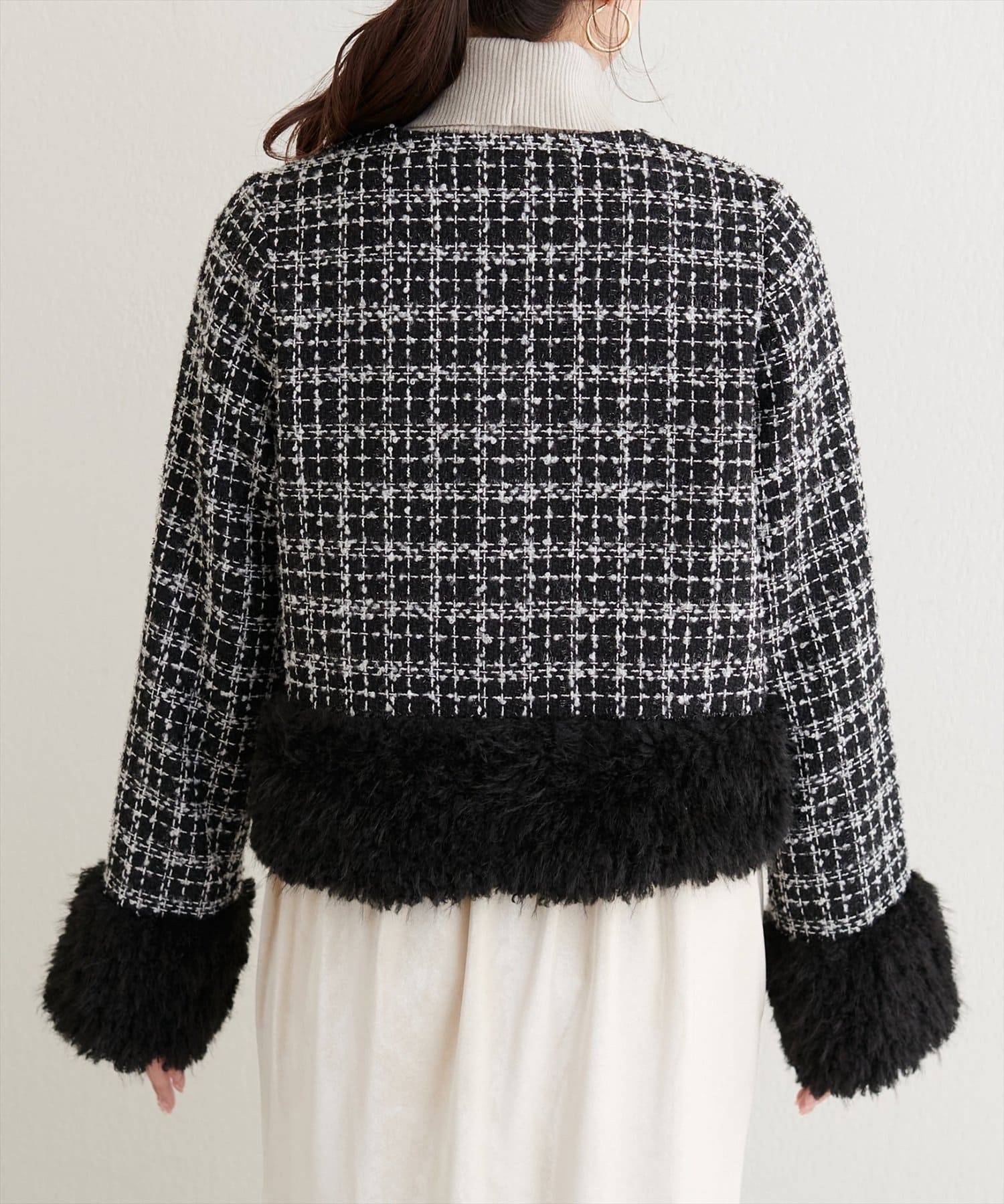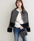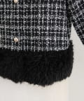 品の良いツイード生地に、裾と袖口にあしらわれたシャギーファーが、フェミニンで華やかな印象を与えます。