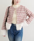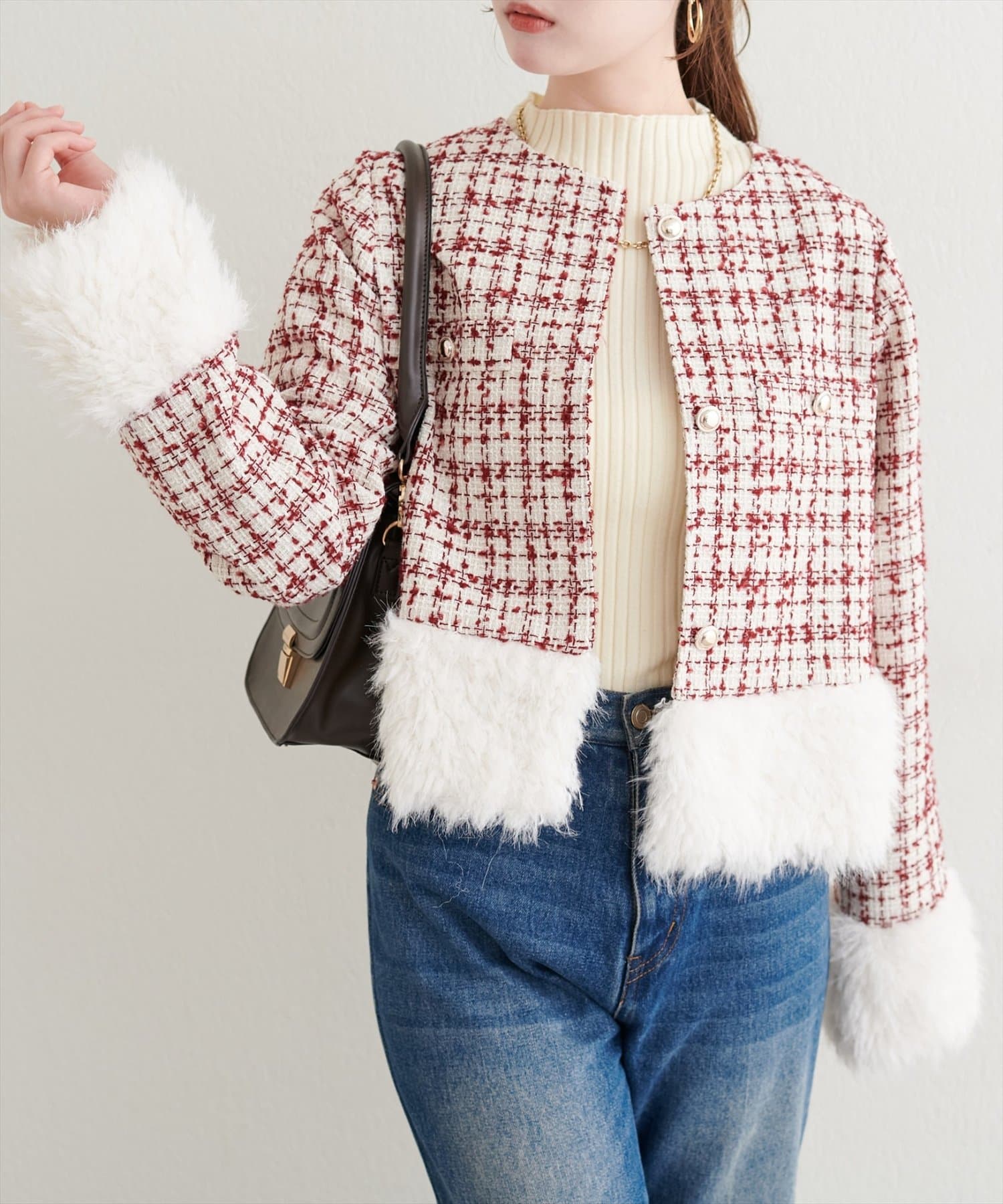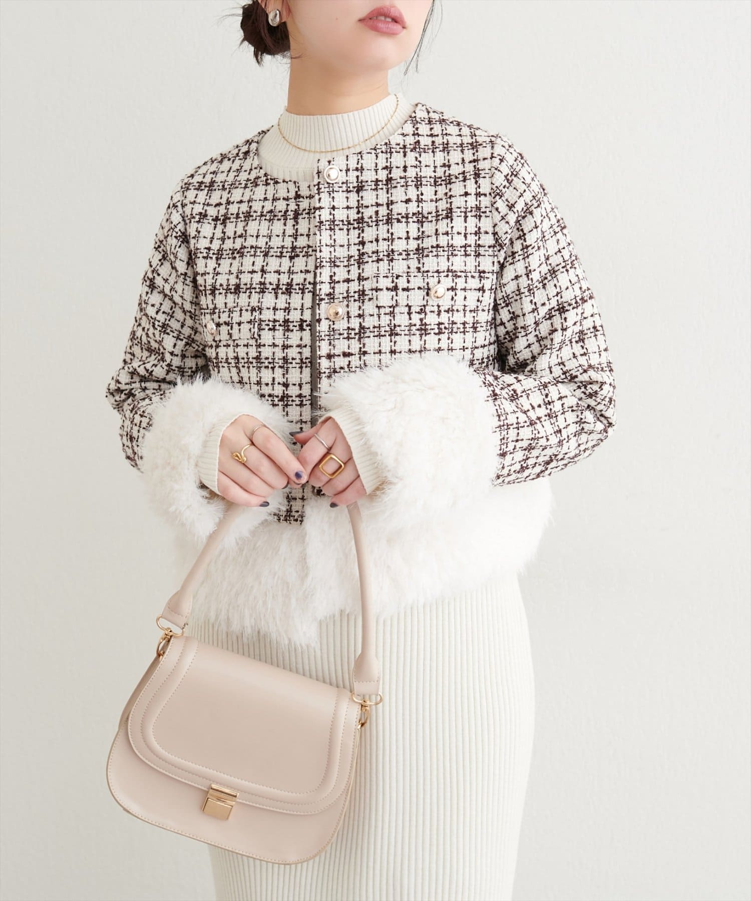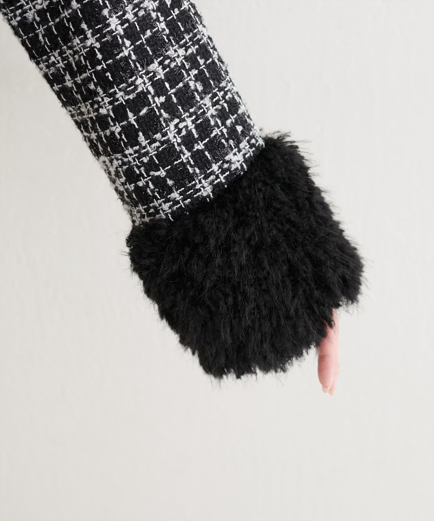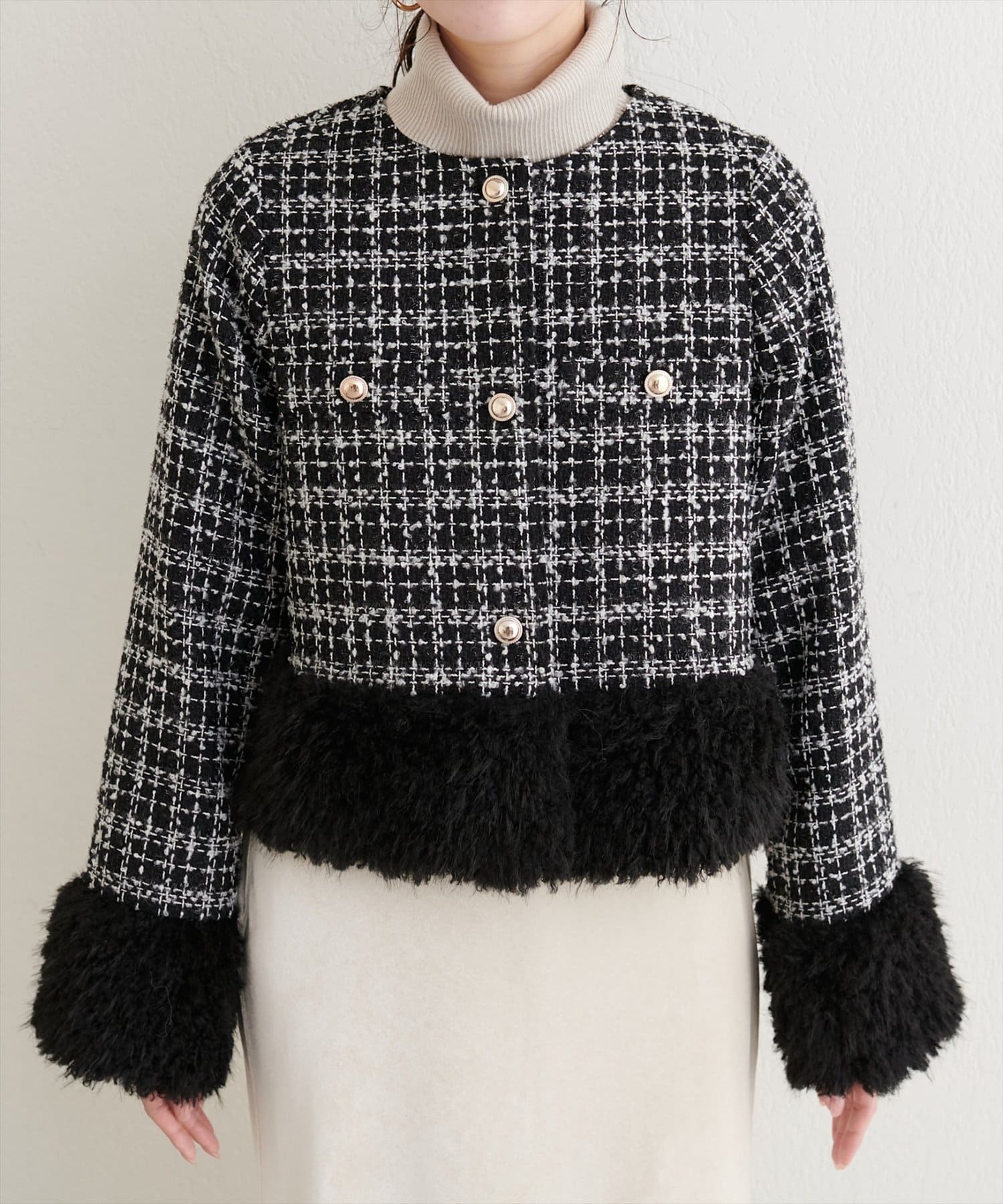 品の良いツイード生地に、裾と袖口にあしらわれたシャギーファーが、フェミニンで華やかな印象を与えます。